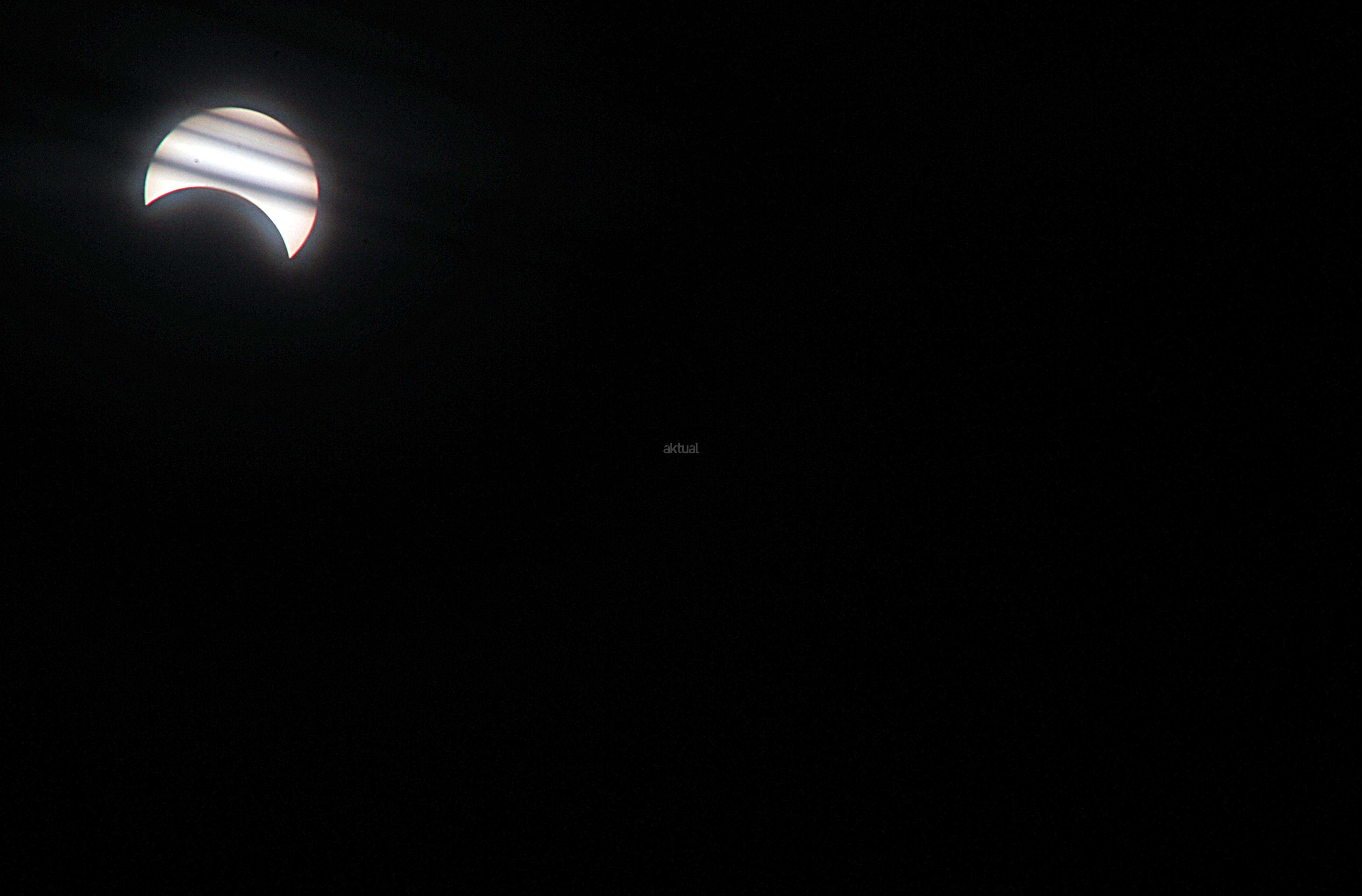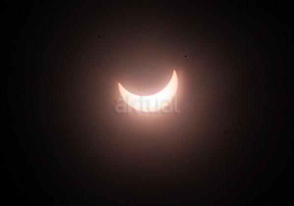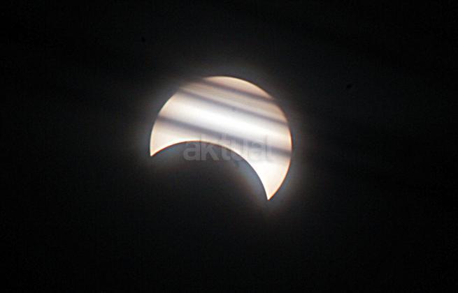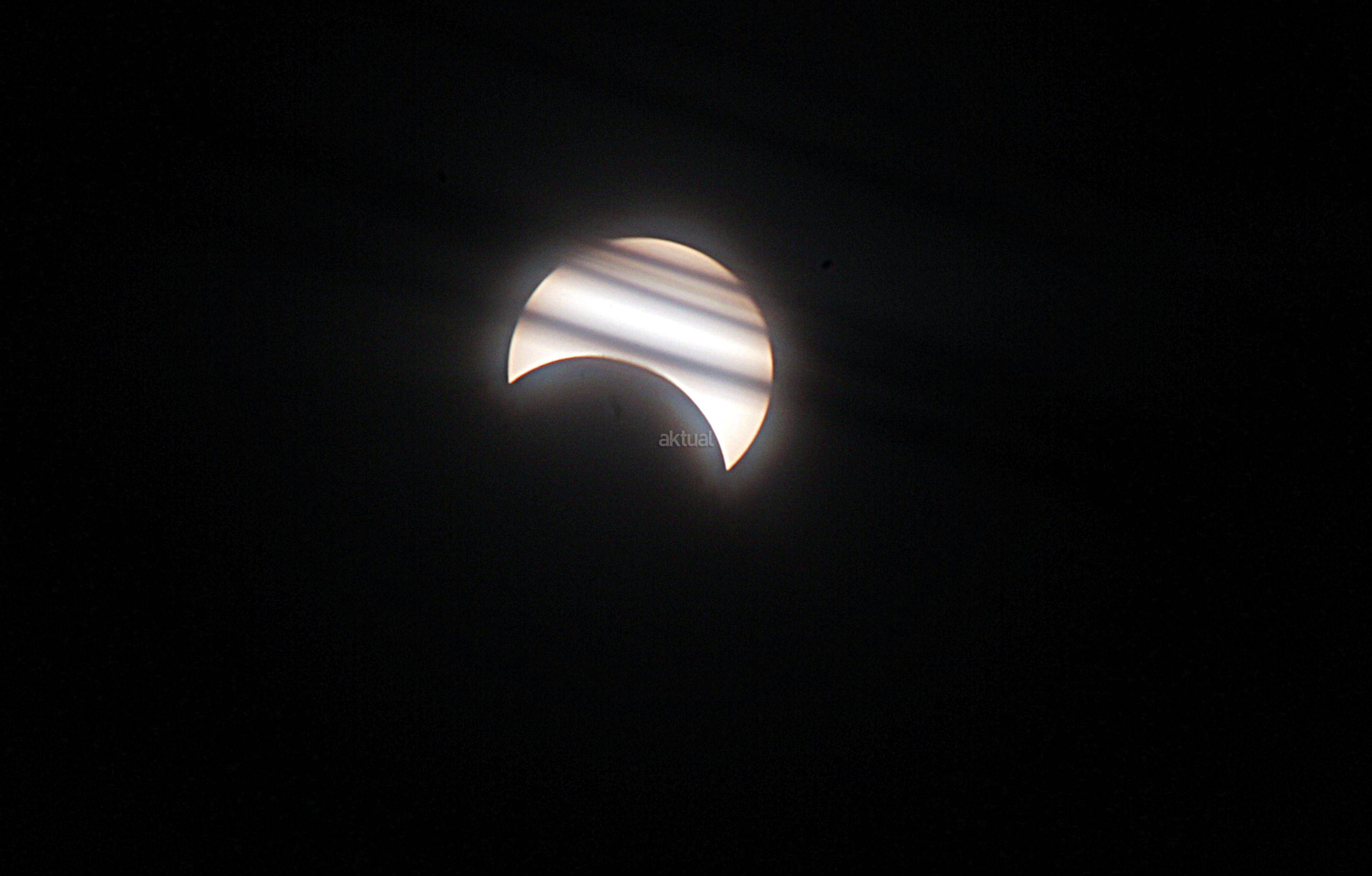 Puncak gerhana matahari terlihat di Kawasan Tebet, Jakarta Selatan, Rabu (9/3). Gerhana matahari total dapat terlihat dari sejumlah wilayah di Indonesia, namun di Jakarta terlihat sebagai gerhana matahari sebagian dengan fase umbra sekitar 76% selama sekitar 1,5 jam yang dimulai pukul 06.55 WIB. AKTUAL/TINO OKTAVIANO