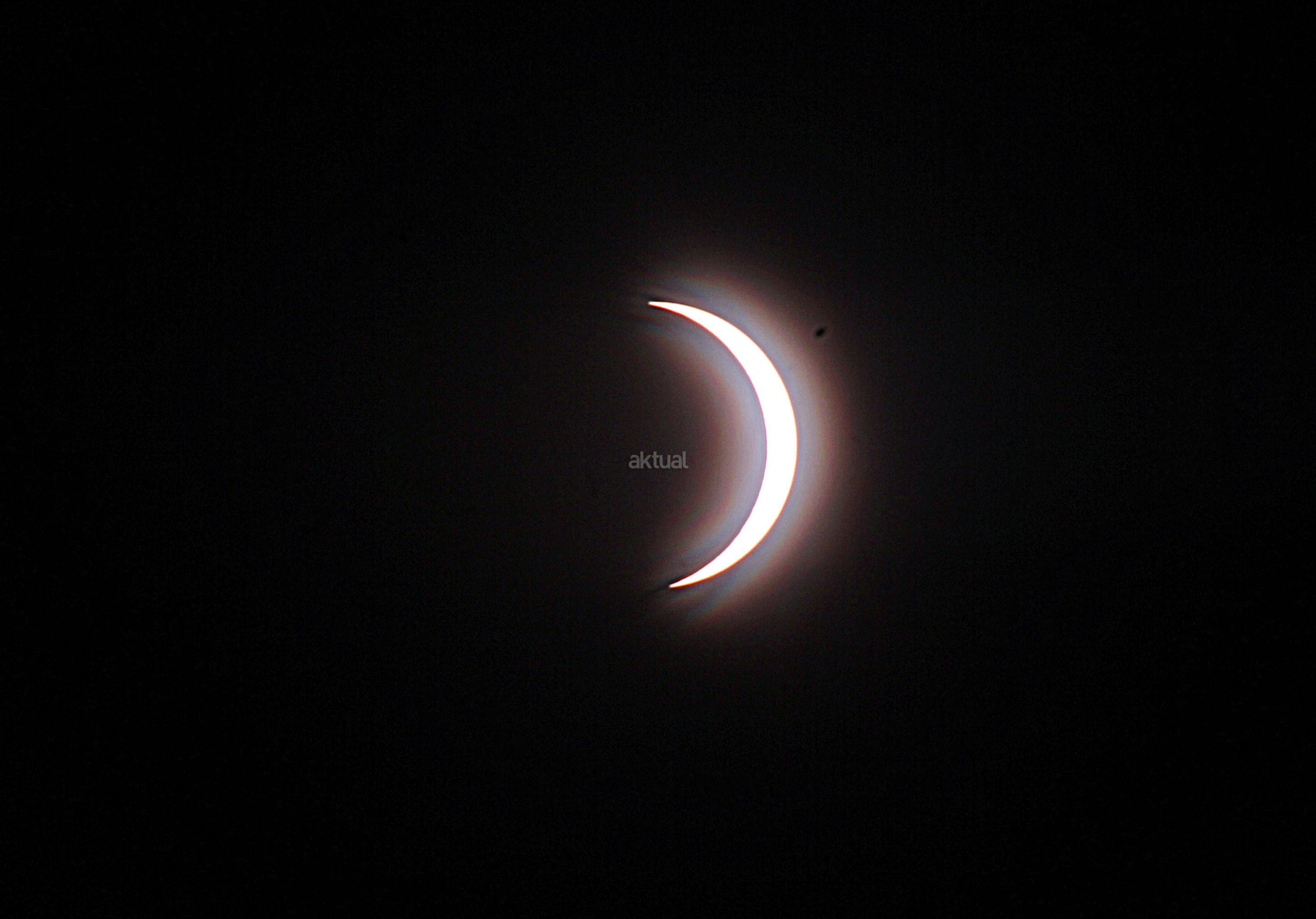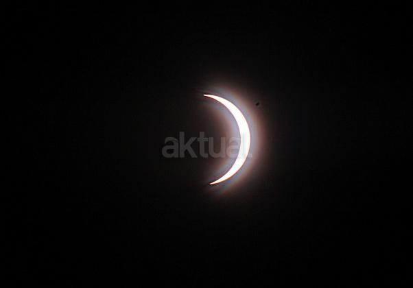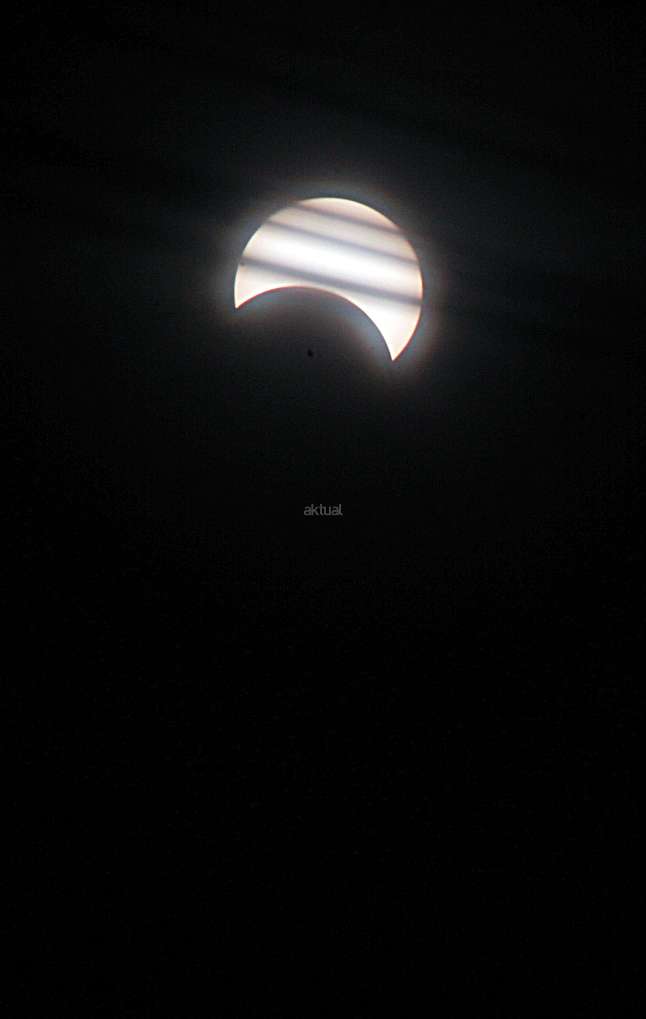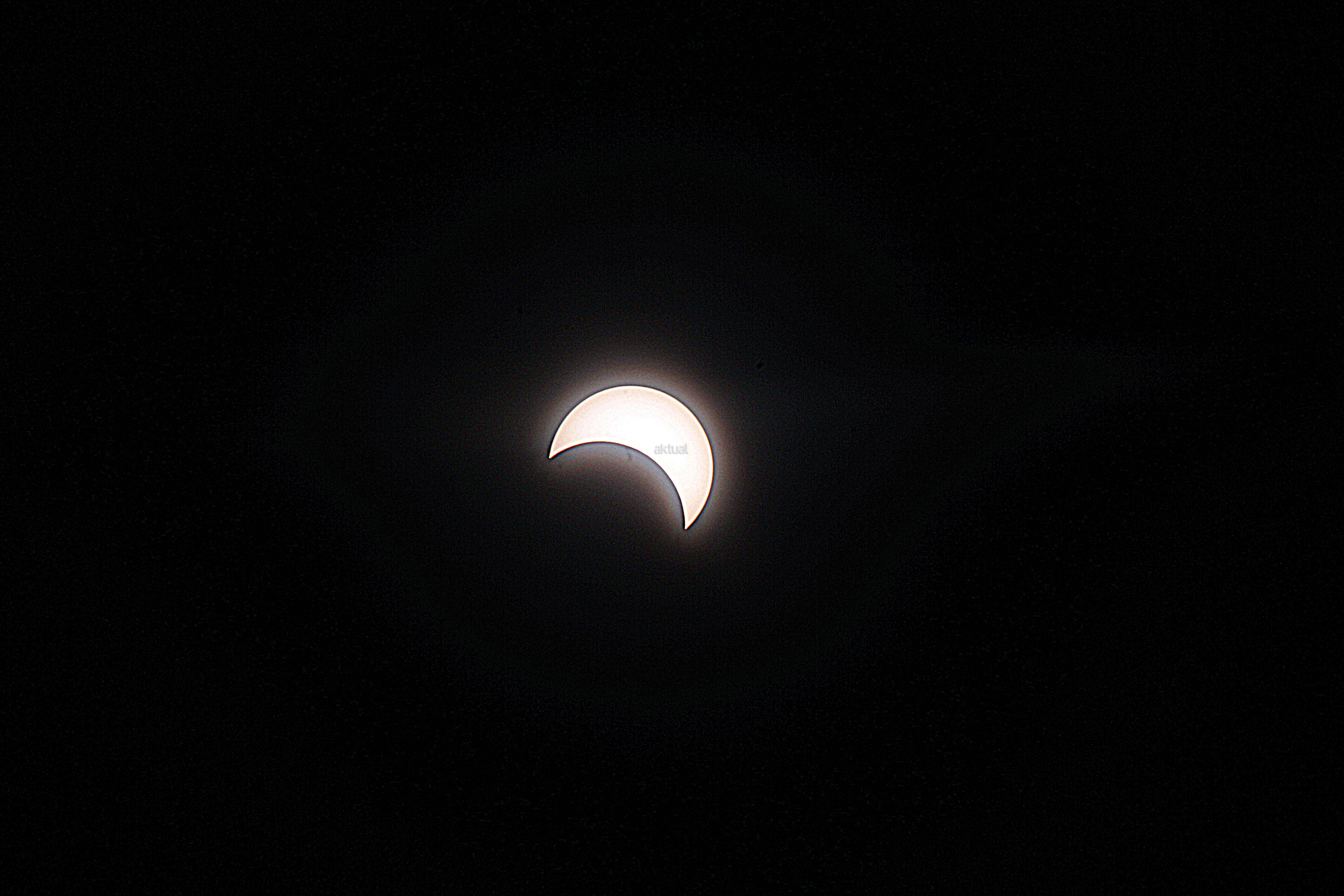 Puncak gerhana matahari terlihat di Kawasan Tebet, Jakarta Selatan, Rabu (9/3). Gerhana matahari total dapat terlihat dari sejumlah wilayah di Indonesia, namun di Jakarta terlihat sebagai gerhana matahari sebagian dengan fase umbra sekitar 76% selama sekitar 1,5 jam yang dimulai pukul 06.55 WIB. AKTUAL/TINO OKTAVIANO