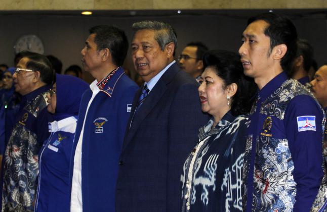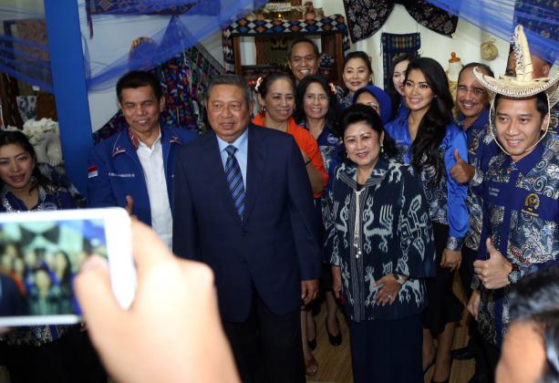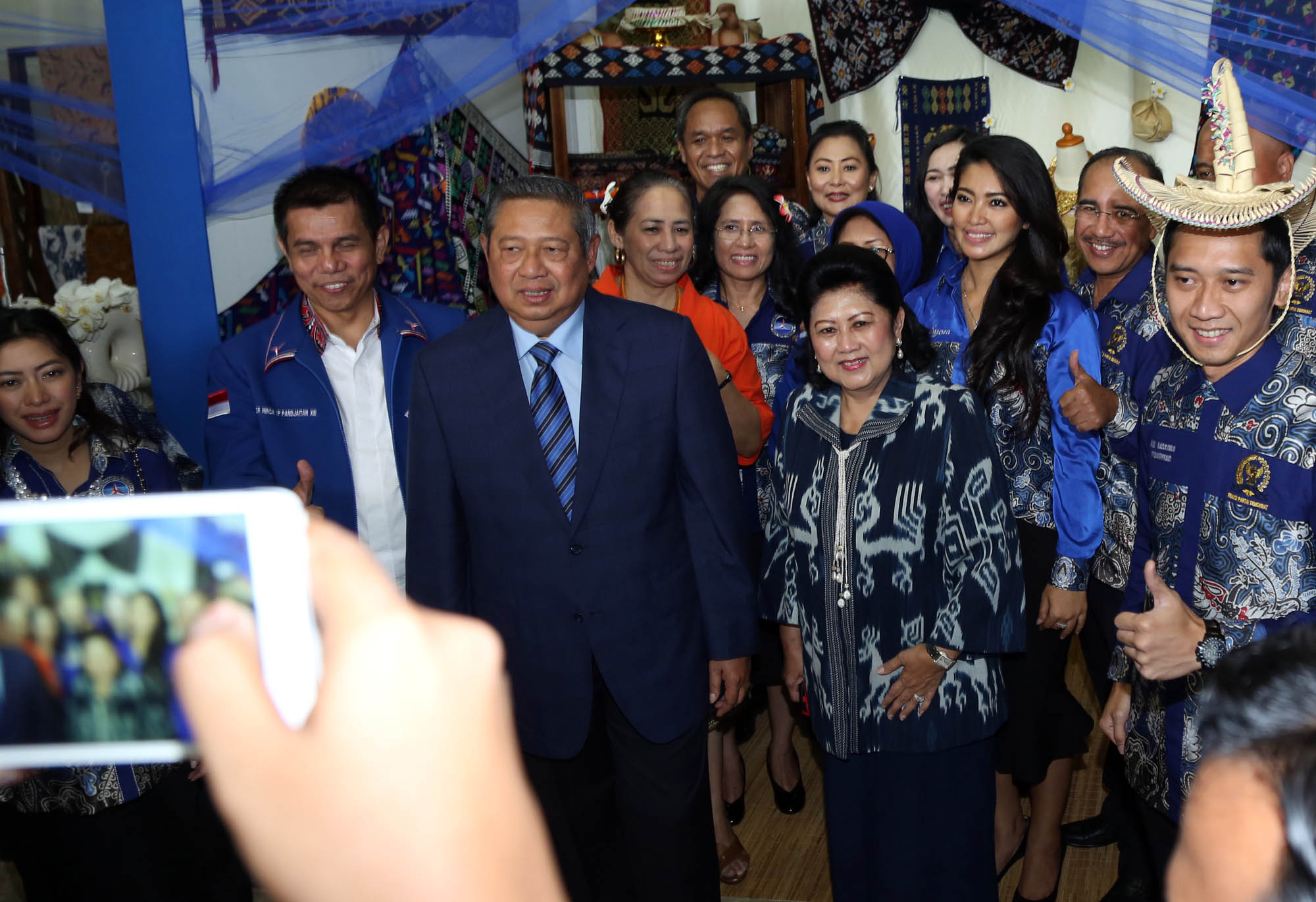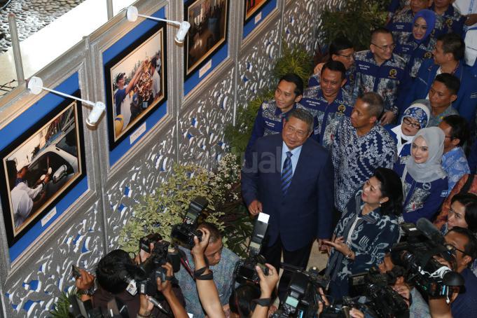 Ketua Umum Partai Demokrat Susilo Bambang Yudhoyono (tengah) didampingi Ibu Ani Yudhoyono (kanan) dan Ketua Fraksi Edhie Baskoro Yudhoyono (kiri) melihat pameran foto para kader sebelum menghadiri puncak peringatan HUT ke-14 Partai Demokrat di Kompleks Parlemen, Senayan, Jakarta, Rabu (9/9). Peringatan HUT ke-14 diselenggarakan dengan mengambil tema 14 tahun Partai Demokrat maju dan bersatu untuk kesejahteraan rakyat.