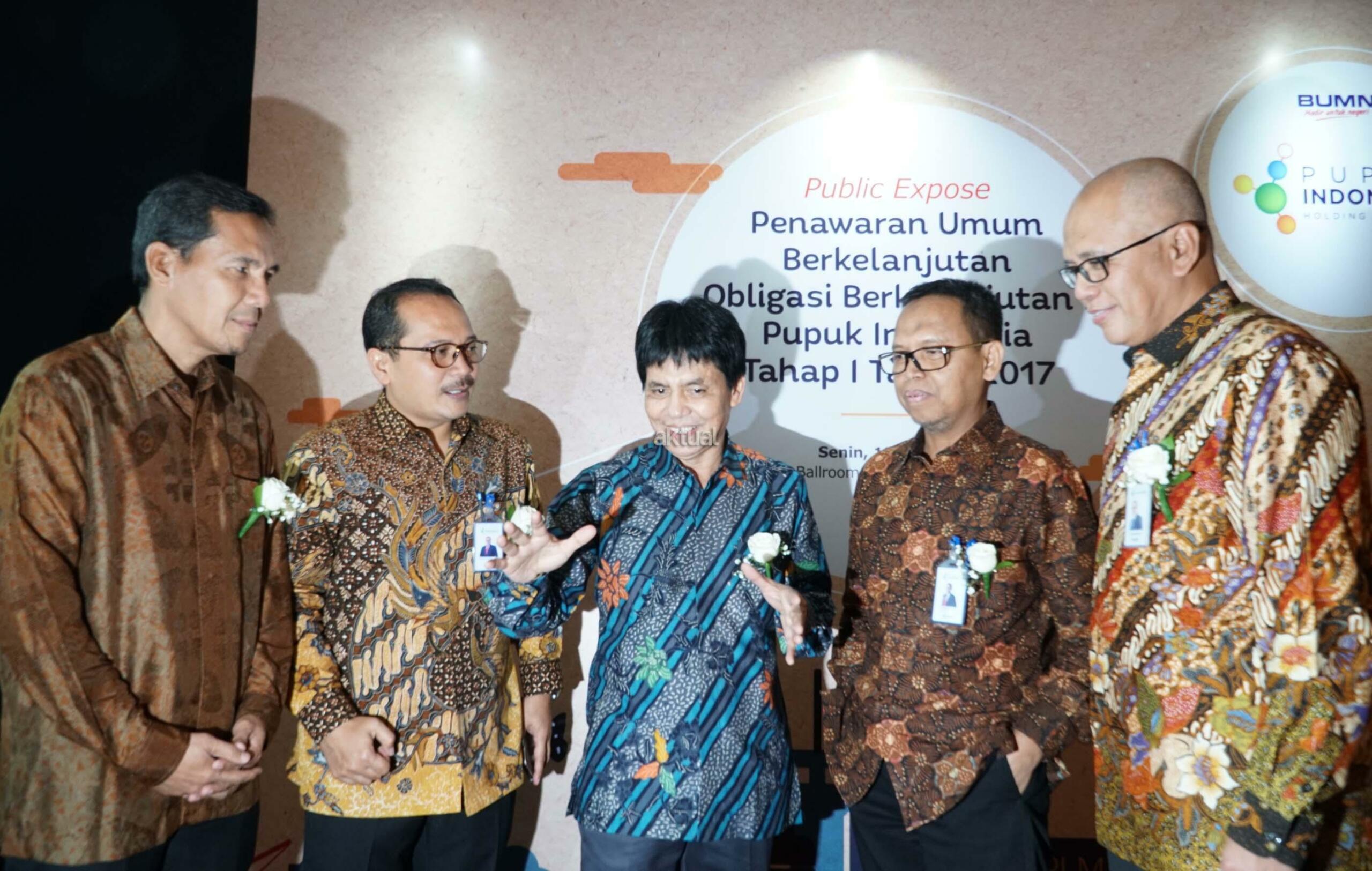 (dari kiri ke kanan) Direktur Teknologi PT Pupuk Indonsia (persero), M.Djohan Safri, Direktur Keuangan, Indarto Pamoengkas, Direktur Utama, Aas Asikin Idat, Direktur SDM dan Tata Kelola, Achmad Tossin Sutawikara, serta Direktur Investasi, Gusrizal, disela penawaran obligasi di Jakarta, Senin (12/6).PT Pupuk Indonesia (persero) menerbitkan obligasi sebanyak banyaknya Rp 3,6 Triliun melalui Penawaran Umum Berkelanjutan (PUB) I tahap 1 tahun 2017.Pupuk Indonesia berencana menggunakan 16% dana hasil emisi obligasi berkelanjutan I tahap I untuk melunasi obligasi I Pupuk Indonesia tahun 2014 seri A. Sisanya 84% dialokasikan untuk pinjaman kepada PT Pupuk Sriwidjaja Palembang ,anak usaha perseroan yang akan digunakan untuk melunasi sebagian kredit investasi. AKTUAL/Eko S Hilman
