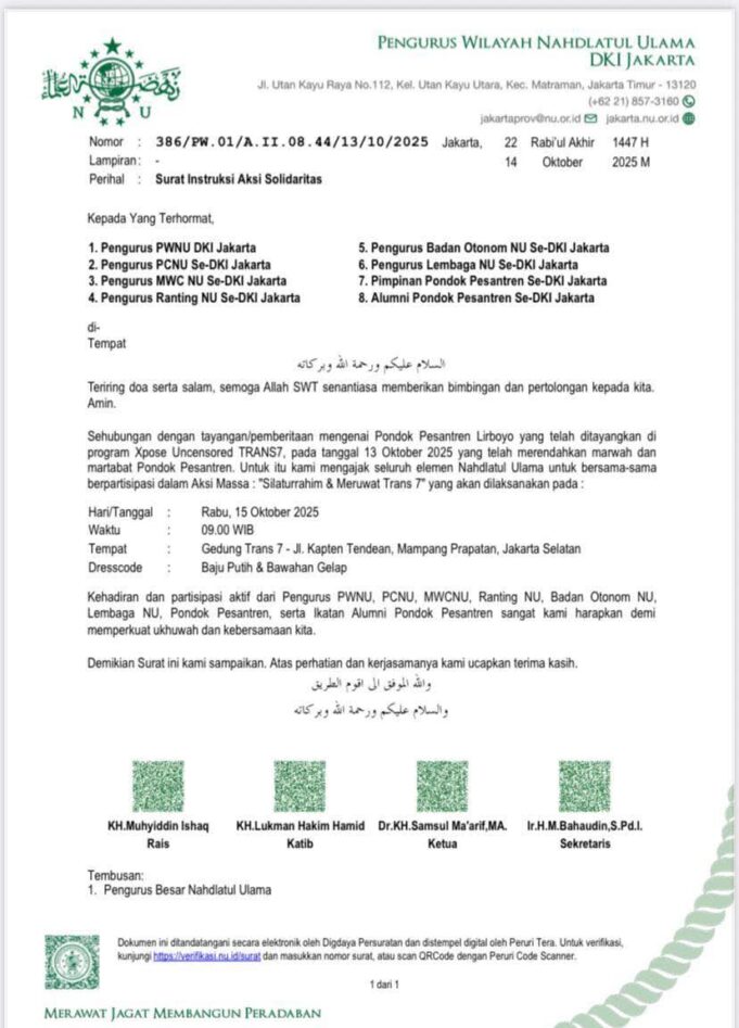 Jakarta, aktual.com – Pengurus Wilayah Nahdlatul Ulama (PWNU) DKI Jakarta menyerukan aksi massa sebagai bentuk protes terhadap tayangan program Xpose Uncensored di stasiun televisi Trans7 yang dinilai merendahkan martabat Pondok Pesantren Lirboyo.