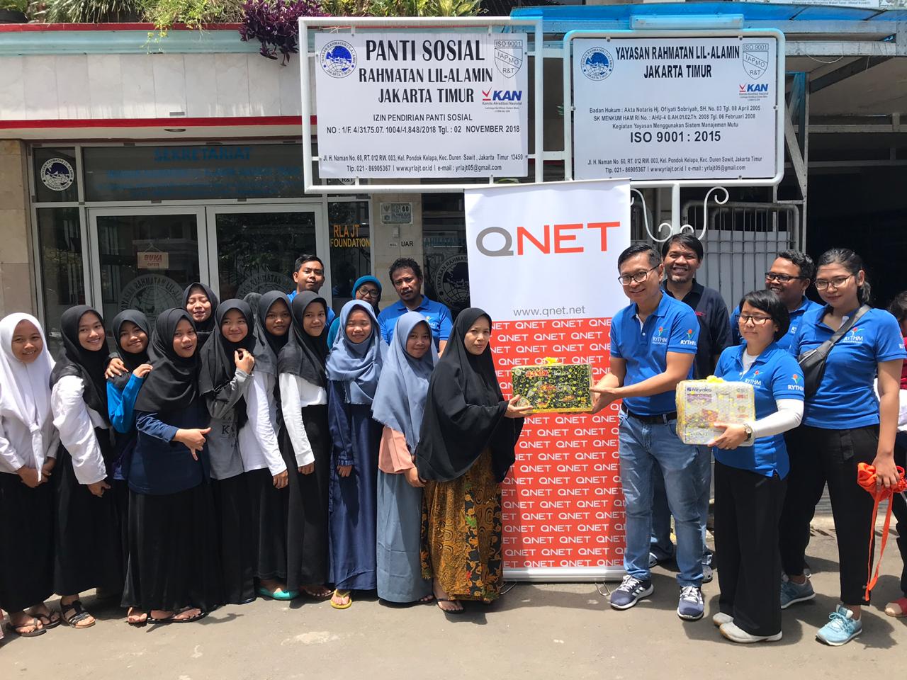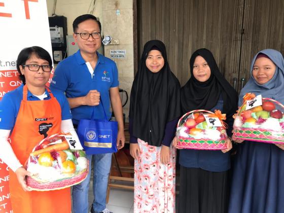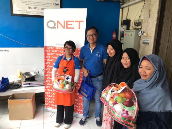 General Manager QNET Indonesia Ganang Rindarko (kedua kiri) foto bersama dengan para remaja disela sela pelatihan pembuatan minuman smoothies untuk kesehatan tubuh di Jakarta, Sabtu (23/3/2019). AKTUAL/Dok QNET