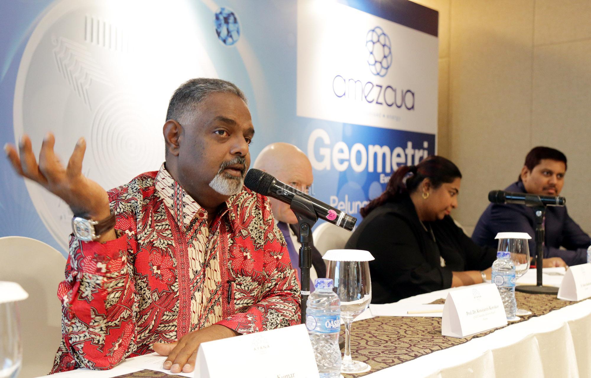 General Manager QNET Indonesia Ganang Rindarko (kiri), Director of Business Development QNET Krishna Kumar (kanan), QNET Scientific Advisory Borard Rusia Konstantin Korotkov (tengah), saat konferensi pers peluncuran Amezcua Geometri di Jakarta, Sabtu (7/7/2018). Amezcua adalah lini produk Energi Selaras QNET yang unik, dirancang untuk meningkatkan keselarasan dan tingkat energi Anda setiap hari. Melalui penelitian dan pengembangan berkelanjutan, Amezcua terus menyediakan produk kebugaran berkualitas yang merangsang gaya hidup seimbang dan meningkatkan kondisi pikiran, tubuh dan jiwa. AKTUAL/Tino Oktaviano