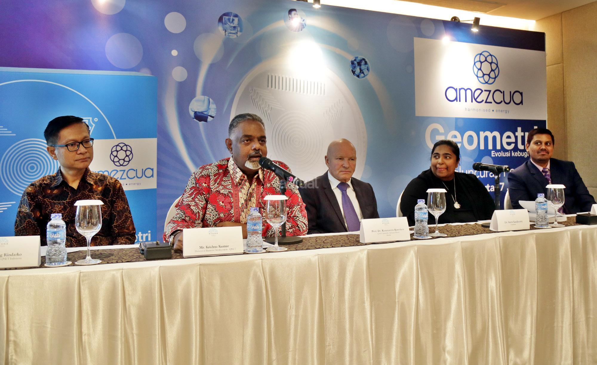 Dari kiri ke kanan, General Manager QNET Indonesia Ganang Rindarko, Director of Business Development QNET Krishna Kumar, QNET Scientific Advisory Borard Rusia Konstantin Korotkov, Consultant QNET Anura Kandasamy dan Head of Energy Product Range QNET Shafi Shaik saat konferensi pers peluncuran Amezcua Geometri di Jakarta, Sabtu (7/7/2018). Amezcua adalah lini produk Energi Selaras QNET yang unik, dirancang untuk meningkatkan keselarasan dan tingkat energi Anda setiap hari. Melalui penelitian dan pengembangan berkelanjutan, Amezcua terus menyediakan produk kebugaran berkualitas yang merangsang gaya hidup seimbang dan meningkatkan kondisi pikiran, tubuh dan jiwa. AKTUAL/Tino Oktaviano