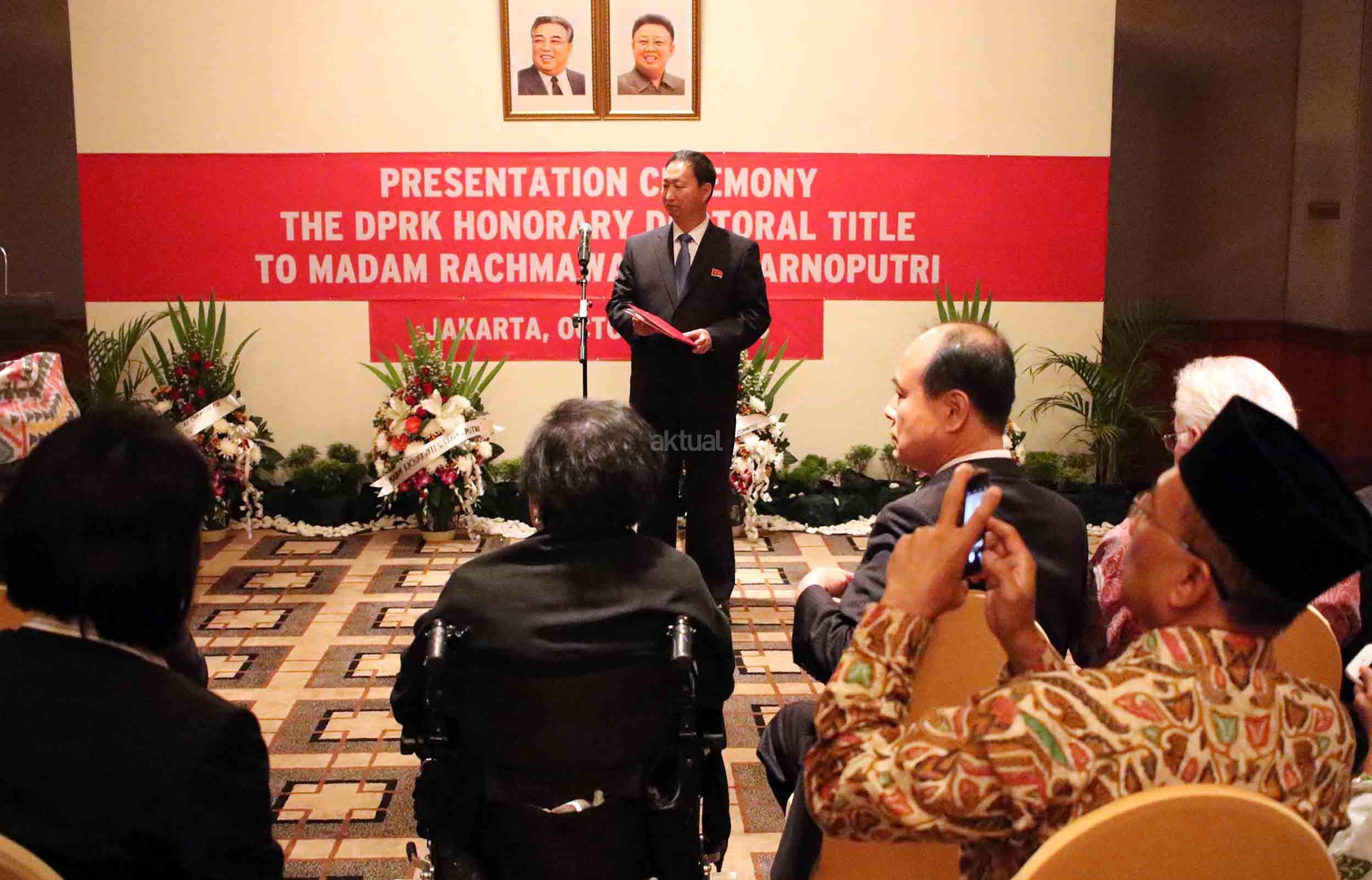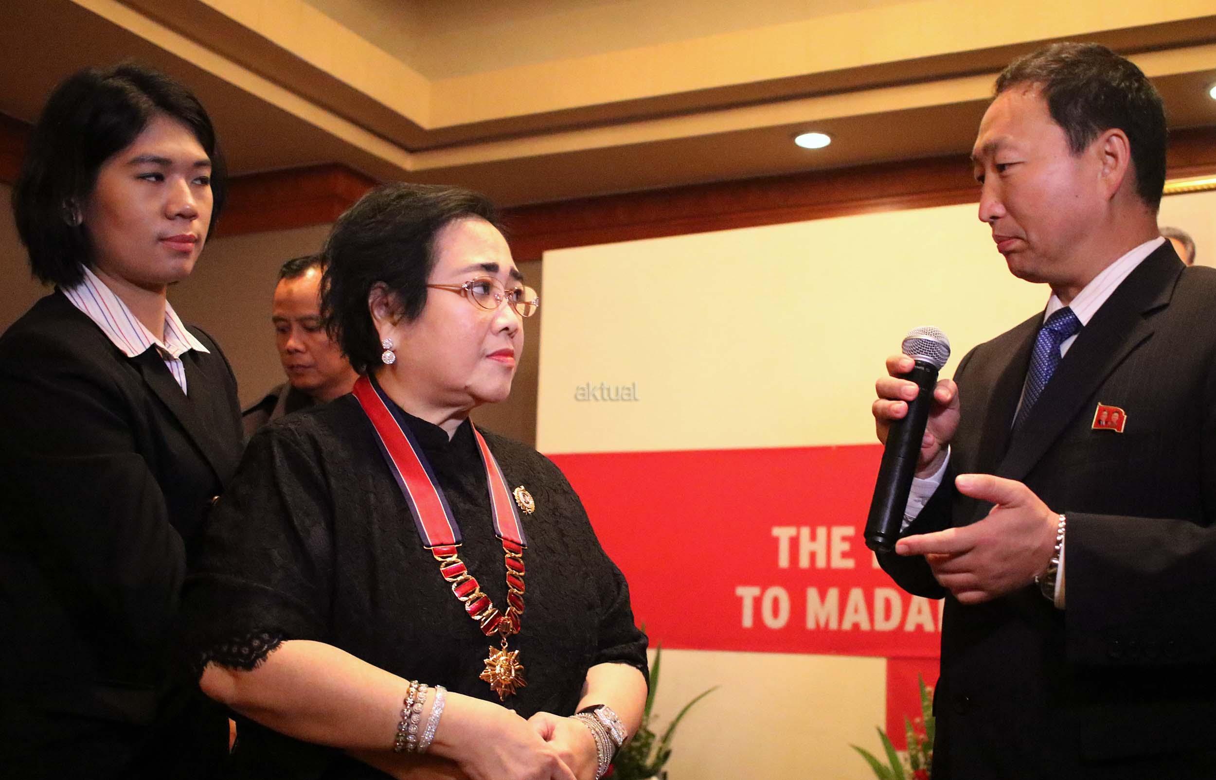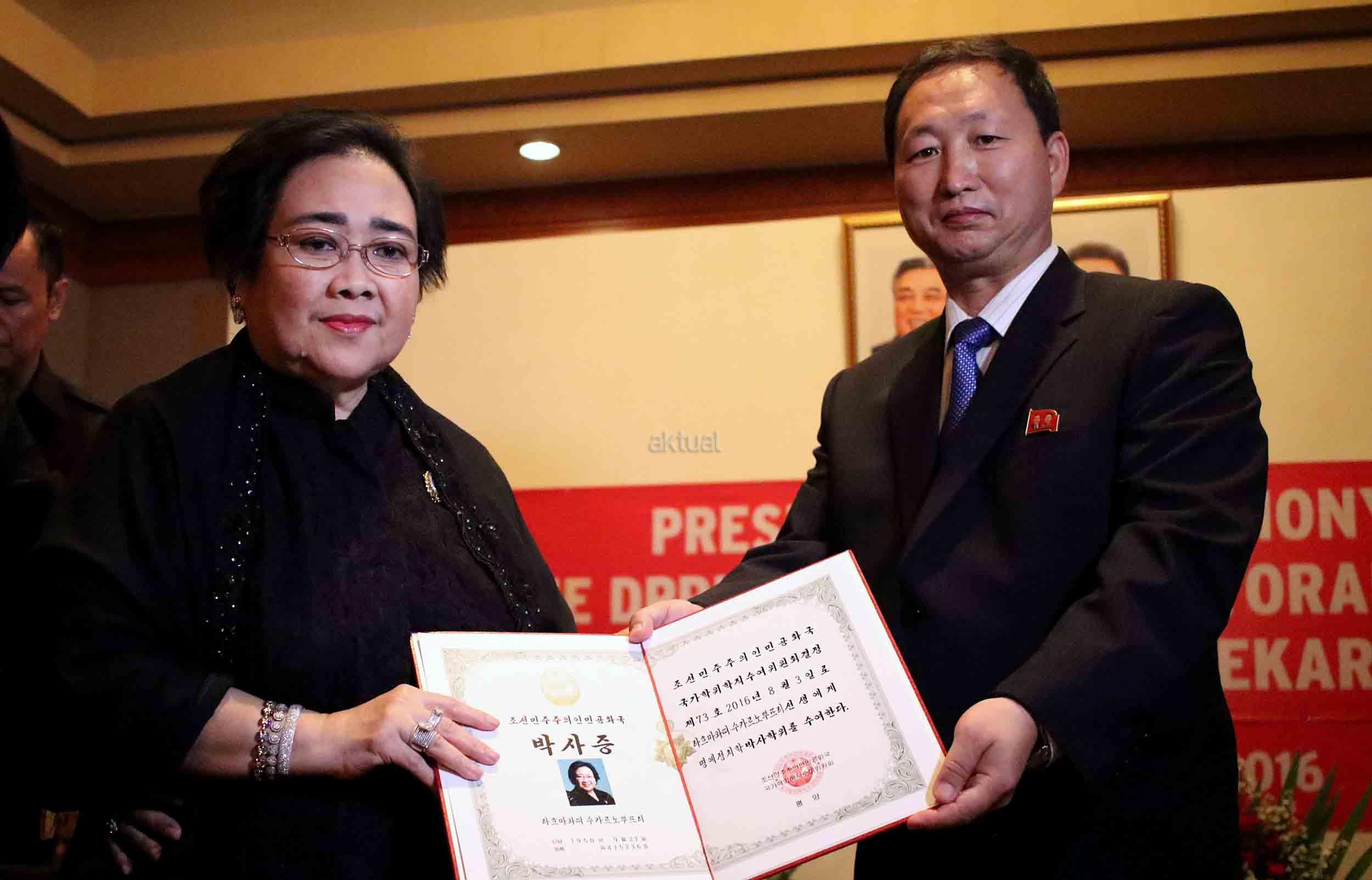 Duta Besar Republik Demokratik Rakyat Korea An Kwang Il (kanan) memberikan sertifikat gelar Doktor Honoris Causa dalam bidang Ilmu Politik kepada Ketua Umum Yayasan Pendidikan Soekarno (YPS) Rachmawati Soekarnoputri (kiri) di Jakarta, Kamis (6/10/2016). Pemberian gelar diberikan kepada Ketua Umum Yayasan Pendidikan Soekarno (YPS) Rachmawati Soekarnoputri berdasarkan keputusan Akademi Award Republik Demokratik Rakyat Korea tetanggal 3 Agustus 2016. Penganugerahan ini diserahkan secara langsung oleh Duta Besar Republik Demokratik Rakyat Korea. Aktual/Munzir