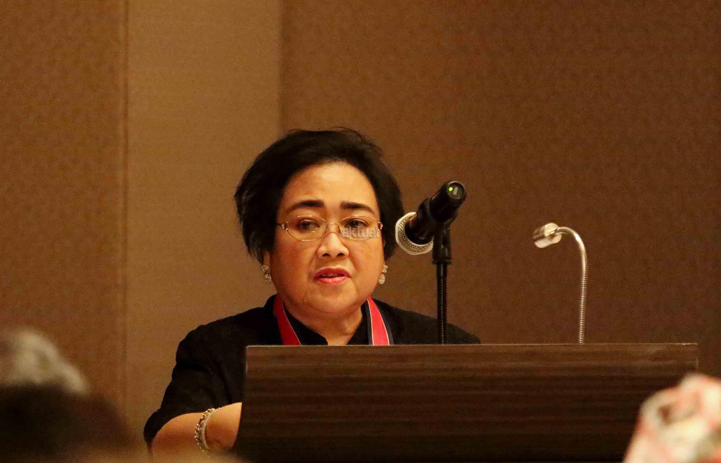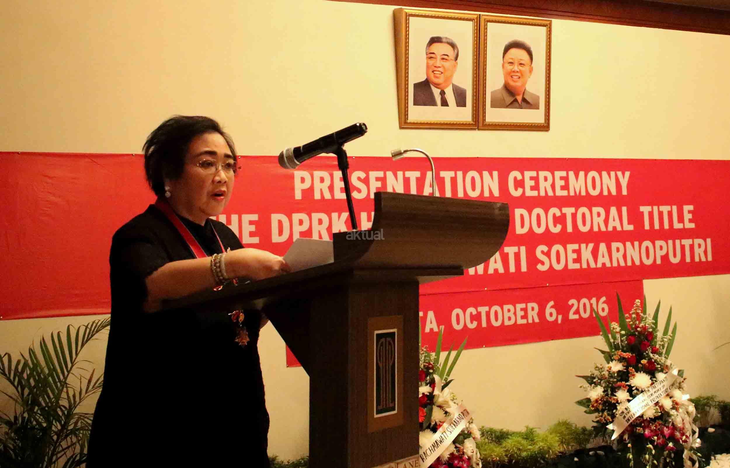 Ketua Umum Yayasan Pendidikan Soekarno (YPS) Rachmawati Soekarnoputri memberikan pidatonya usai peanugrahan Doktor Honoris Causa di Jakarta, Kamis (6/10/2016). Pemberian gelar diberikan kepada Ketua Umum Yayasan Pendidikan Soekarno (YPS) Rachmawati Soekarnoputri berdasarkan keputusan Akademi Award Republik Demokratik Rakyat Korea tetanggal 3 Agustus 2016. Penganugerahan ini diserahkan secara langsung oleh Duta Besar Republik Demokratik Rakyat Korea.