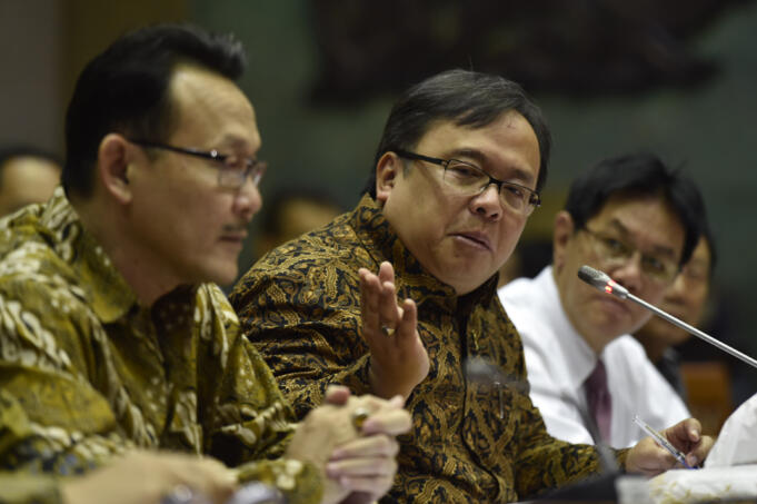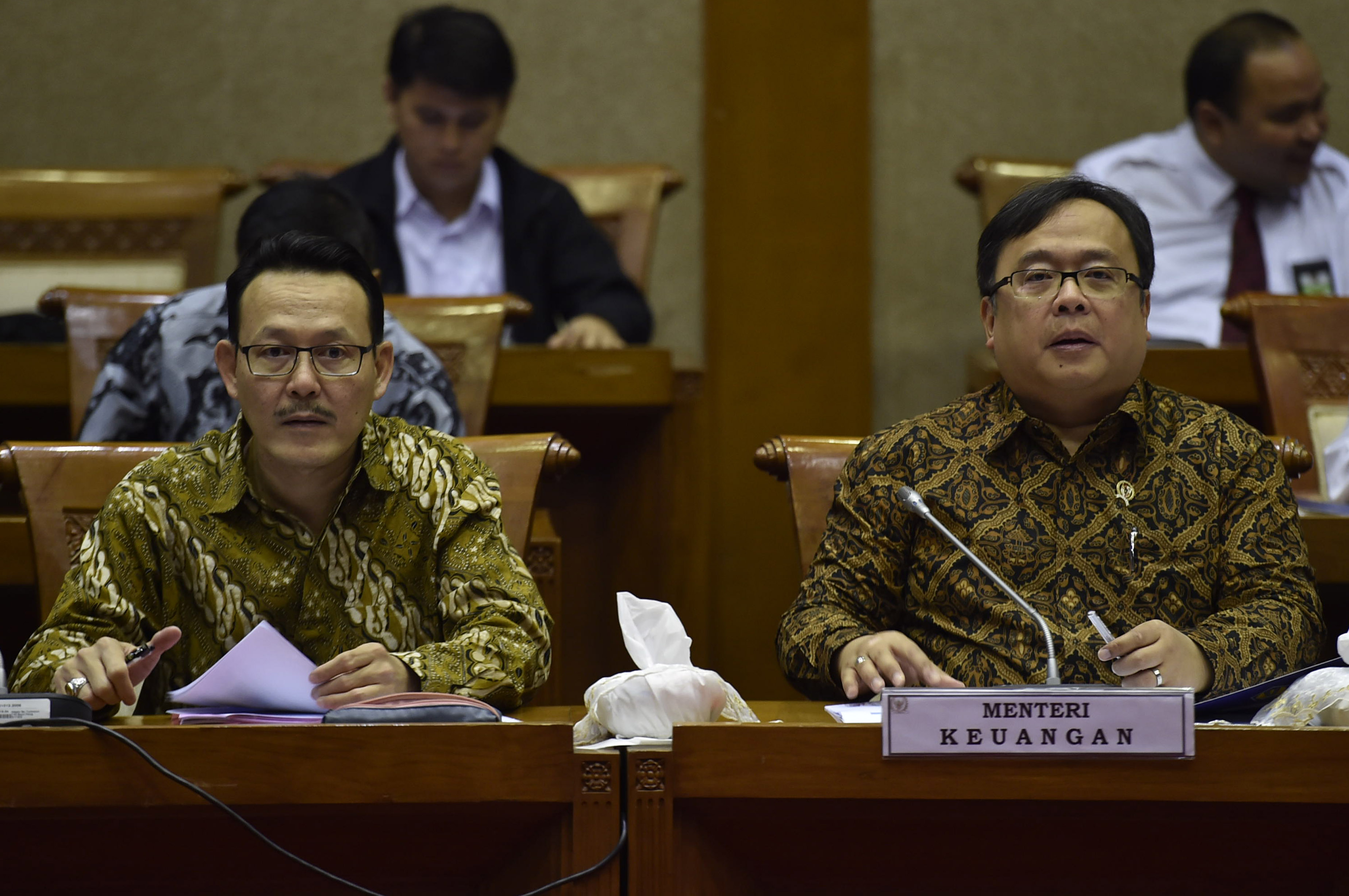 Menteri Keuangan Bambang Brodjonegoro (kanan) didampingi Direktur Utama BPJS Kesehatan Fachmi Idris (kiri) mengikuti rapat kerja dengan Komisi XI di Komplek Parlemen Senayan, Jakarta, Senin (20/6). Raker tersebut membahas masalah Penyertaan Modal Negara (PMN) tahun 2016 dan Tambahan alokasi Pembiayaan non utang dalam RAPBN-P Tahun Anggaran 2016. ANTARA FOTO/Puspa Perwitasari/ama/16