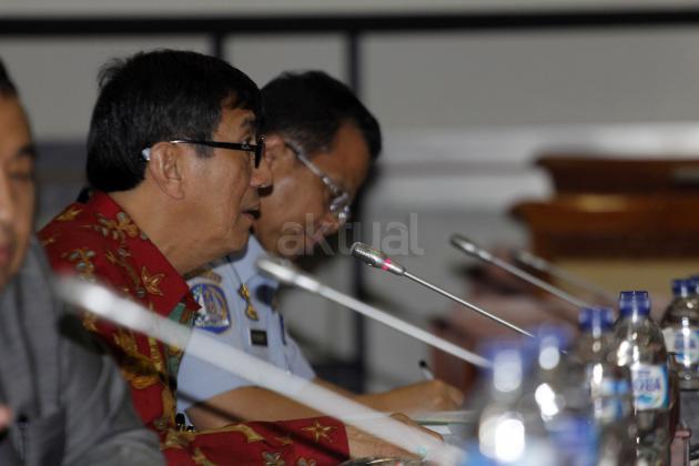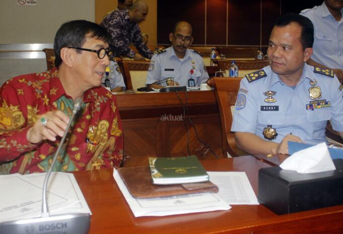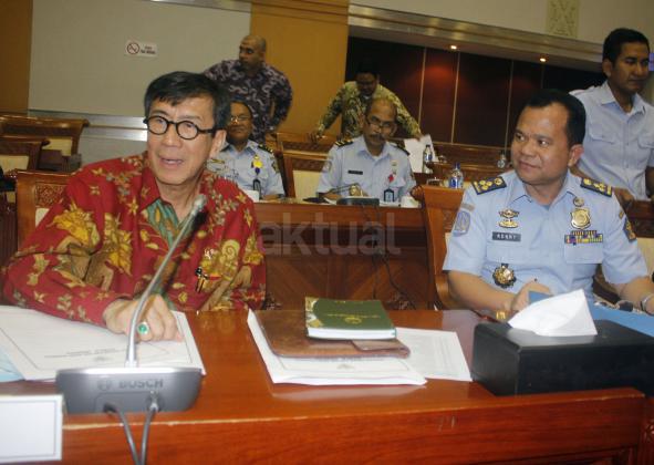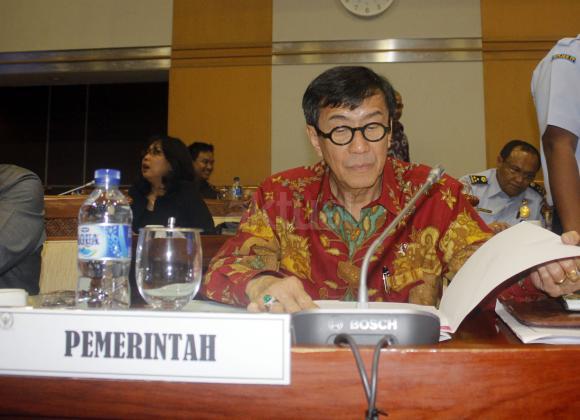 Menteri Hukum dan Ham, Yasonna Laoly (kiri) bersama Direktur Jenderal Imigrasi Kementerian Hukum dan HAM Ronny F Sompy (kanan) menghadiri Rapat Kerja (Raker) Komisi I di Kompleks Parlemen, Senayan, Jakarta, Selasa (13/10/2015). Raker membahas Rancangan Undang-Undang (RUU) Tentang pengesahan perjanjian timbal balik dalam masalah pidana antara Republik Indonesia dan Republik Sosialis Vietnam.