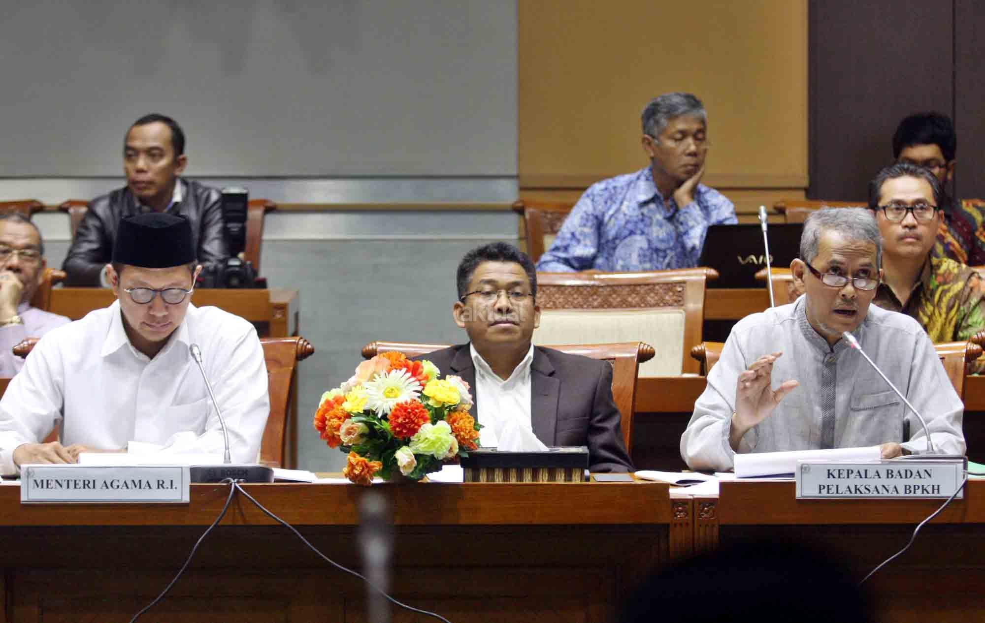 Menteri Agama Lukman Hakim Saifuddin (tengah) bersama Kepala Badan Pelaksana Badan Pengelola Keuangan Haji (BPKH) Anggito Abimanyu (kanan) mengikuti Raker dengan Komisi VIII DPR di Kompleks Parlemen Senayan, Jakarta, Kamis (24/5). Rilis 200 daftar nama mubalig penceramah Islam di Indonesia yang dikeluarkan Kementerian Agama disinggung dalam rapat kerja Komisi VIII DPR hari ini dengan Menteri Agama (Menag) Lukman Hakim Saifuddin. Lukman Hakim Saifuddin pun meluruskan polemik tersebut kepada Komisi VIII DPR. AKTUAL/Tino Oktaviano