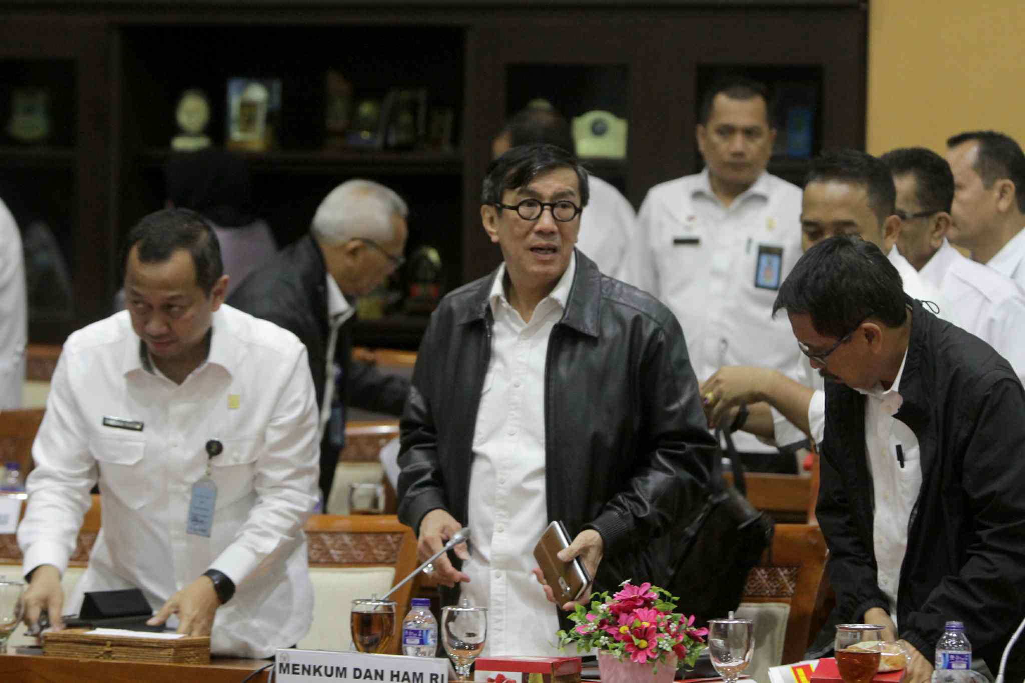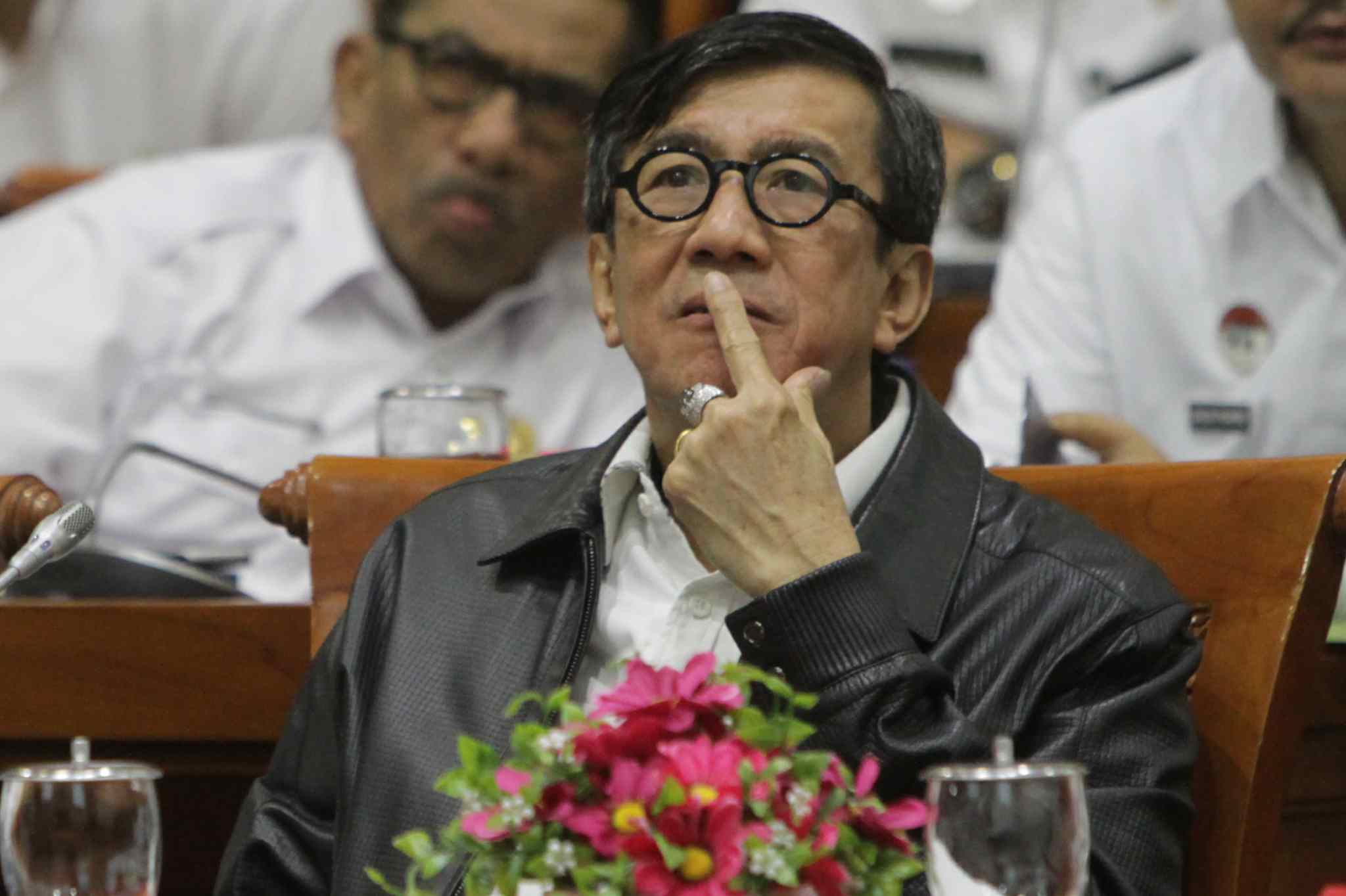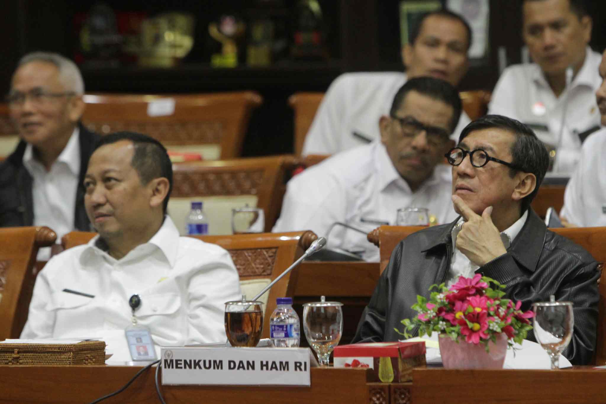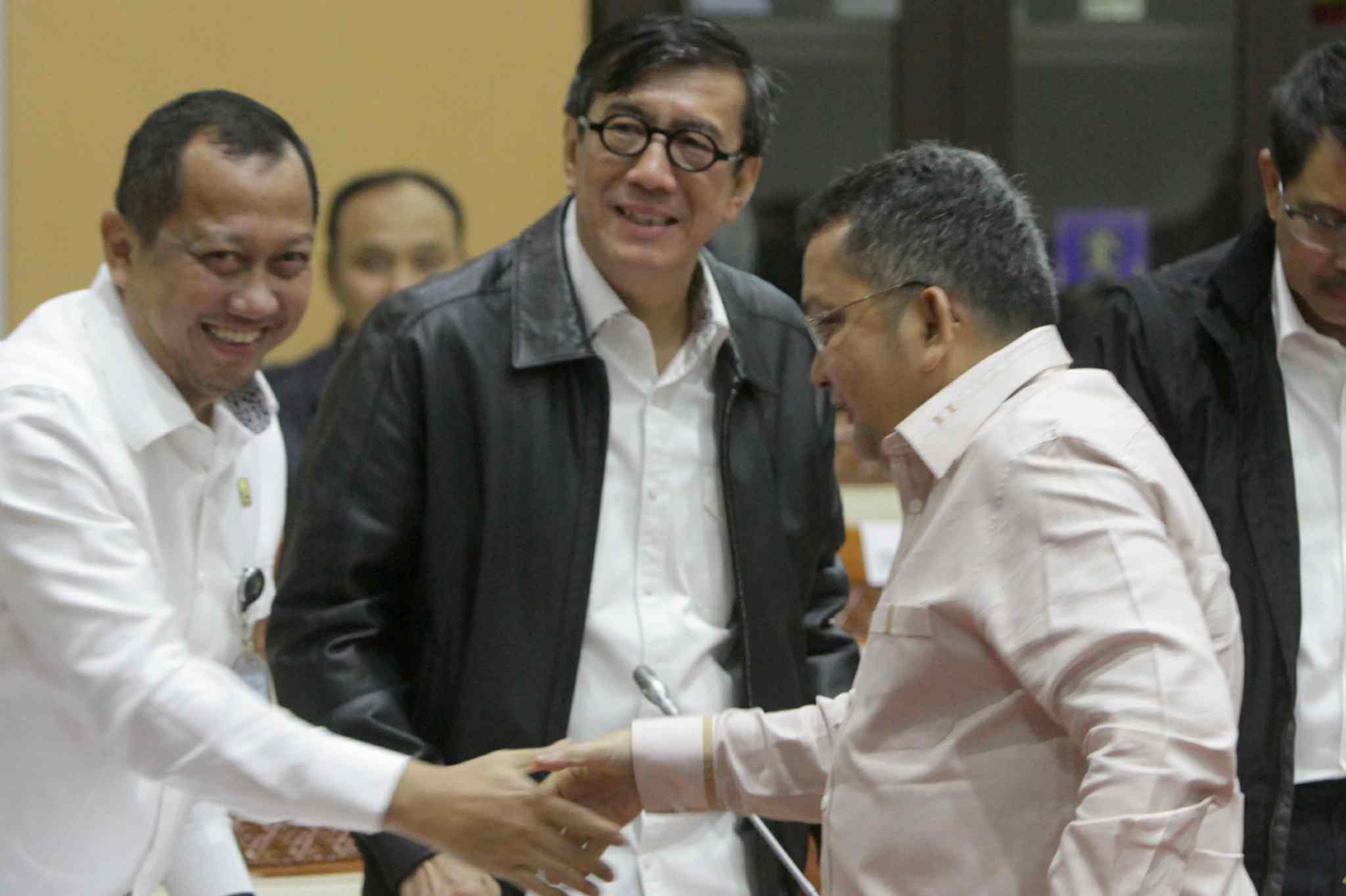 Menteri Hukum dan HAM Yasonna Laoly (kiri) mendengarkan pertanyaan anggota Komisi III saat rapat kerja di Komplek Parlemen Senayan, Jakarta, Rabu (7/9). Raker tersebut diantaranya membahas evaluasi pengawasan orang asing serta memberi penjelasan soal status kewarganegaraan mantan Menteri ESDM Arcandra Tahar. AKTUAL/TINO OKTAVIANO