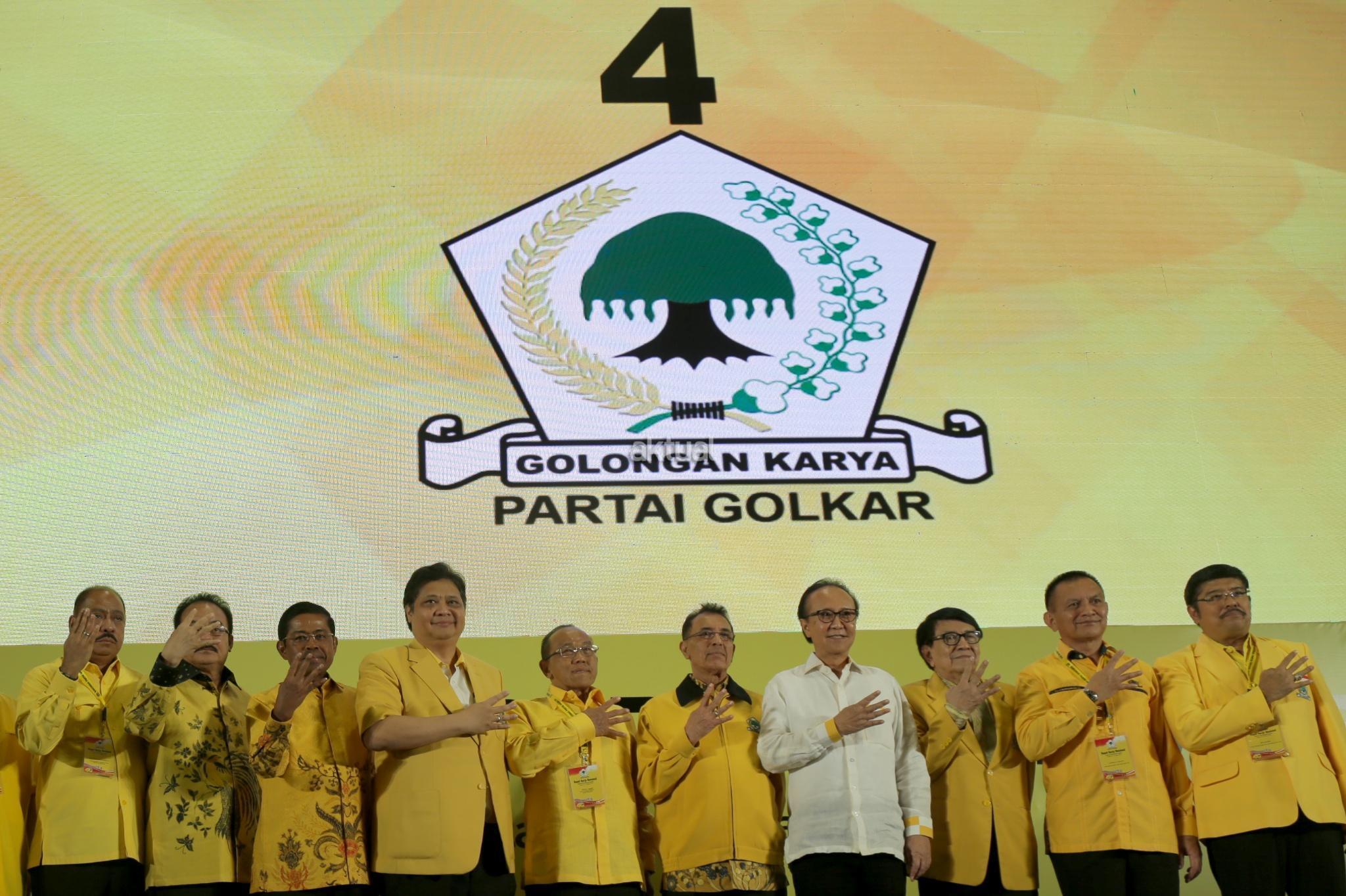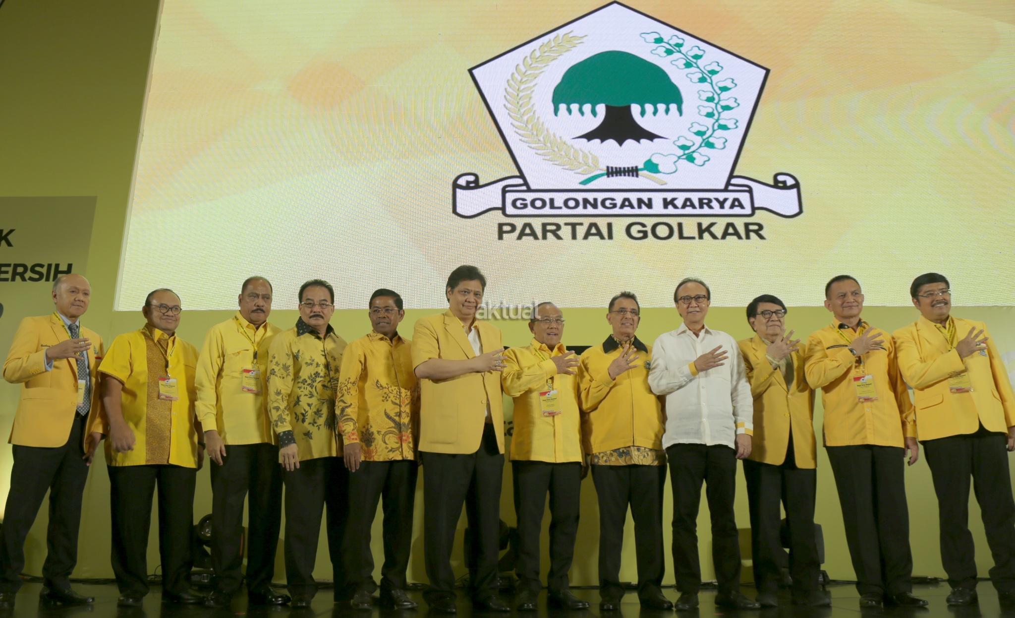 Ketua Umum Partai Golkar Airlangga Hartarto didampingi Pembina Partai Golkar Aburizal Bakrie dan jajaran pengurus Partai Golkar mengangkat tangan usai membuka Rakernas di Hotel Sultan, Jakarta, Kamis (22/3/18). Rakernas Golkar digelar untuk meneguhkan etika politik mewujudkan partai Golkar bersih menuju sukses pemilu 2019 yang bermartabat. AKTUAL/Tino Oktaviano