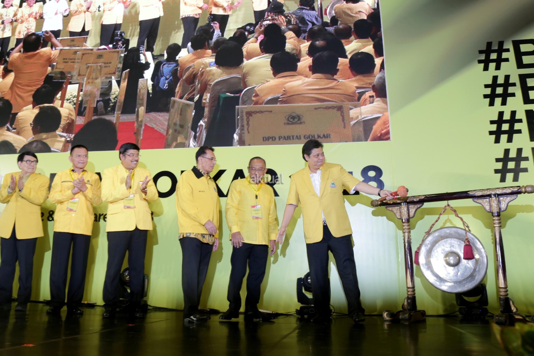 Ketua Umum Partai Golkar Airlangga Hartarto didampingi Pembina Partai Golkar Aburizal Bakrie dan jajaran pengurus Partai Golkar membuka Rakernas di Hotel Sultan, Jakarta, Kamis (22/3/18). Rakernas Golkar digelar untuk meneguhkan etika politik mewujudkan partai Golkar bersih menuju sukses pemilu 2019 yang bermartabat. AKTUAL/Tino Oktaviano