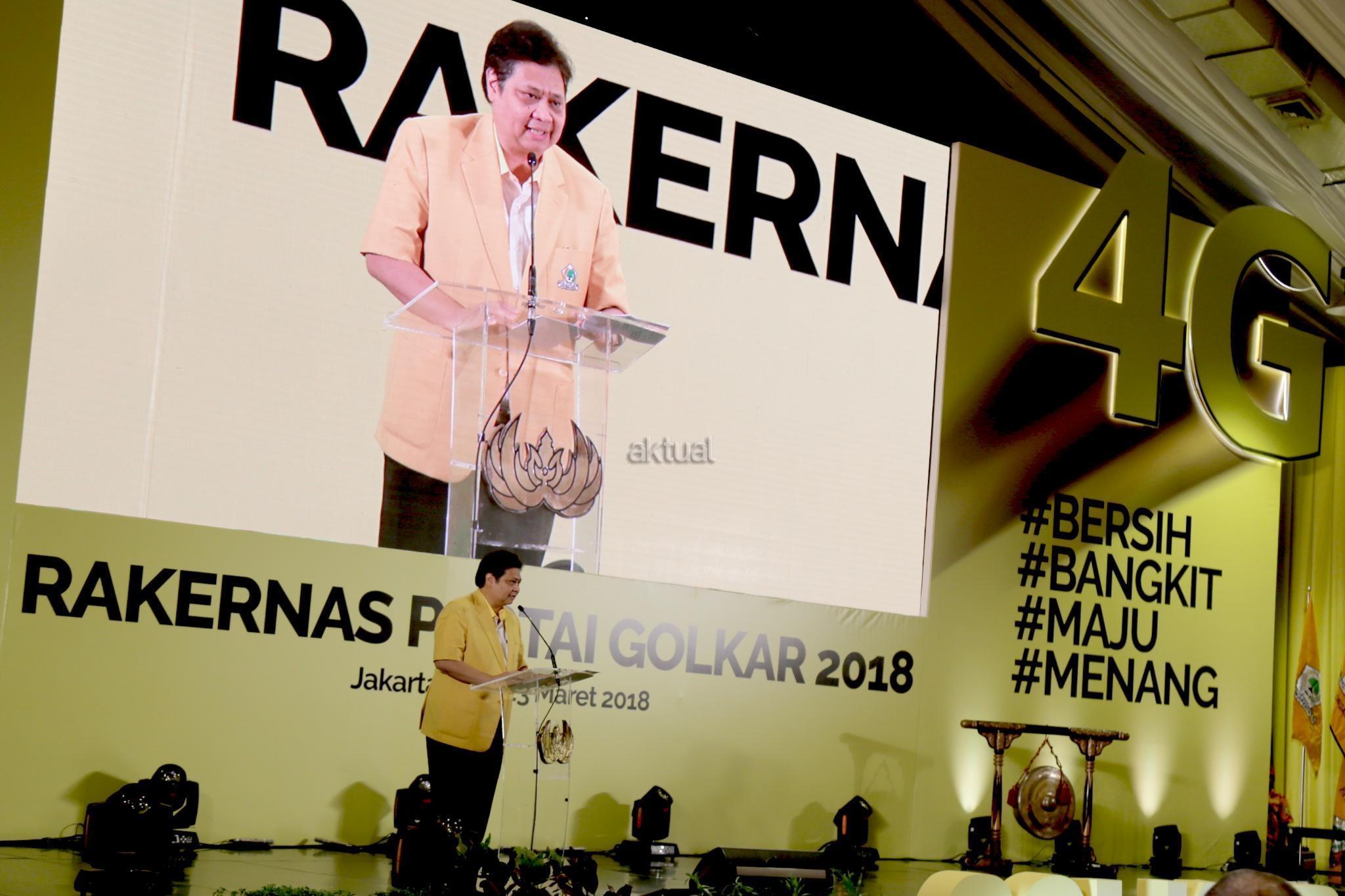 Ketua Umum Partai Golkar Airlangga Hartarto memberikan sambutan saat membuka Rakernas di Hotel Sultan, Jakarta, Kamis (22/3/18). Rakernas Golkar digelar untuk meneguhkan etika politik mewujudkan partai Golkar bersih menuju sukses pemilu 2019 yang bermartabat. AKTUAL/Tino Oktaviano