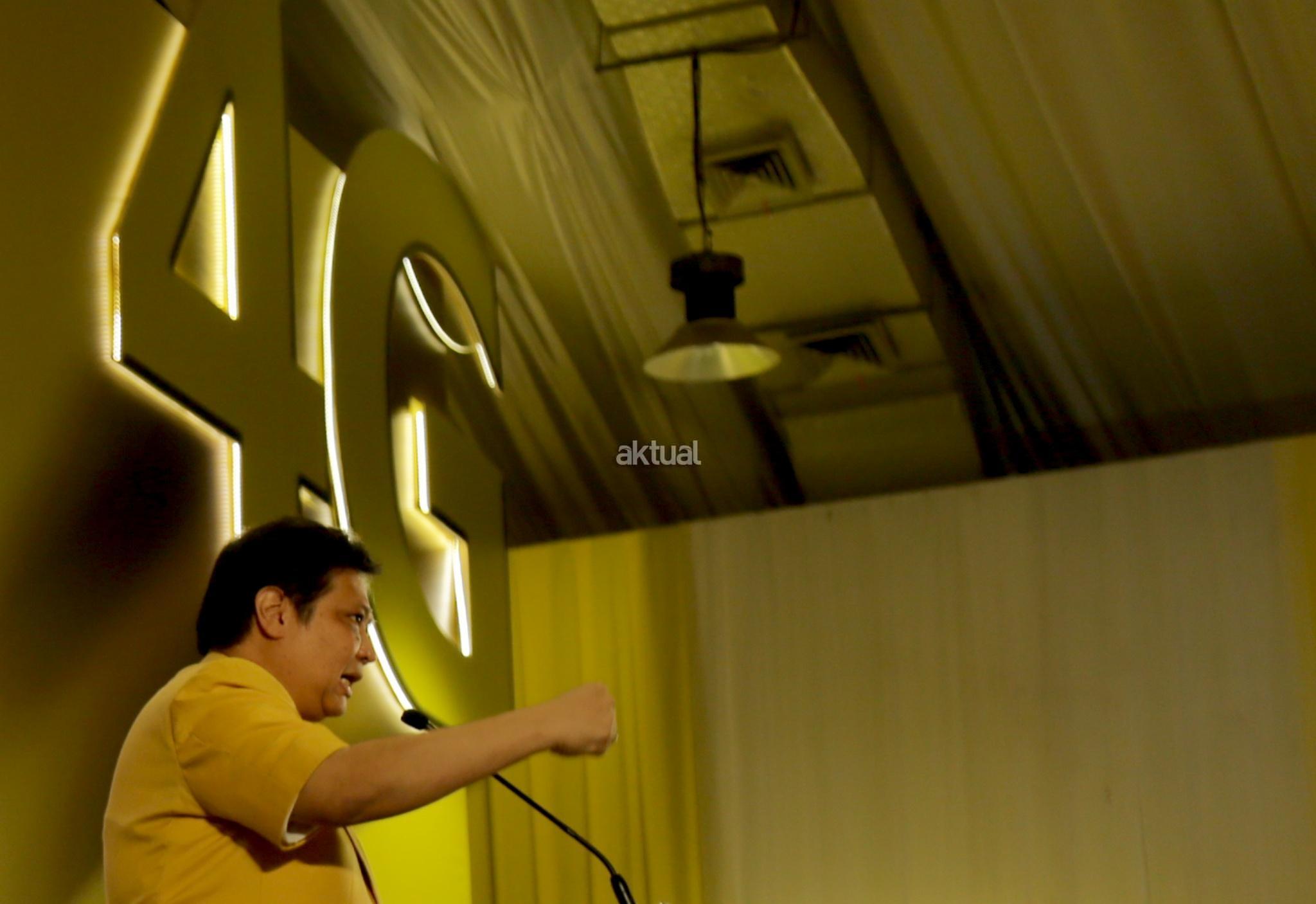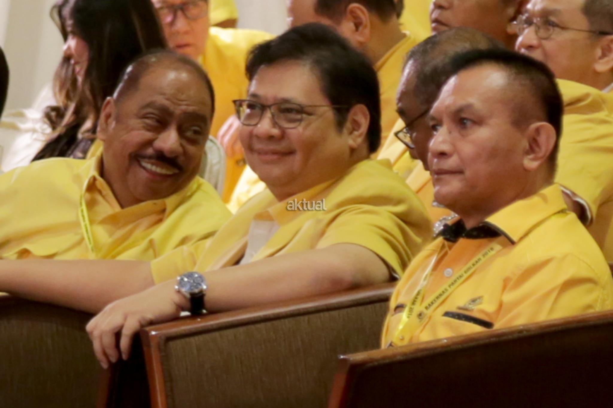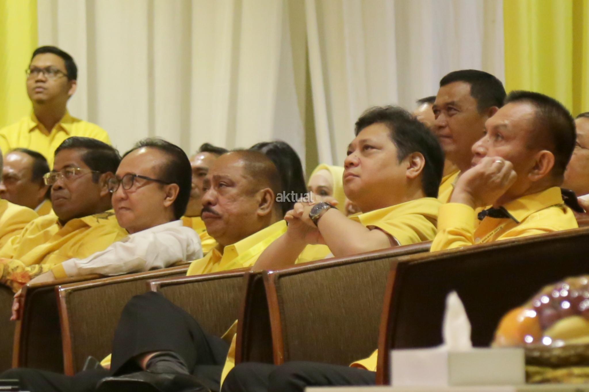 Ketua Umum Partai Golkar Airlangga Hartarto didampingi Ketua Fraksi Partai Golkar DPR RI Melchias Marcus Mekeng dan Sekjen Partai Golkar Lodewijk Freidrich Paulus saat Rakernas di Hotel Sultan, Jakarta, Kamis (22/3/18). Rakernas Golkar digelar untuk meneguhkan etika politik mewujudkan partai Golkar bersih menuju sukses pemilu 2019 yang bermartabat. AKTUAL/Tino Oktaviano