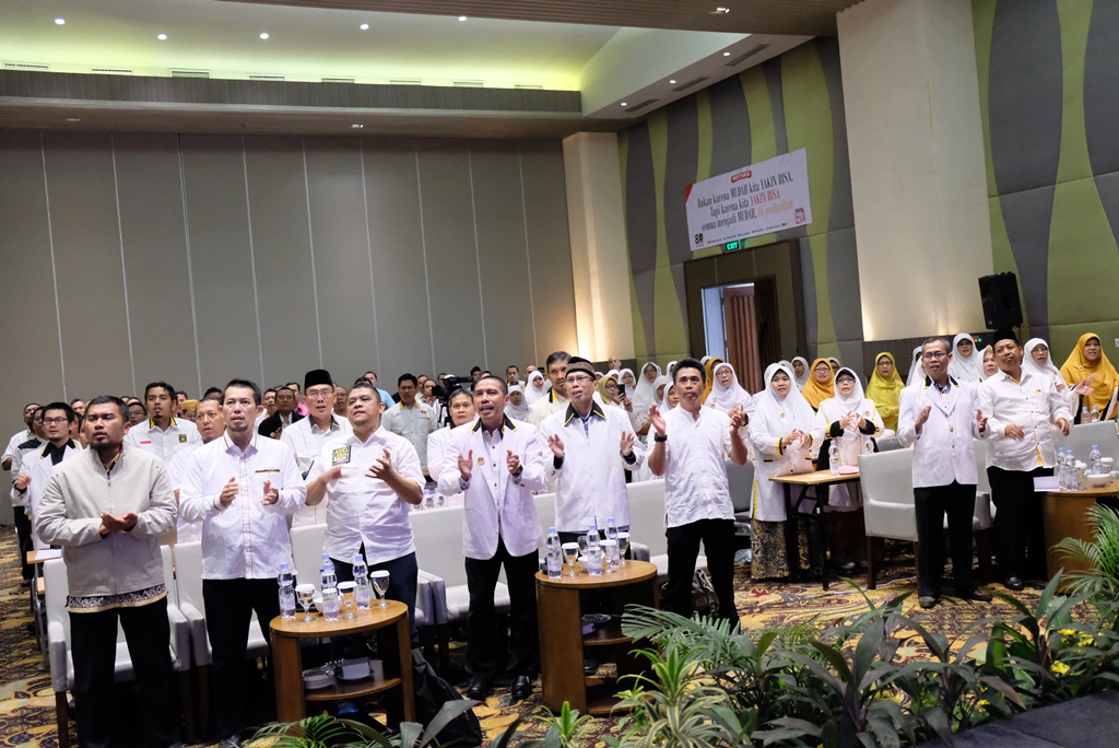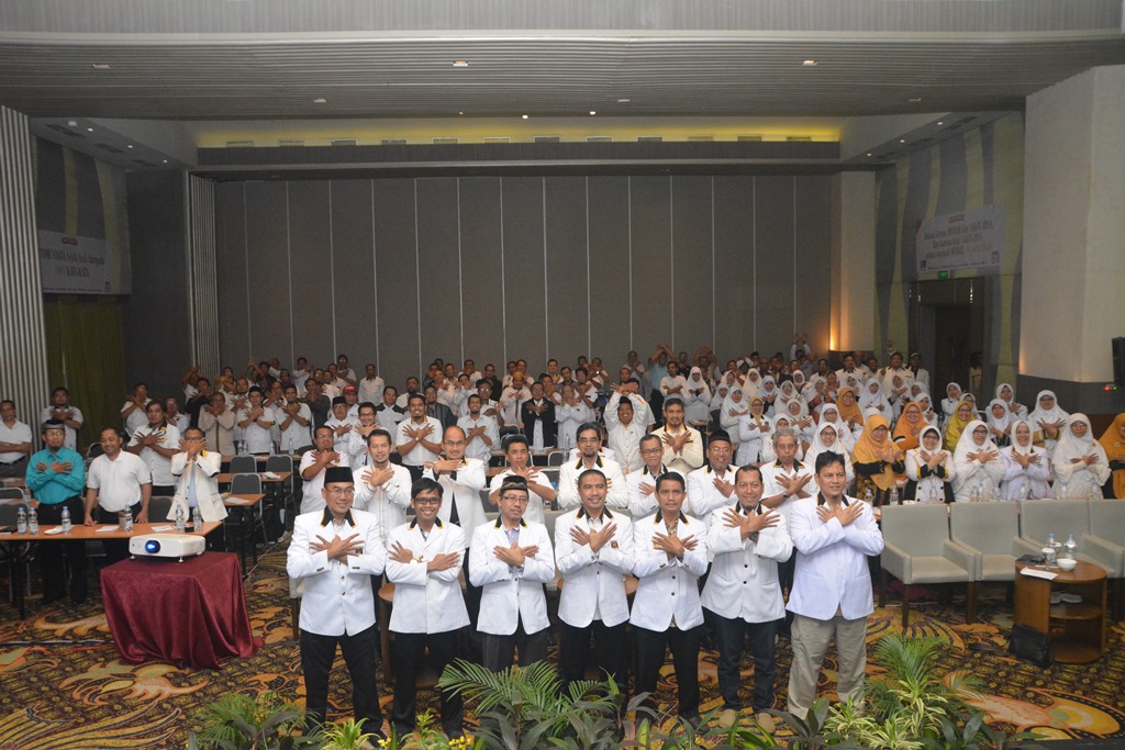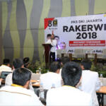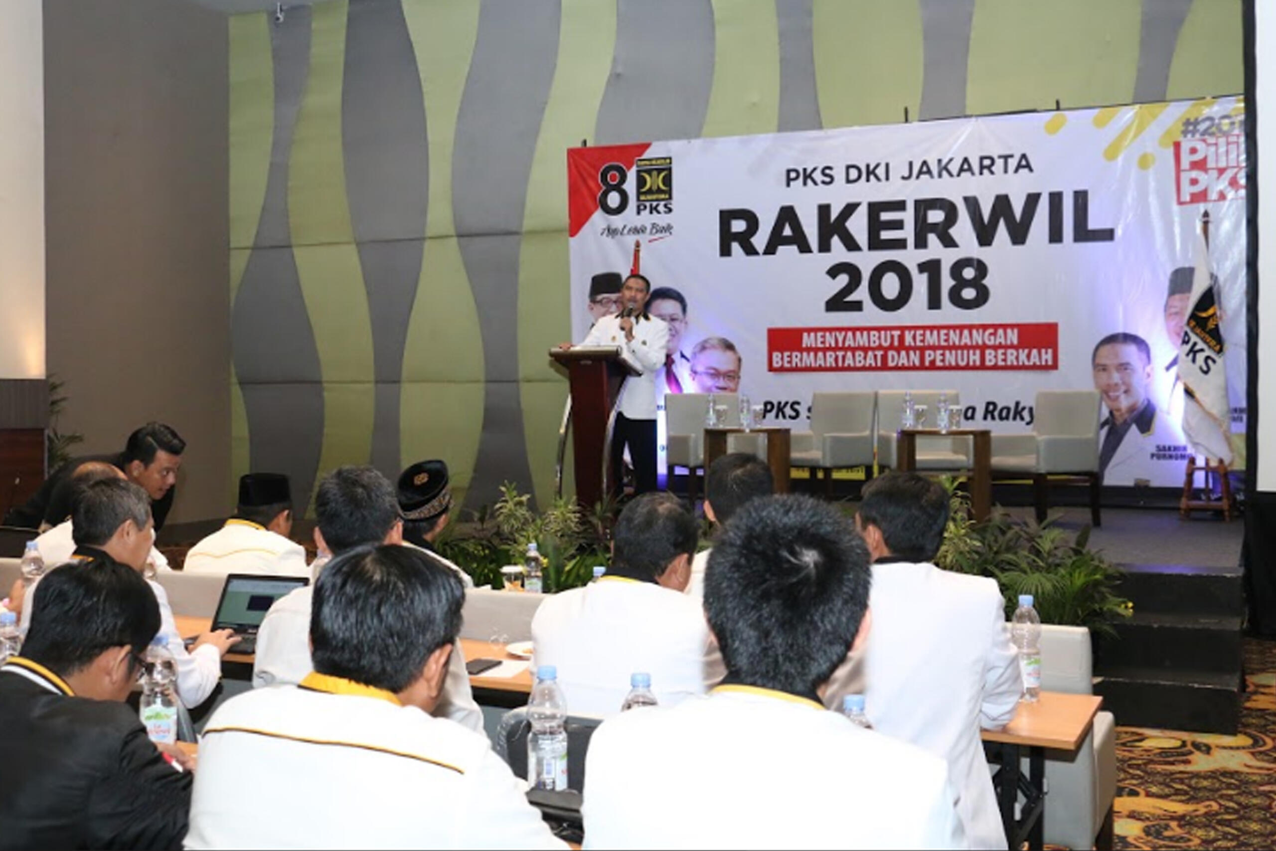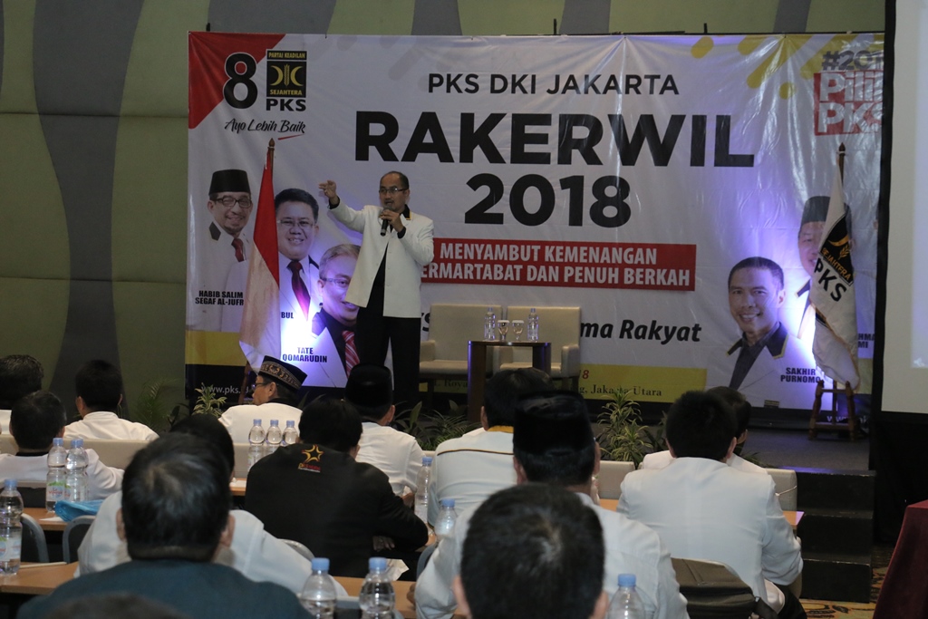 Ketua Umum DPW PKS DKI Jakarta Sakhir Purnomo memberikan sambutan dihadapan tidak kurang 200 orang Calon Anggota DPR RI dan DPRD DKI Jakarta dalam Rapat Kerja Wilayah (Rakerwil) 2018 di Hotel eL-Royale, Kelapa Gading, Jakarta Utara, pagi ini, Ahad (21/10). Agenda ini salah satunya adalah menyinergikan pemenangan bagi Calon Anggota Dewan (CAD), baik yang akan maju di wilayah (DPRD DKI) maupun pusat (DPR RI). Adapun target raihan suara PKS DKI Jakarta dalam Pemilu 2019 adalah sebesar 62 persen atau sekitar 65 kursi di tingkat DPRD DKI.  AKTUAL/HO