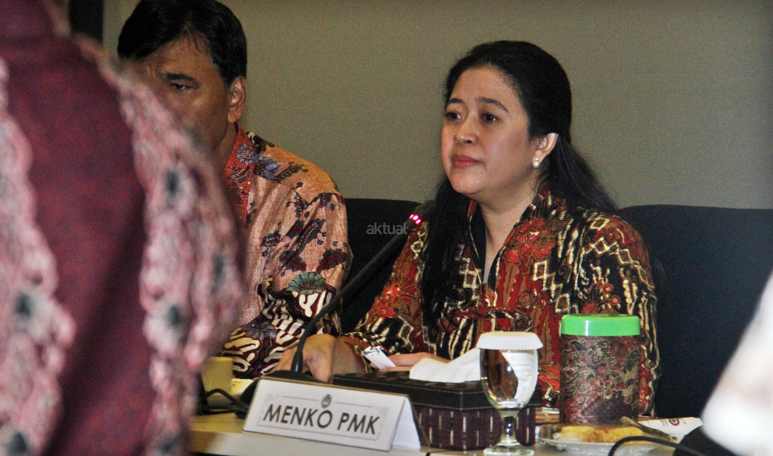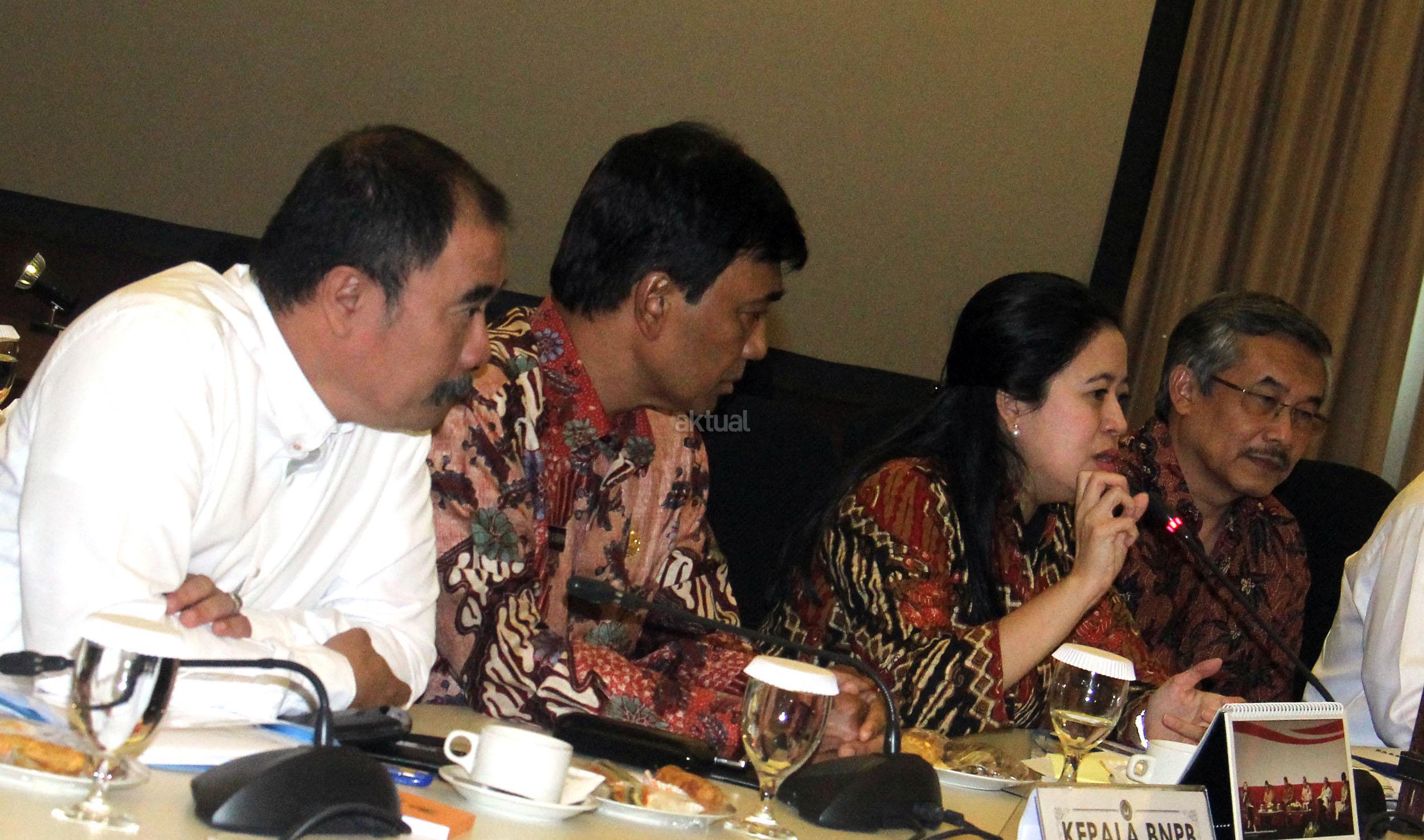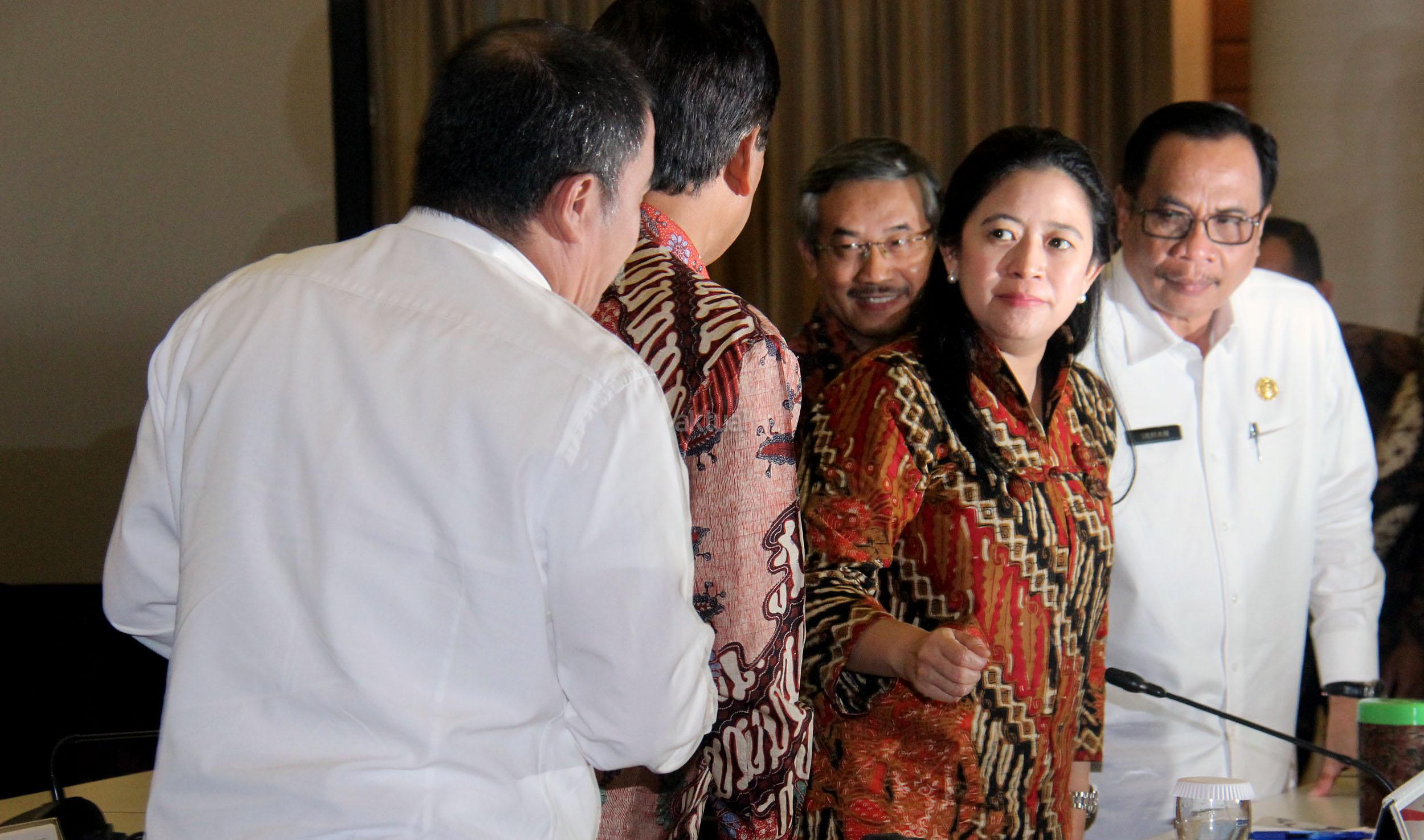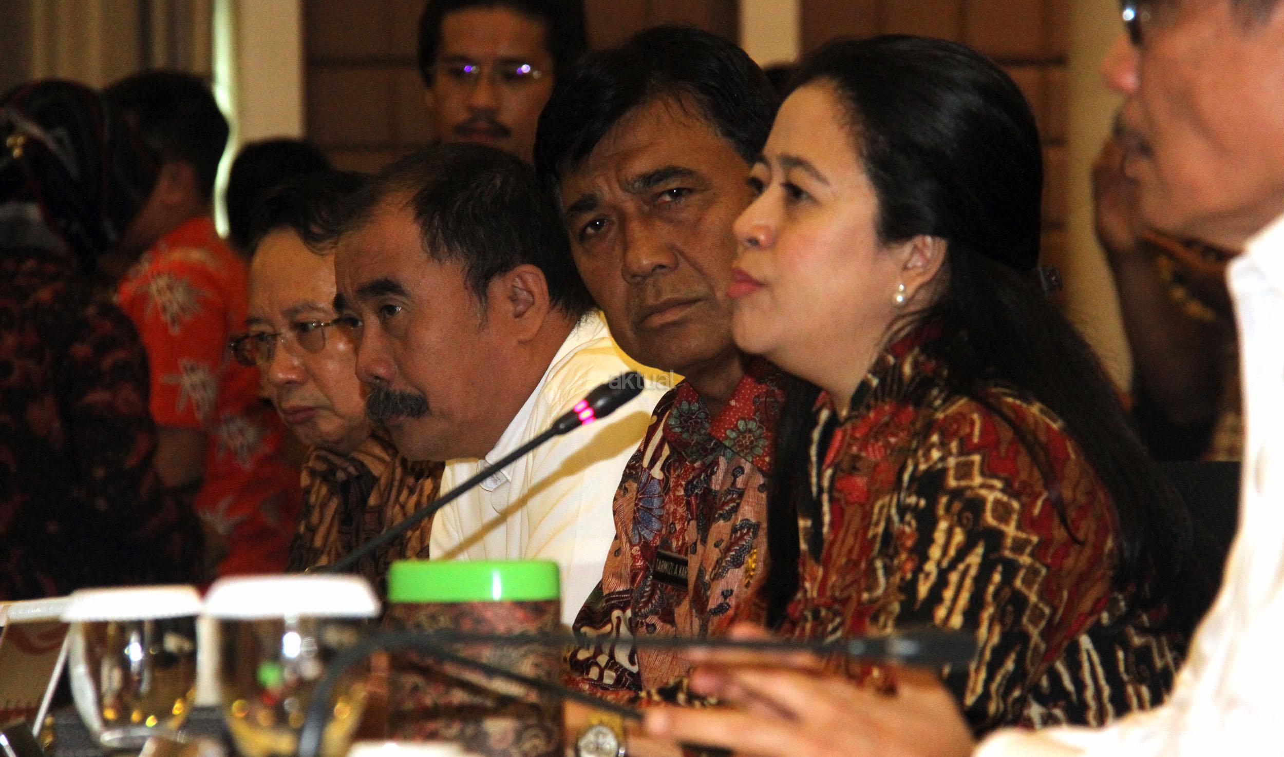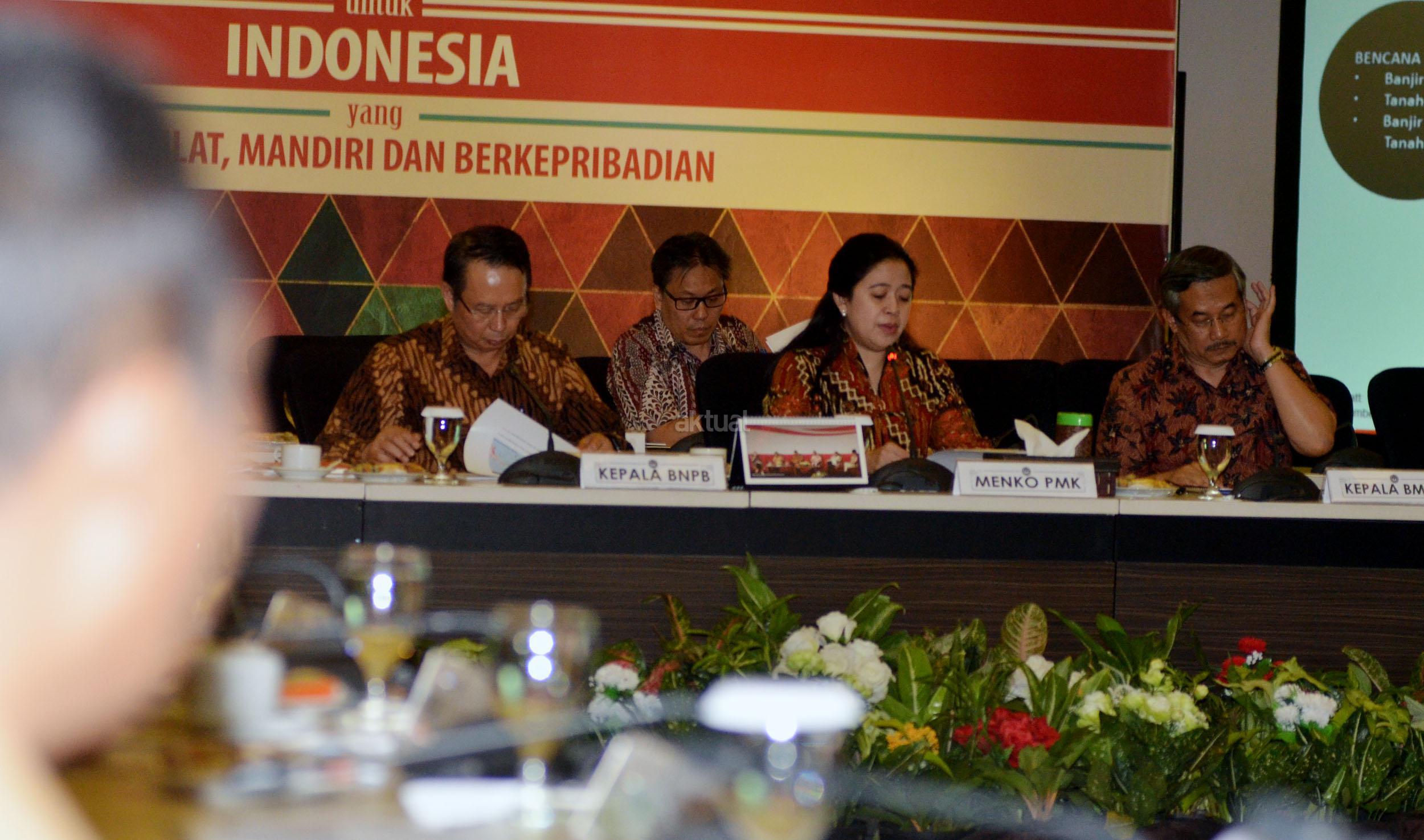 Menteri Koordinator Bidang Pembangunan Manusia dan Kebudayaan Puan Maharani (tengah) memimpin rapat rapat koordinasi tentang ” Siaga Darurat Banjir dan Tanah Longsor” di kantor Menko PMK, Jakarta, Jumat (13/11/2015). Rakor ini diadakan untuk mencegah timbulnya korban jiwa yang lebih besar akibat banjir dan tanah longsor. Mengingat, Indonesia saat ini sudah memasuki musim penghujan.