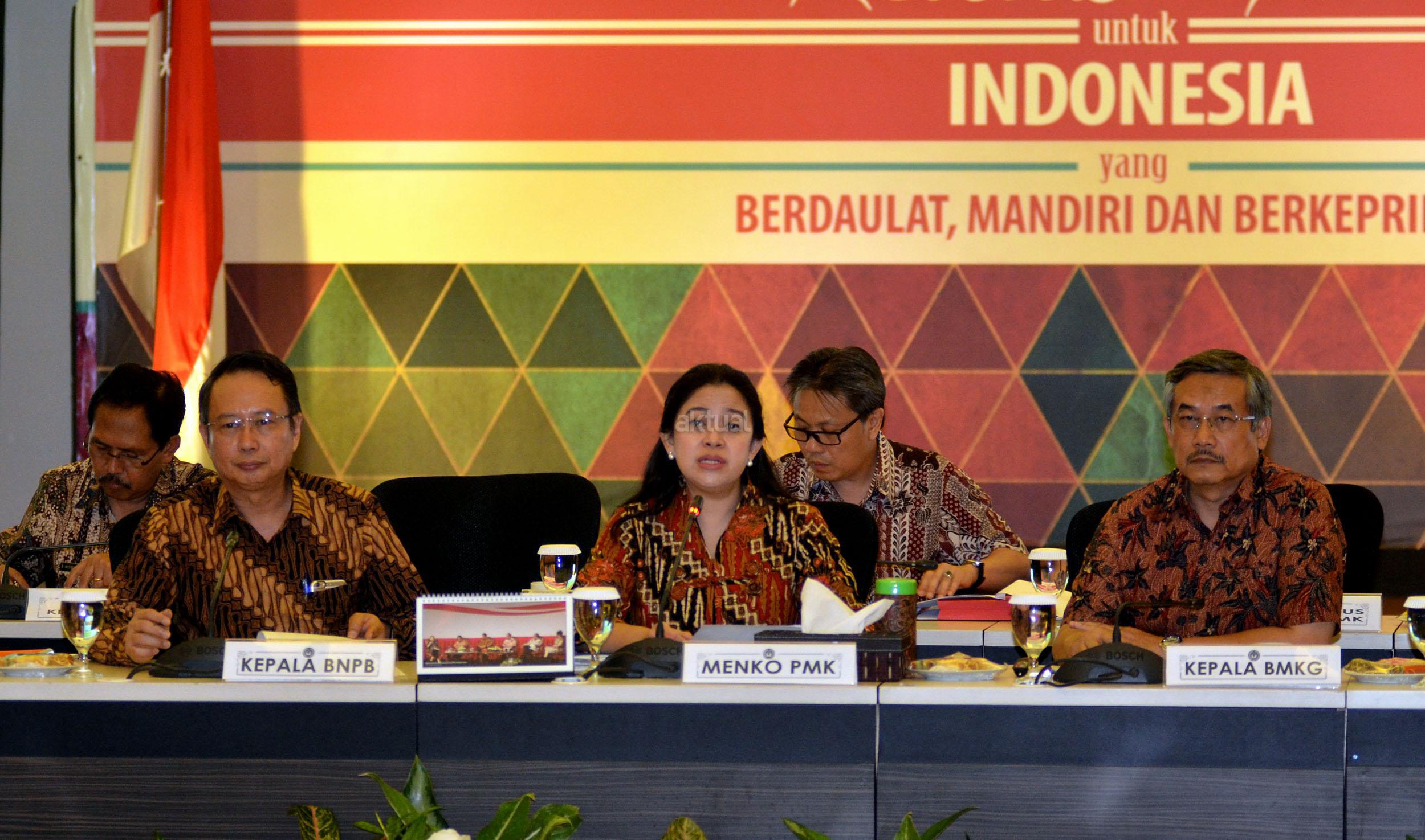 Kiri-kanan ; Kepala Badan Metereologi Klimatologi dan Geofisika Andi Eka Sakya, Menteri Koordinator Bidang Pembangunan Manusia dan Kebudayaan Puan Maharani (tengah), Kepala Badan Nasional Penanggulangan Bencana Willem Rampangilei, memimpin rapat rapat koordinasi tentang ” Siaga Darurat Banjir dan Tanah Longsor” di kantor Menko PMK, Jakarta, Jumat (13/11/2015). Rakor ini diadakan untuk mencegah timbulnya korban jiwa yang lebih besar akibat banjir dan tanah longsor. Mengingat, Indonesia saat ini sudah memasuki musim penghujan.