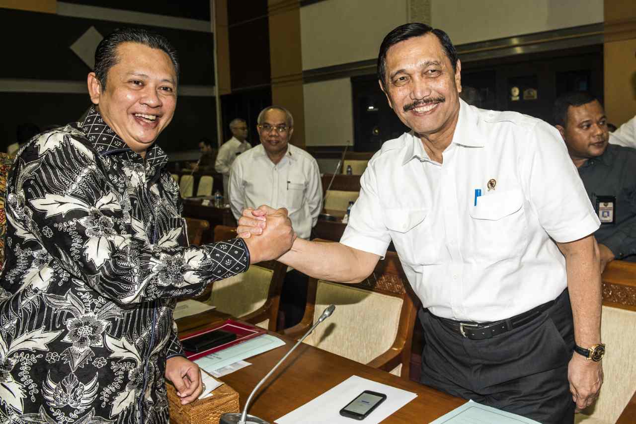 Menteri Koordinator bidang Politik, Hukum dan Keamanan Luhut Binsar Pandjaitan (kanan) berjabat tangan dengan Ketua Komisi III DPR Bambang Soesatyo (kiri) sebelum rapat kerja di Komplek Parlemen Senayan, Jakarta, Kamis (21/7). Rapat kerja tersebut membahas pemberian amnesti dan abolisi kepada kelompok Din Minimi atau Nurdin bin Ismail Amat alias Nurdin Abu Minimi. ANTARA FOTO/M Agung Rajasa/nz/16