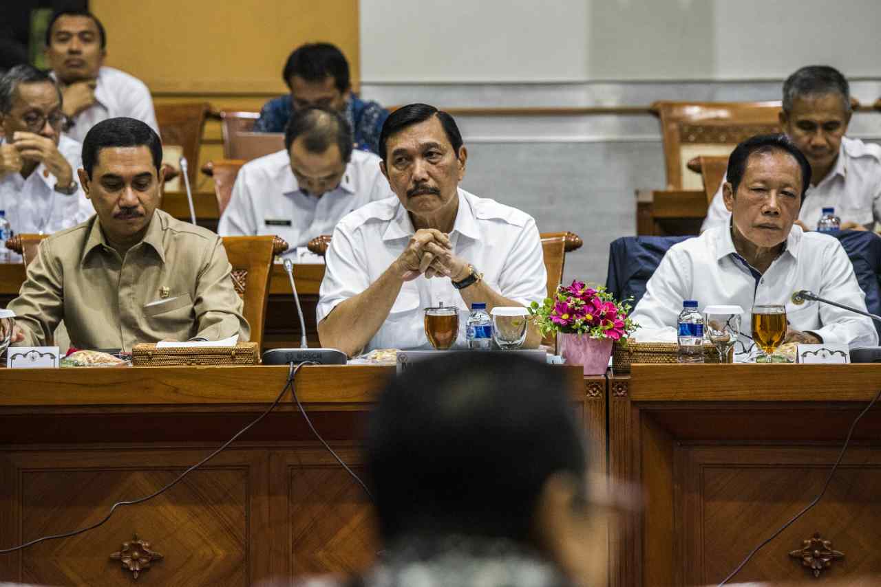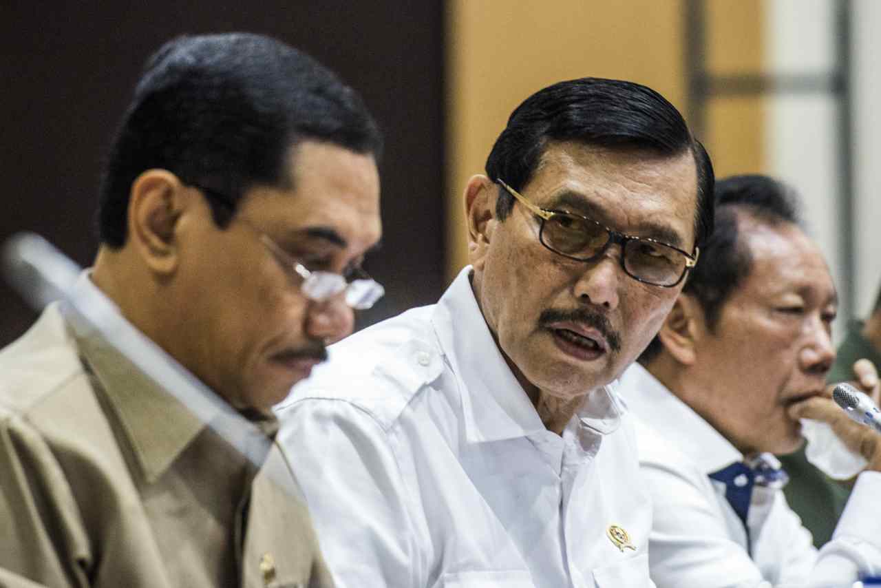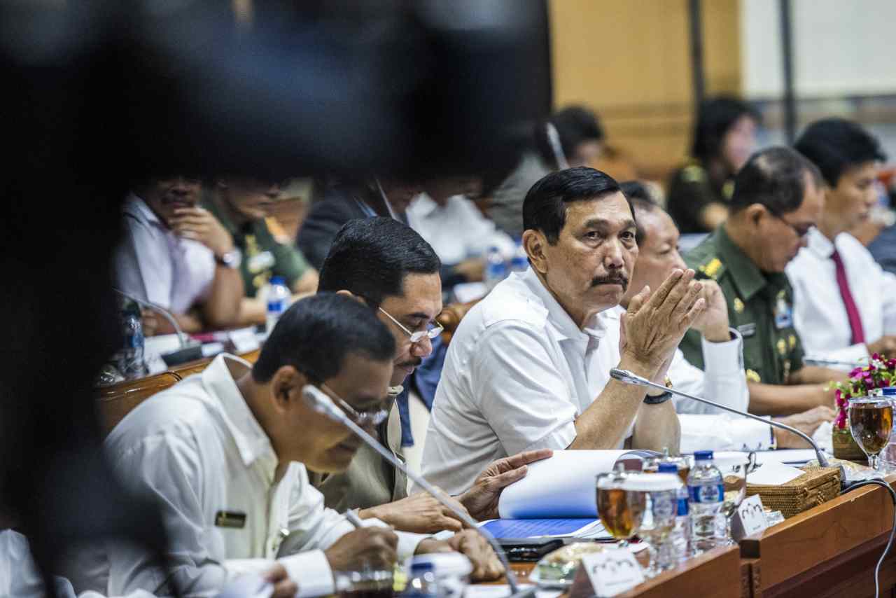 Menteri Koordinator bidang Politik, Hukum dan Keamanan Luhut Binsar Pandjaitan (tengah) menghadiri rapat kerja dengan Komisi III di Komplek Parlemen Senayan, Jakarta, Kamis (21/7). Rapat kerja tersebut membahas pemberian amnesti dan abolisi kepada kelompok Din Minimi atau Nurdin bin Ismail Amat alias Nurdin Abu Minimi. ANTARA FOTO/M Agung Rajasa/nz/16