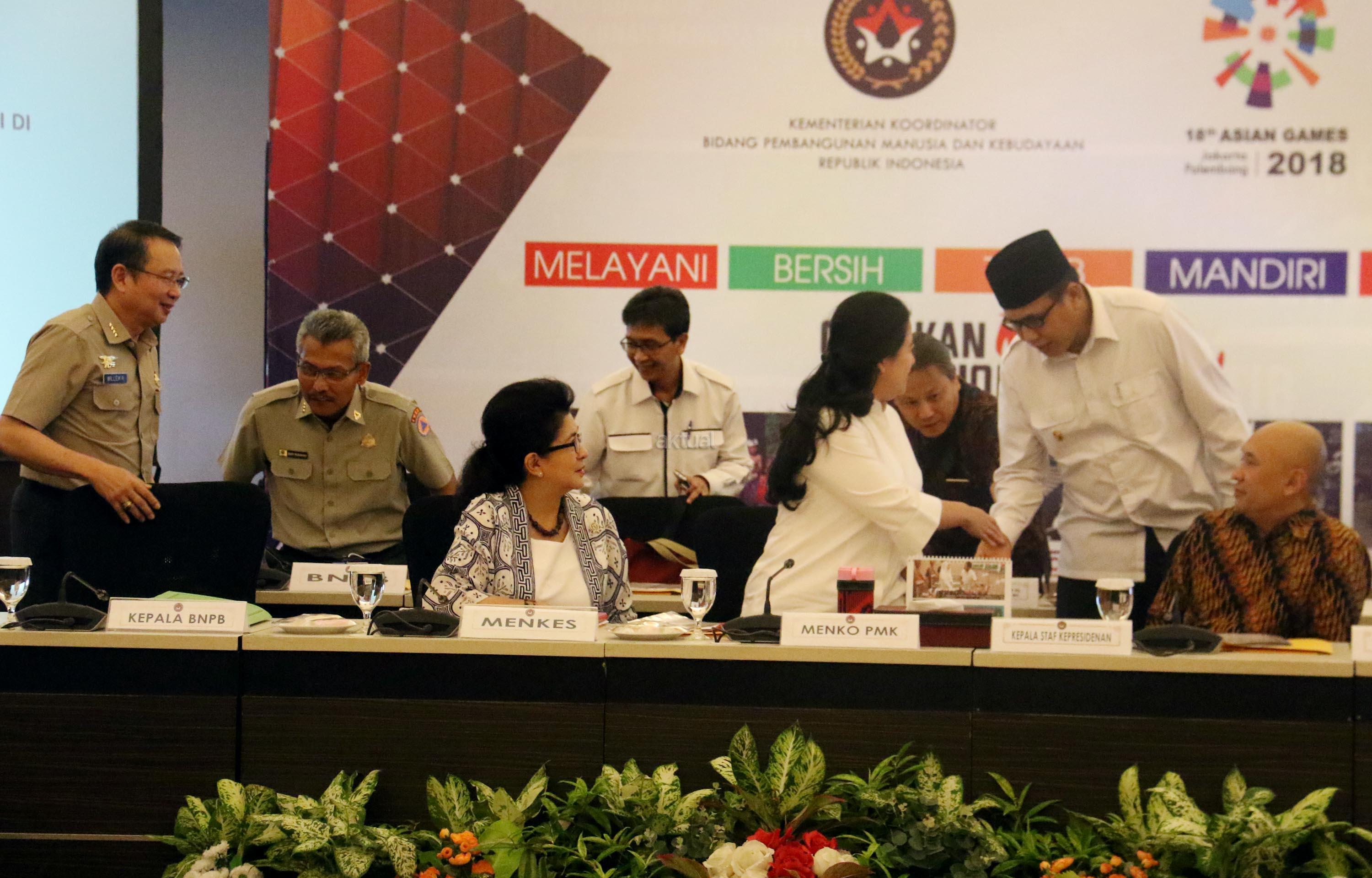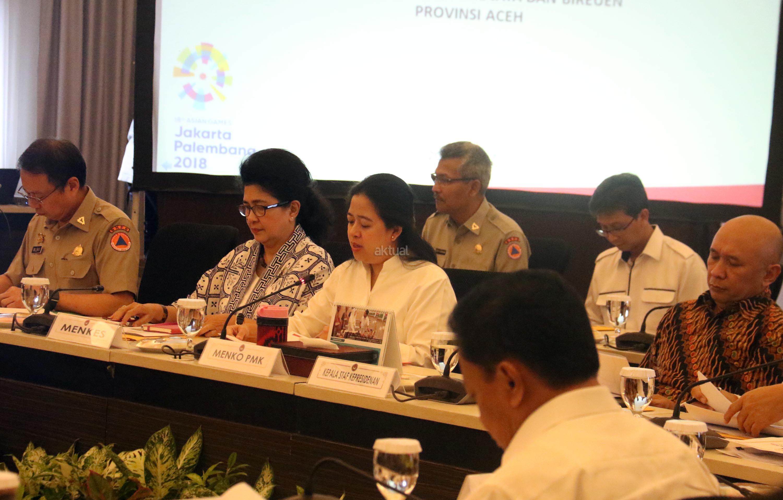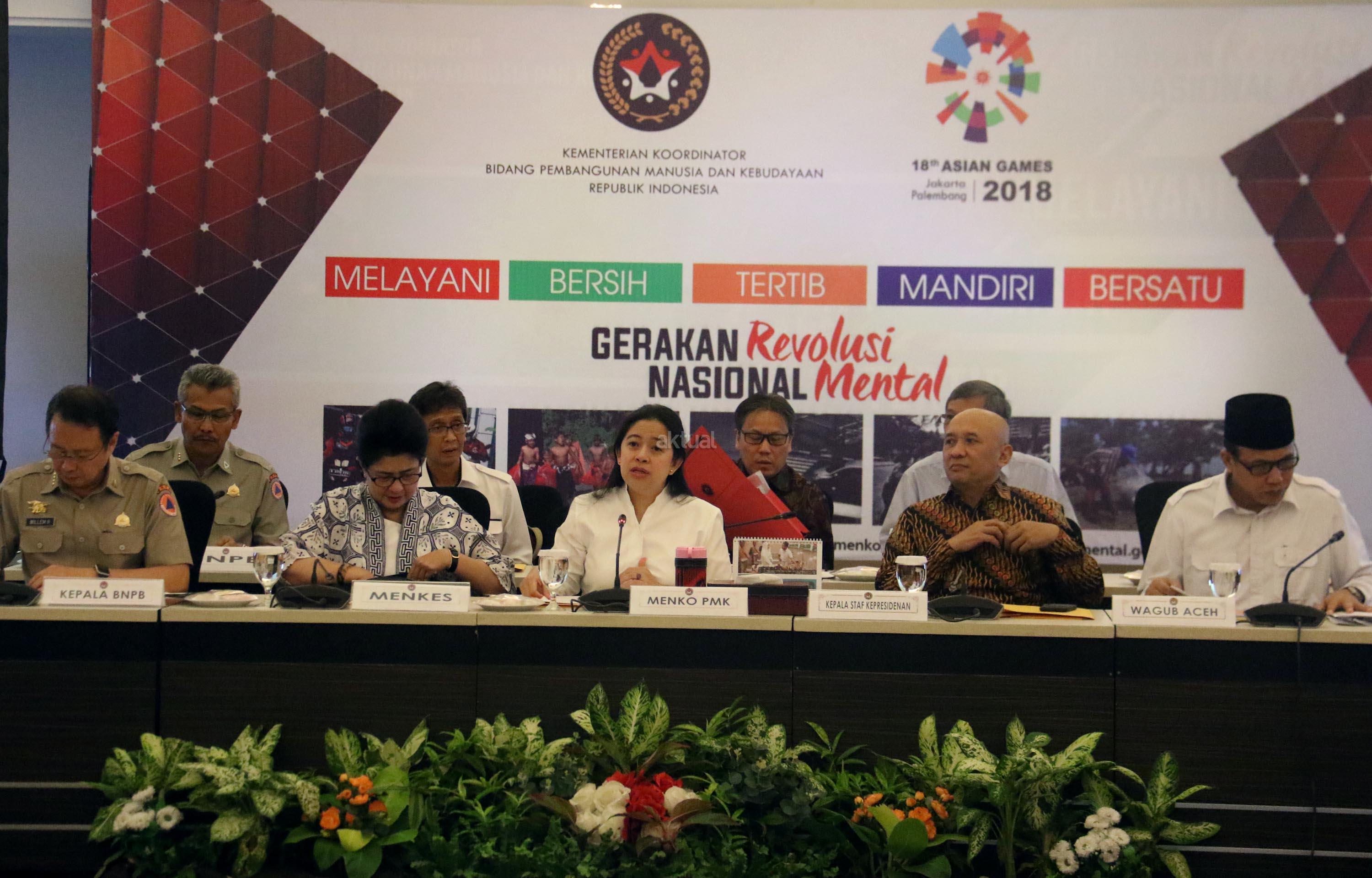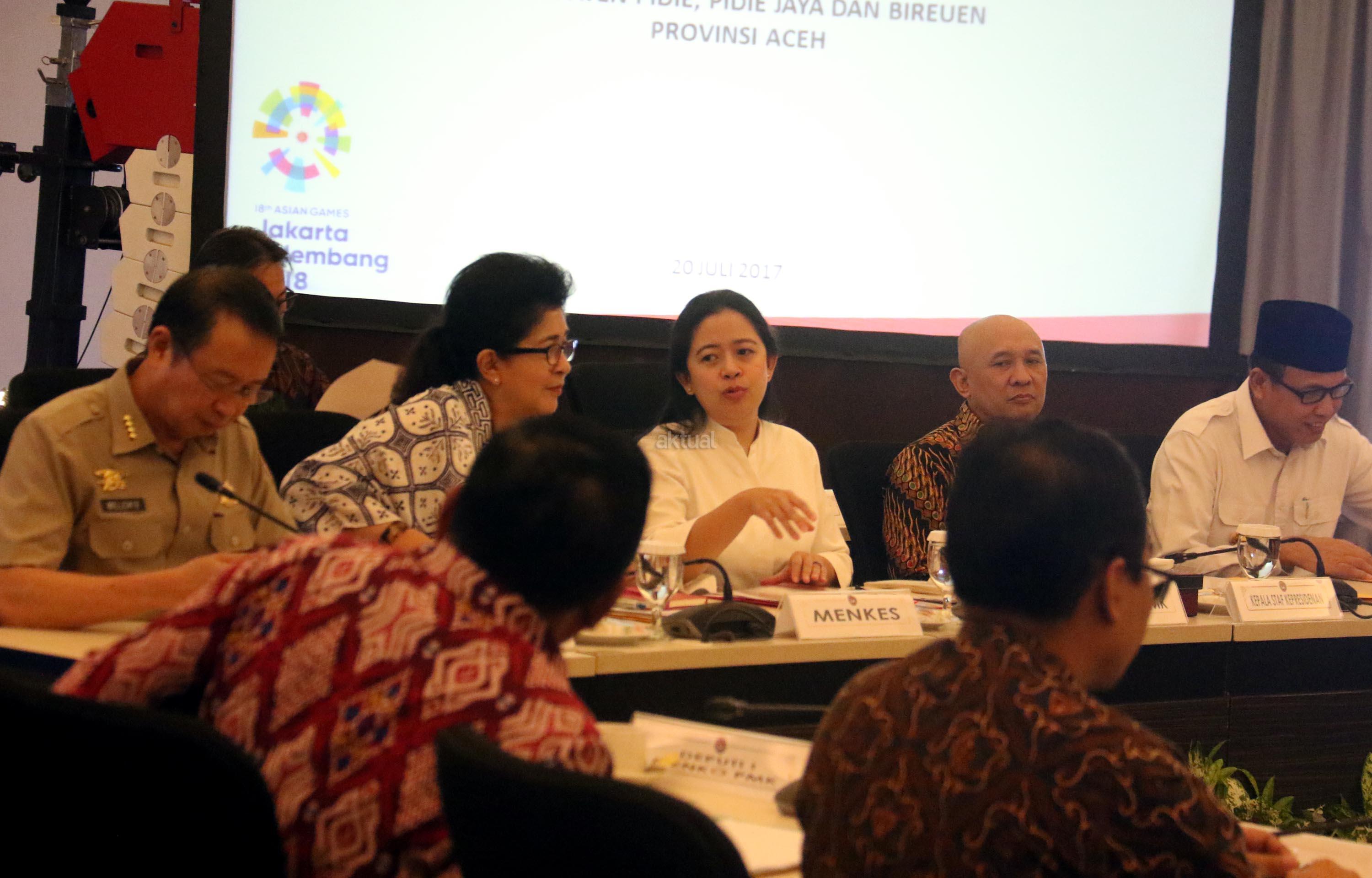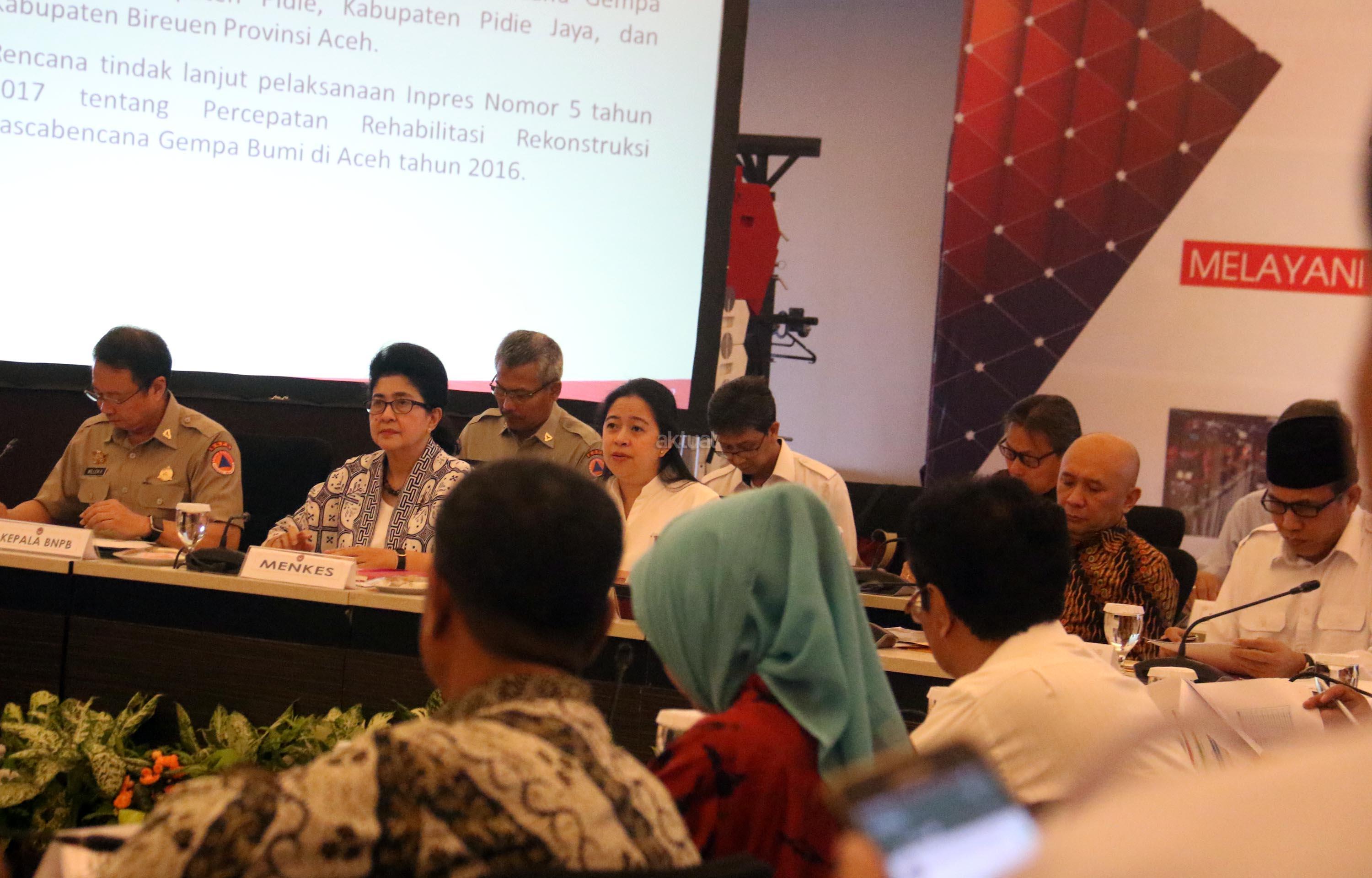 Menko PMK Puan Maharani (tengah) di dampingi Kepala BNPB Willem Rampangilei, Menkes Nila Djuwita , Kepala Staf Keprisidenan Teten Masduki dan Wakil Gubenur Aceh Nova Iriansyah saat memimpin Rapat Koordinasi Tingkat Menteri (RTM) di kantor PMK, Jakarta, Kamis (20/7/2017). Rakor Tingkat Menteri (RTM) membahas Percepatan Kegiatan Rehabilitasi dan Rekonstruksi Pasca Bencana. AKTUAL/Munzir