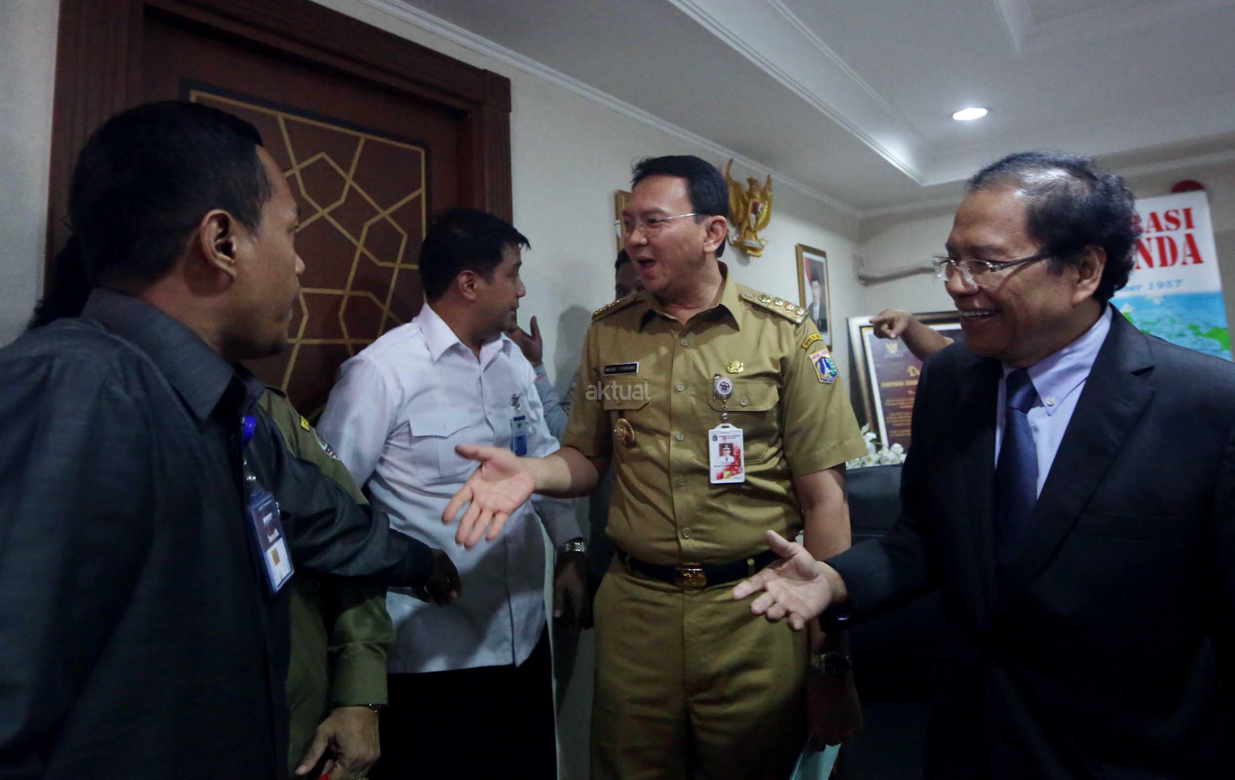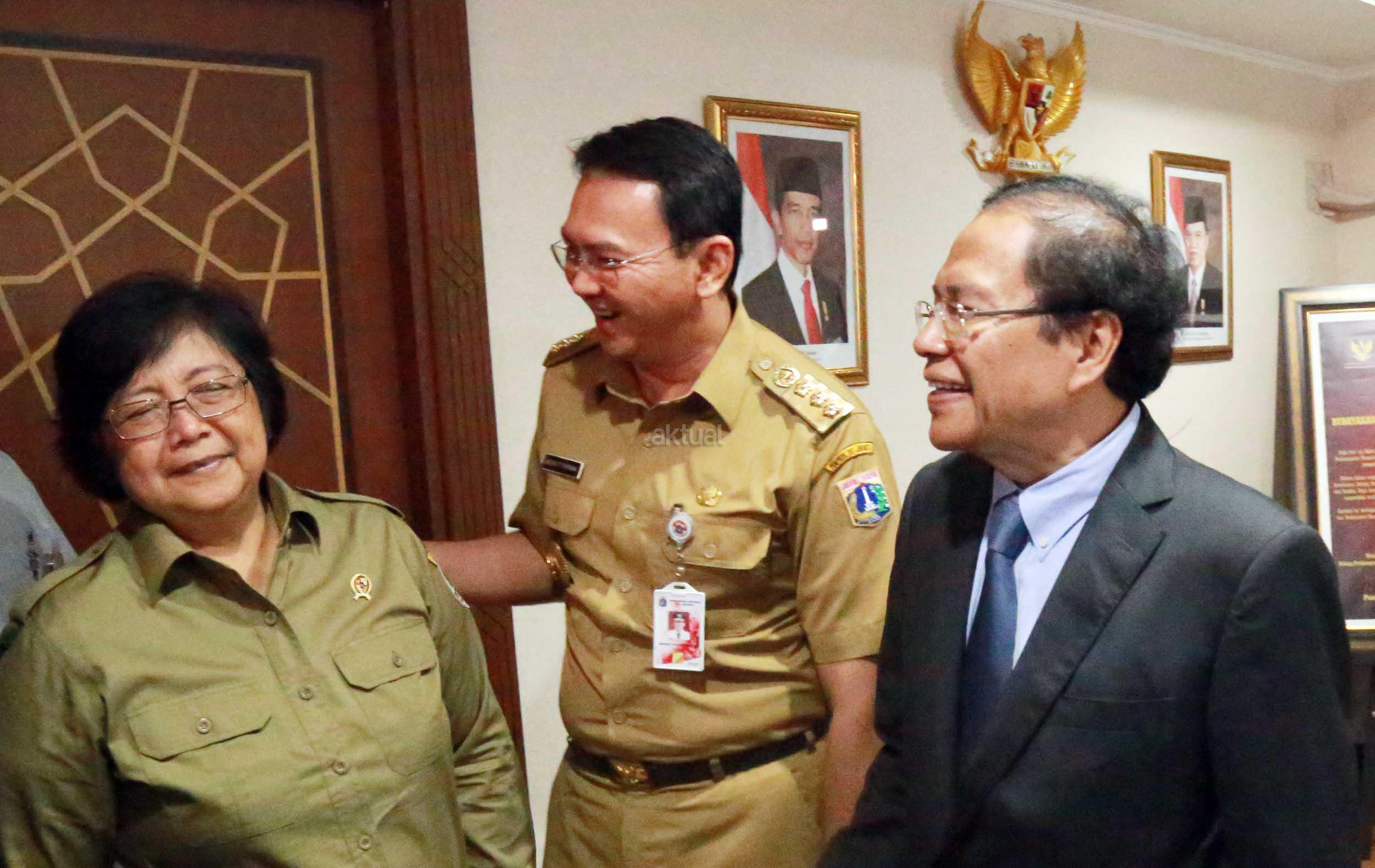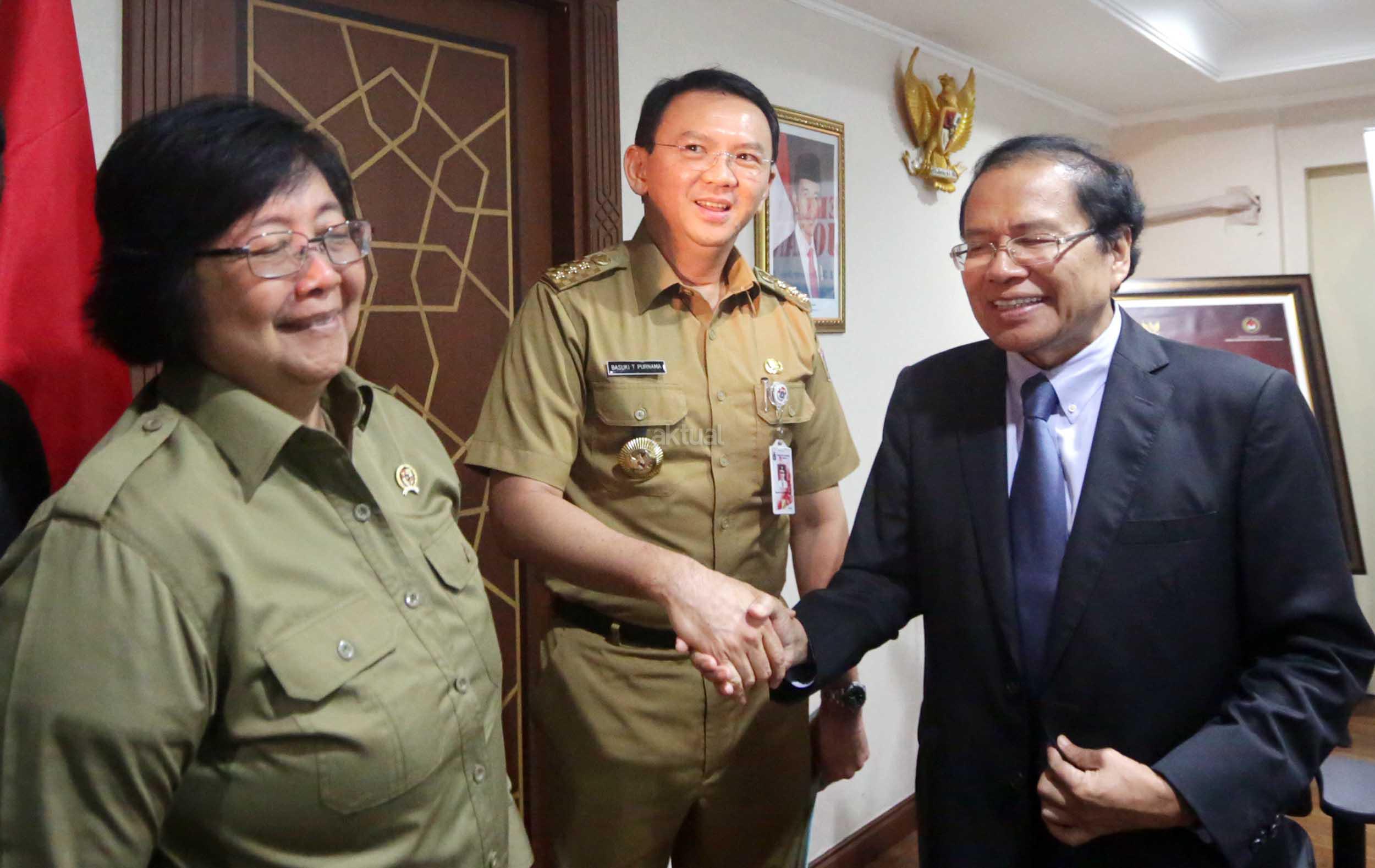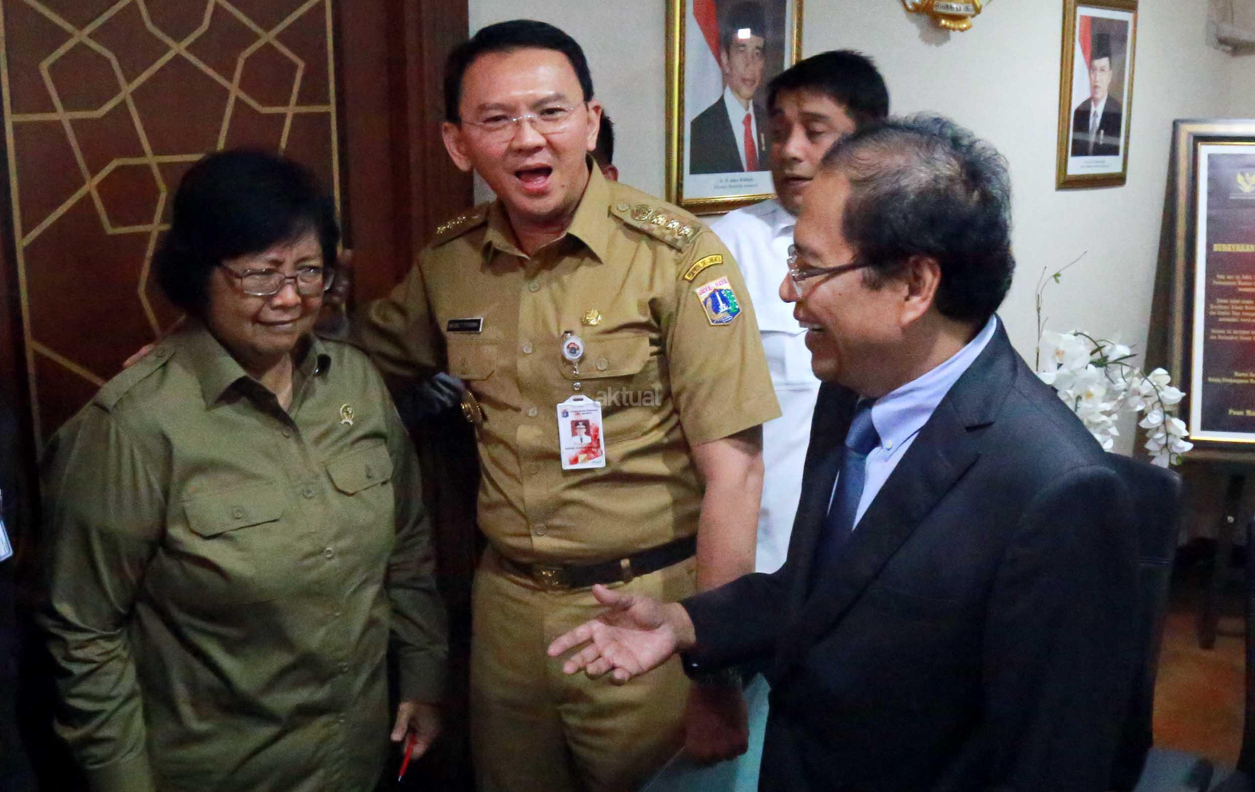 Menteri Koordinator Maritim dan Sumber Daya Rizal Ramli (kanan) berbincang bersama Menteri Lingkungan Hidup dan Kehutanan Siti Nurbaya (kiri) dan Gubernur DKI Jakarta Basuki Tjahaja Purnama (tengah) sebelum memulai rapat koordinasi Kementerian/Lembaga dan Gubernur DKI Jakarta di Gedung Kemenko Maritim, Jakarta, Senin (18/4/2016). Rapat yang dilakukan secara tertutup tersebut membahas mengenai "Reklamasi Pantai Utara Jakarta".