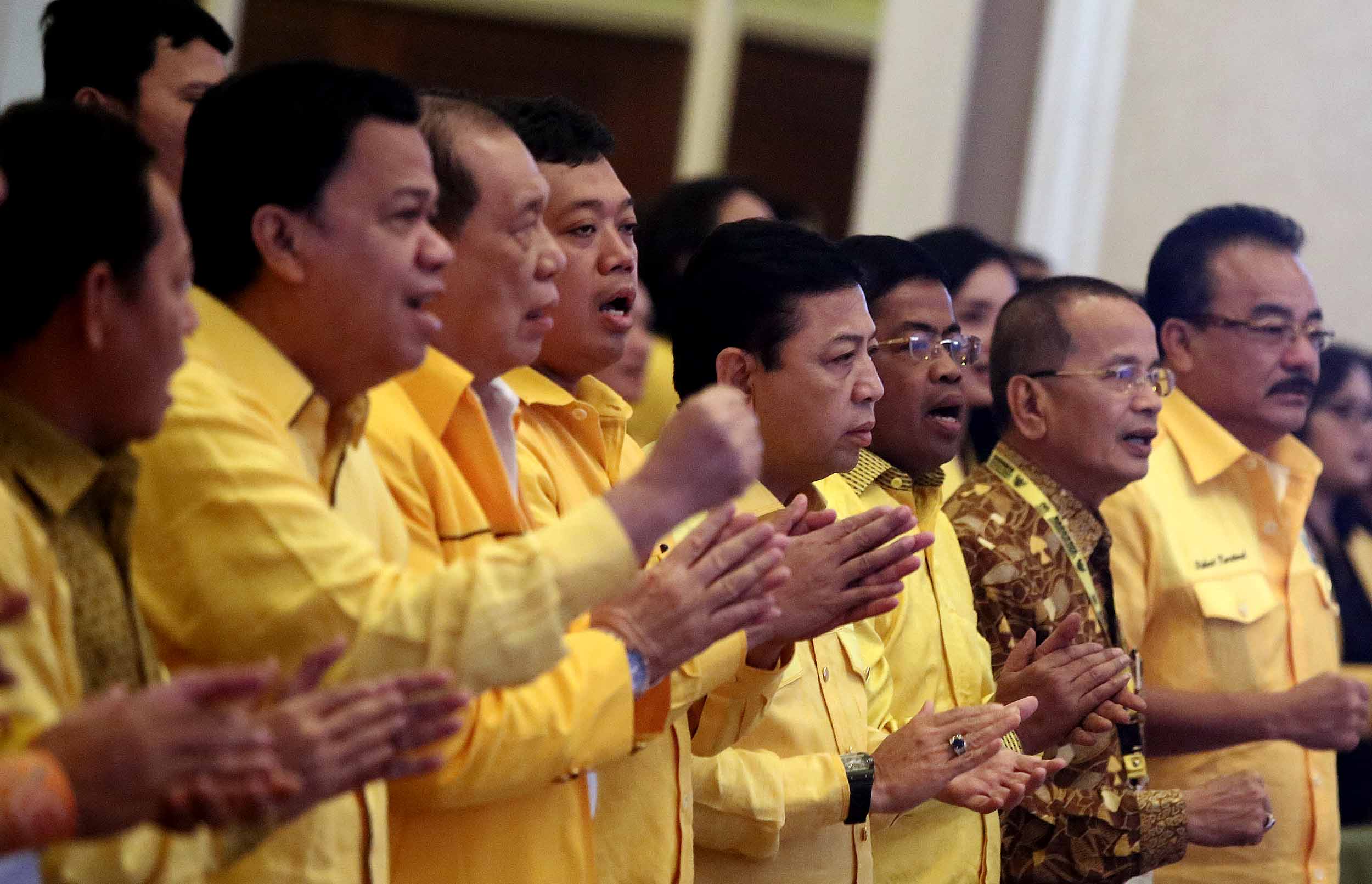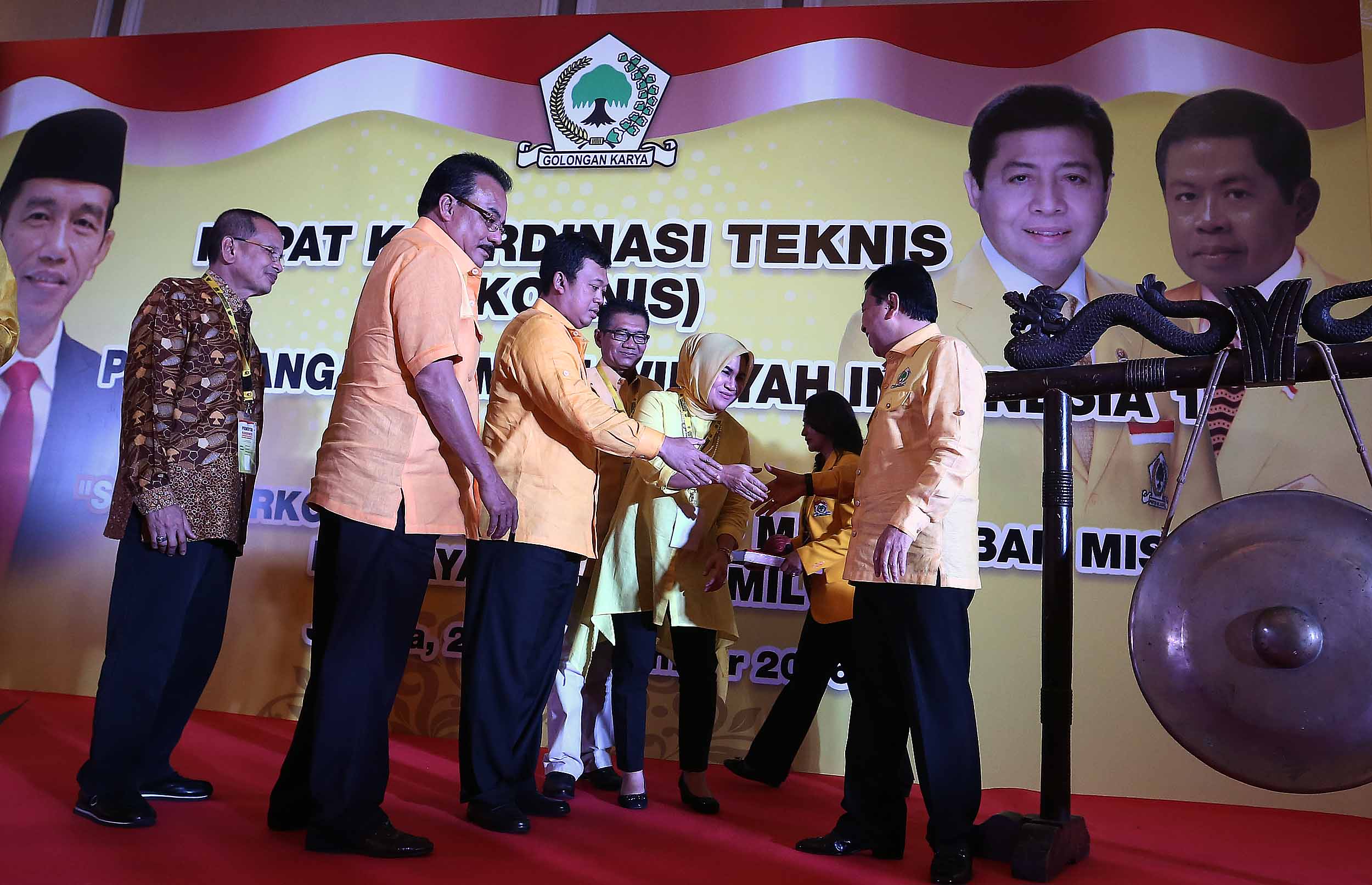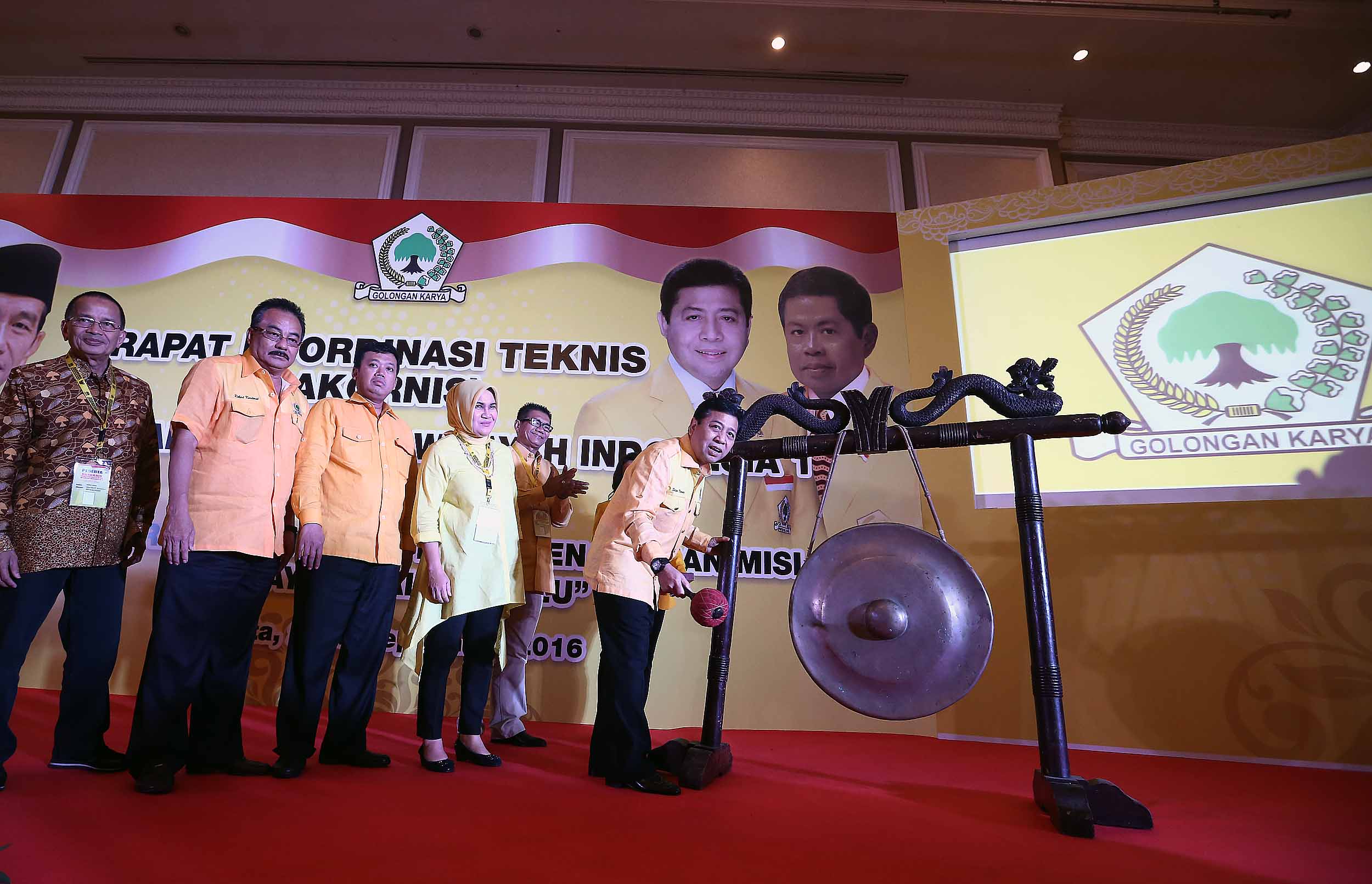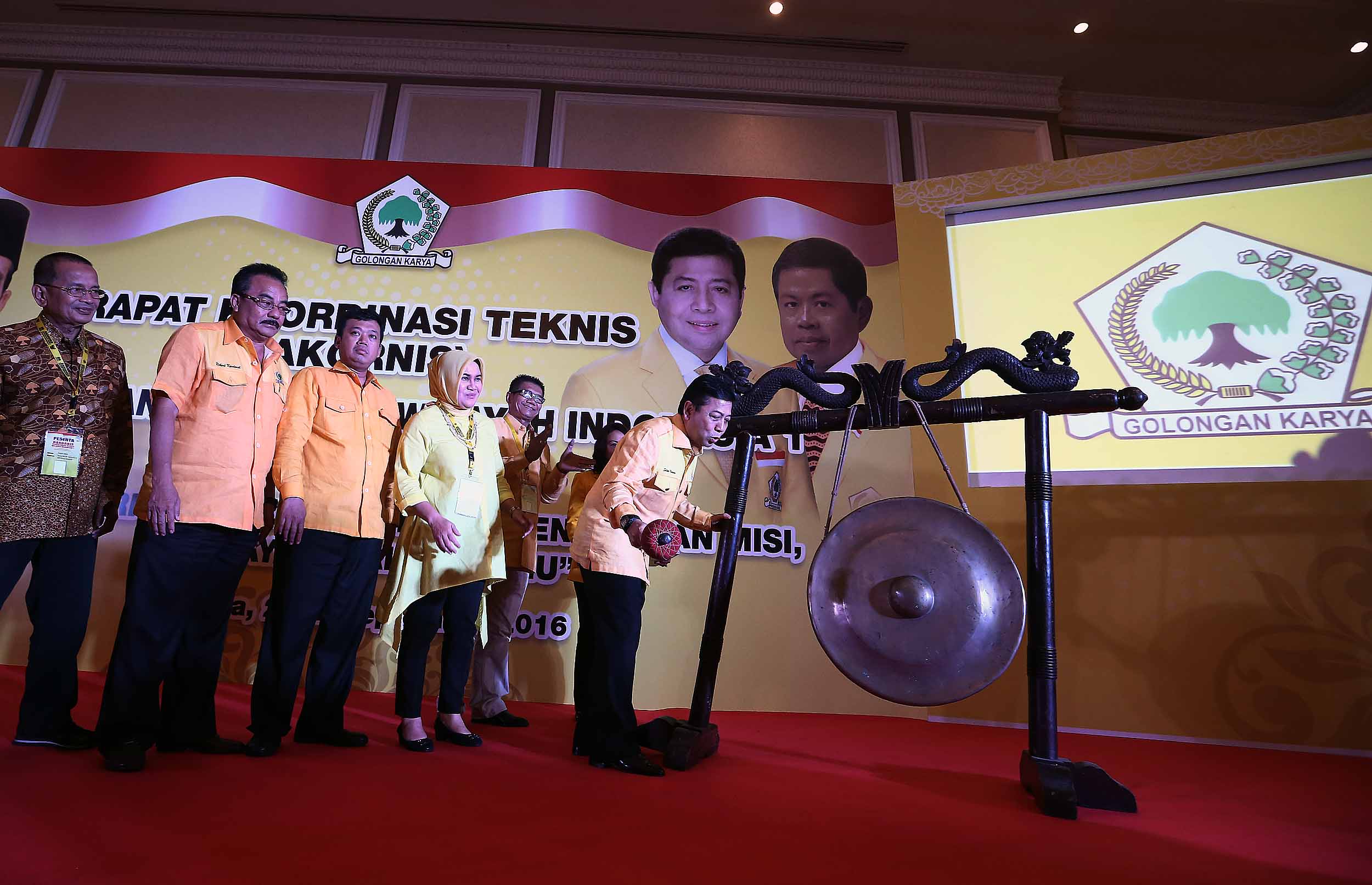 Ketua Umum DPP Partai Golkar Setya Novanto memukul gong dan sekaligus membuka rapat koordinasi teknis (Rakornis) Pemenangan Pemilu Wilayah Indonesia I Partai Golkar di Jakarta, Jumat (2/9/2016). Kegiatan untuk persiapan pemenangan Pilkada dan Pemilu tersebut mengangkat tema Solid, Terkonsolidasi, Efektif Mengemban Misi, Berjaya di Kala Pemilu.