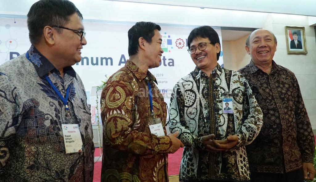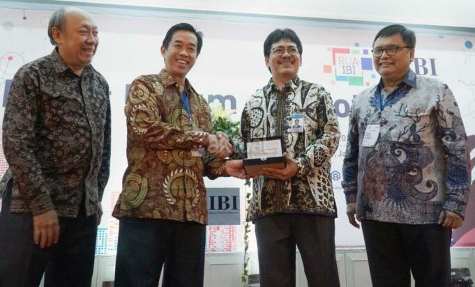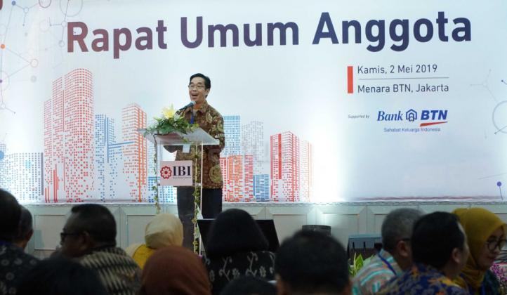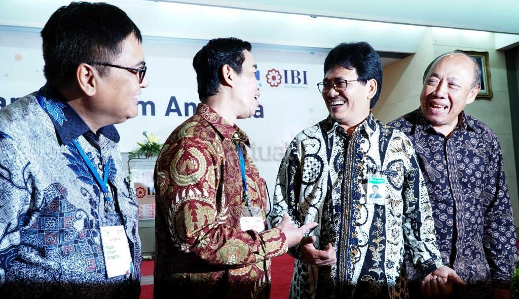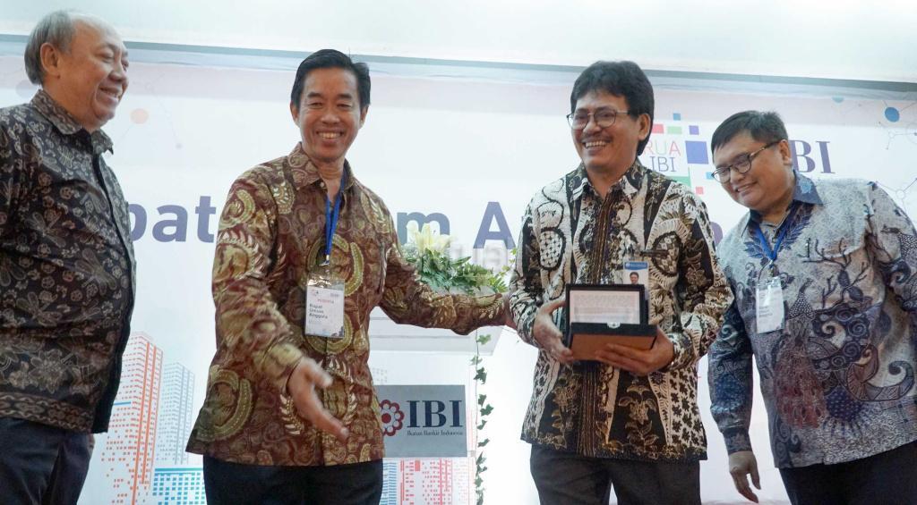 Direktur BTN Imam Nugroho Soeko (kanan) bersama Komisaris Utama BTN I Wayan Agus Mertayasa (kiri), Ketua IBI Zulkifli Zaini (kedua kiri) pada saat menyerahkan plakat kepada Kepala Departemen Surveilans Sistem Keuangan Budi Sudiatmaka mewakili Gubernur BI, di Jakarta, Kamis (2/5). Bankir Indonesia (IBI) menggelar Rapat Umum Anggota (RUA) IBI tahun 2019 untuk perubahan pengurus IBI periode 2019 sampai dengan 2023. AKTUAL/STR-Eko S Hilman