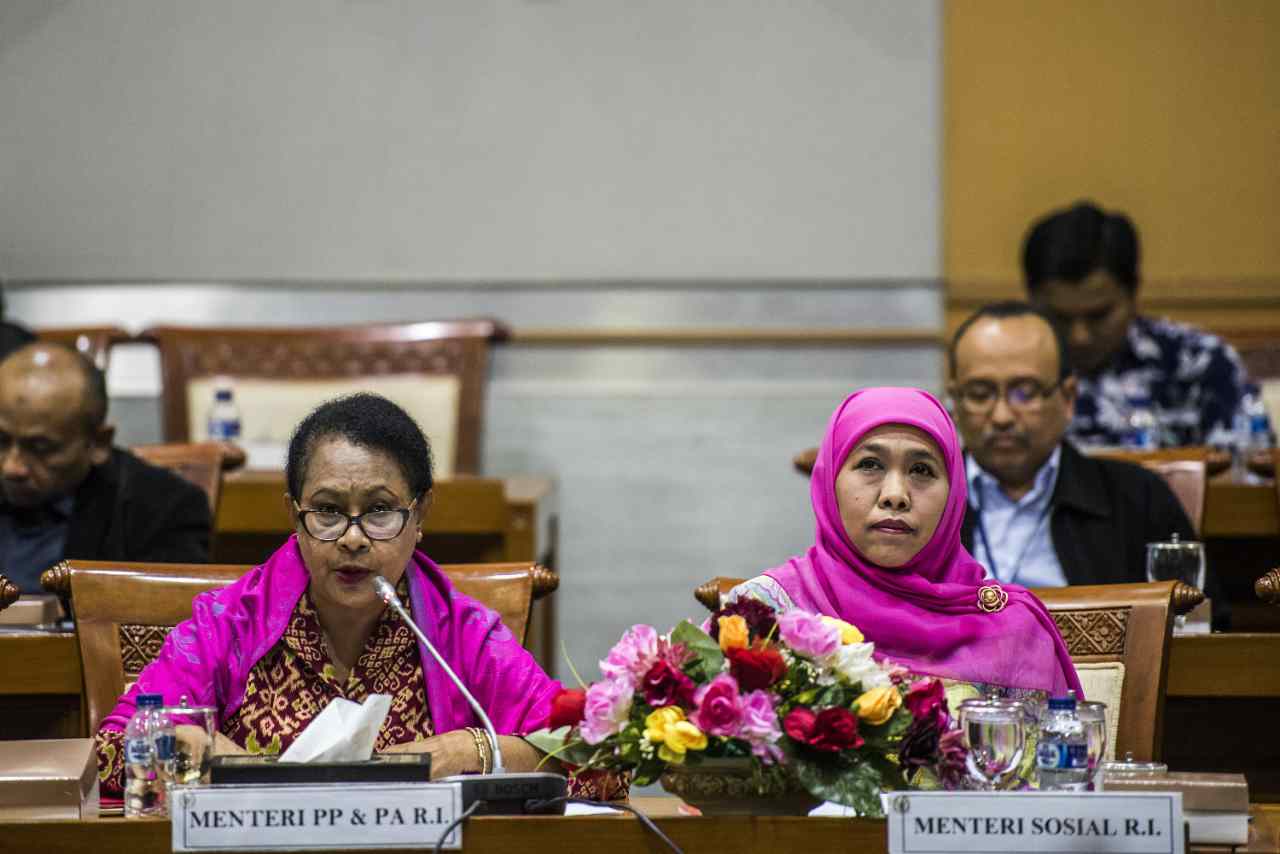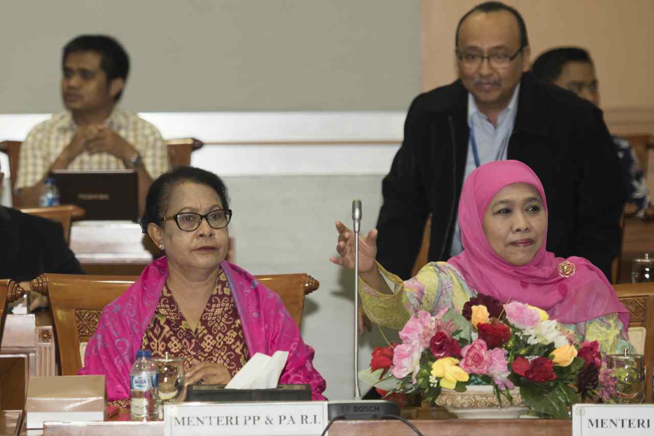 Mensos Khofifah Indar Parawansa (kanan) didampingi Menteri Pemberdayaan Perempuan dan Perlindungan anak Yohana Yambise (kiri) mengikuti rapat kerja dengan Komisi VIII di Komplek Parlemen, Senayan, Jakarta, Kamis (21/7). Rapat kerja tersebut membahas keterangan Pemerintas atas penetapan Perppu No. 1 Tahun 2016 tentang Perubahan Kedua atas UU No. 23 Tahun 2002 tentang Perlindungan Anak. ANTARA FOTO/M Agung Rajasa/nz/16