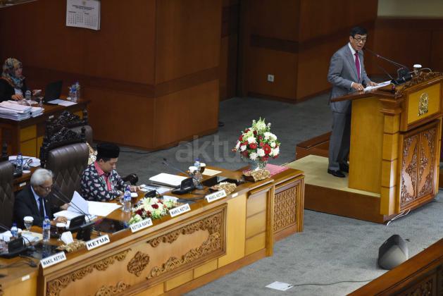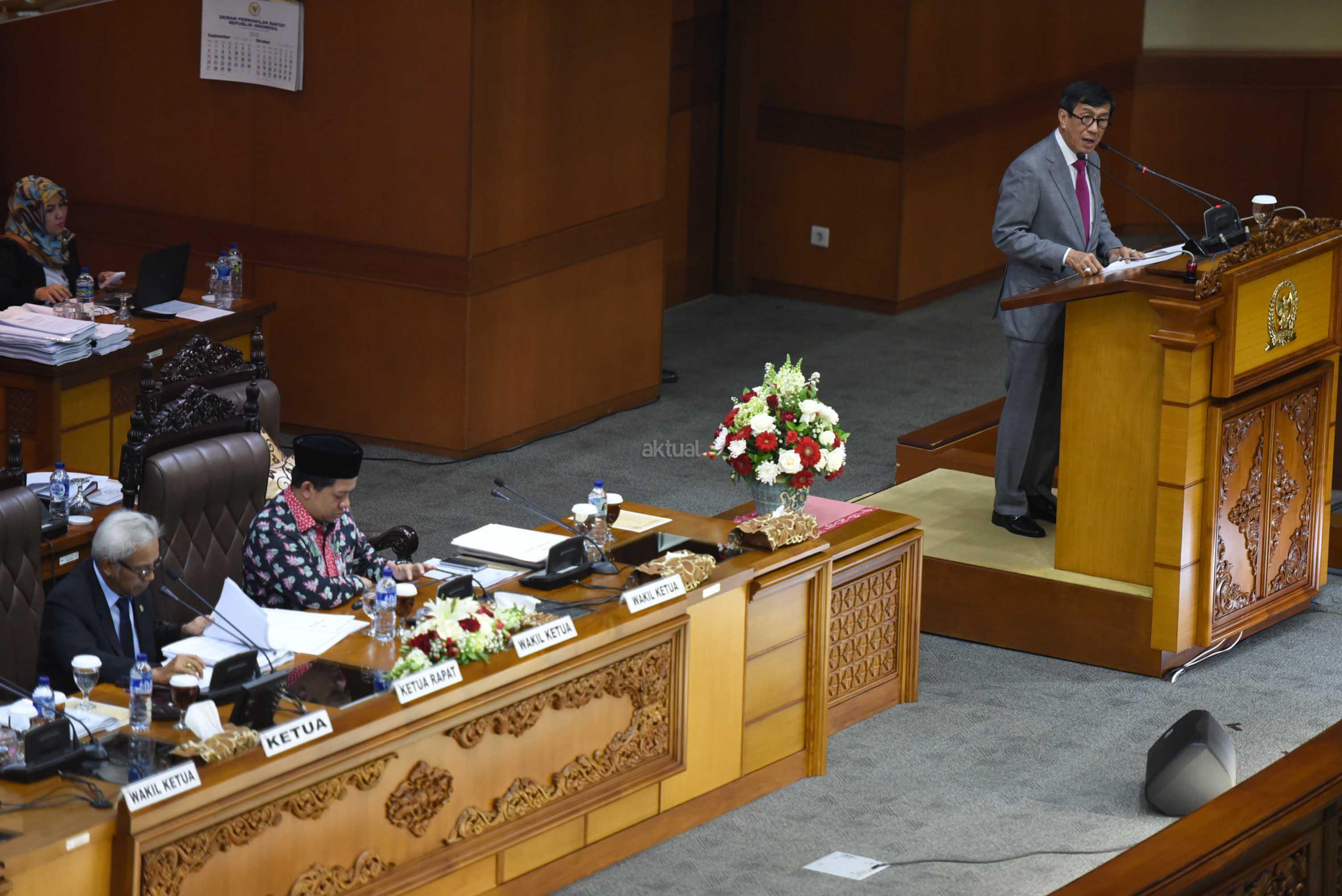 Menkumham Yasonna Laoly (kanan) menyampaikan pandangan akhir pemerintah disaksikan Wakil Ketua DPR Agus Hermanto (kiri) dan Wakil Ketua DPR Fahri Hamzah (kedua kiri) saat Rapat Paripurna DPR di Kompleks Parlemen Senayan, Jakarta, Selasa (20/10). DPR mengesahkan RUU tentang pengesahan perjanjian bantuan timbal balik dalam masalah pidana antara Republik Indonesia dan Republik Sosialis Vietnam menjadi Undang-Undang.