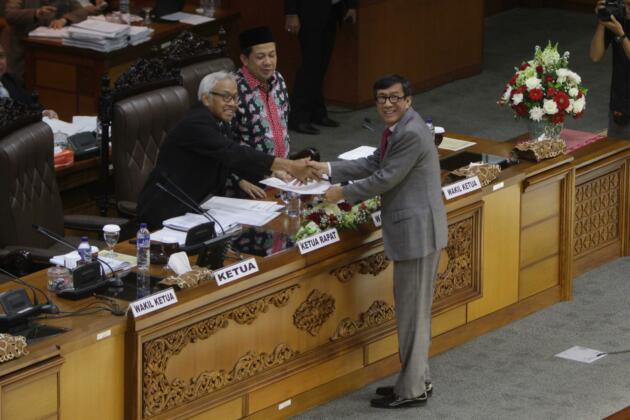Menkumham Yasonna Laoly (kanan) berjabat tangan dengan Wakil Ketua DPR Agus Hermanto (kiri) disaksikan Wakil Ketua DPR Fahri Hamzah (kedua kiri) usai memberikan pandangan akhir pemerintah saat Rapat Paripurna DPR di Kompleks Parlemen Senayan, Jakarta, Selasa (20/10). DPR mengesahkan RUU tentang pengesahan perjanjian bantuan timbal balik dalam masalah pidana antara Republik Indonesia dan Republik Sosialis Vietnam menjadi Undang-Undang.