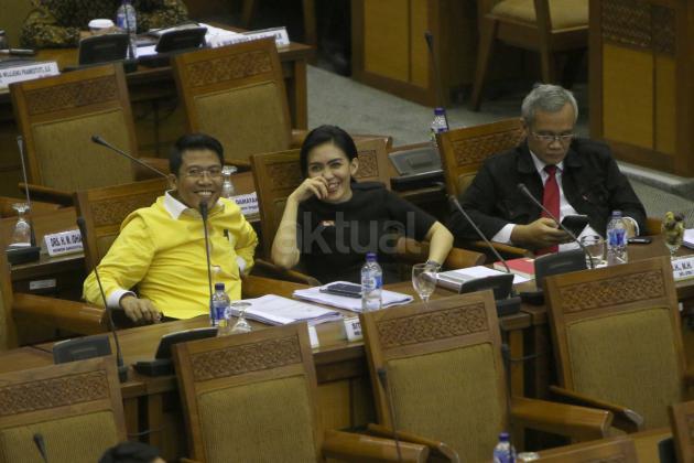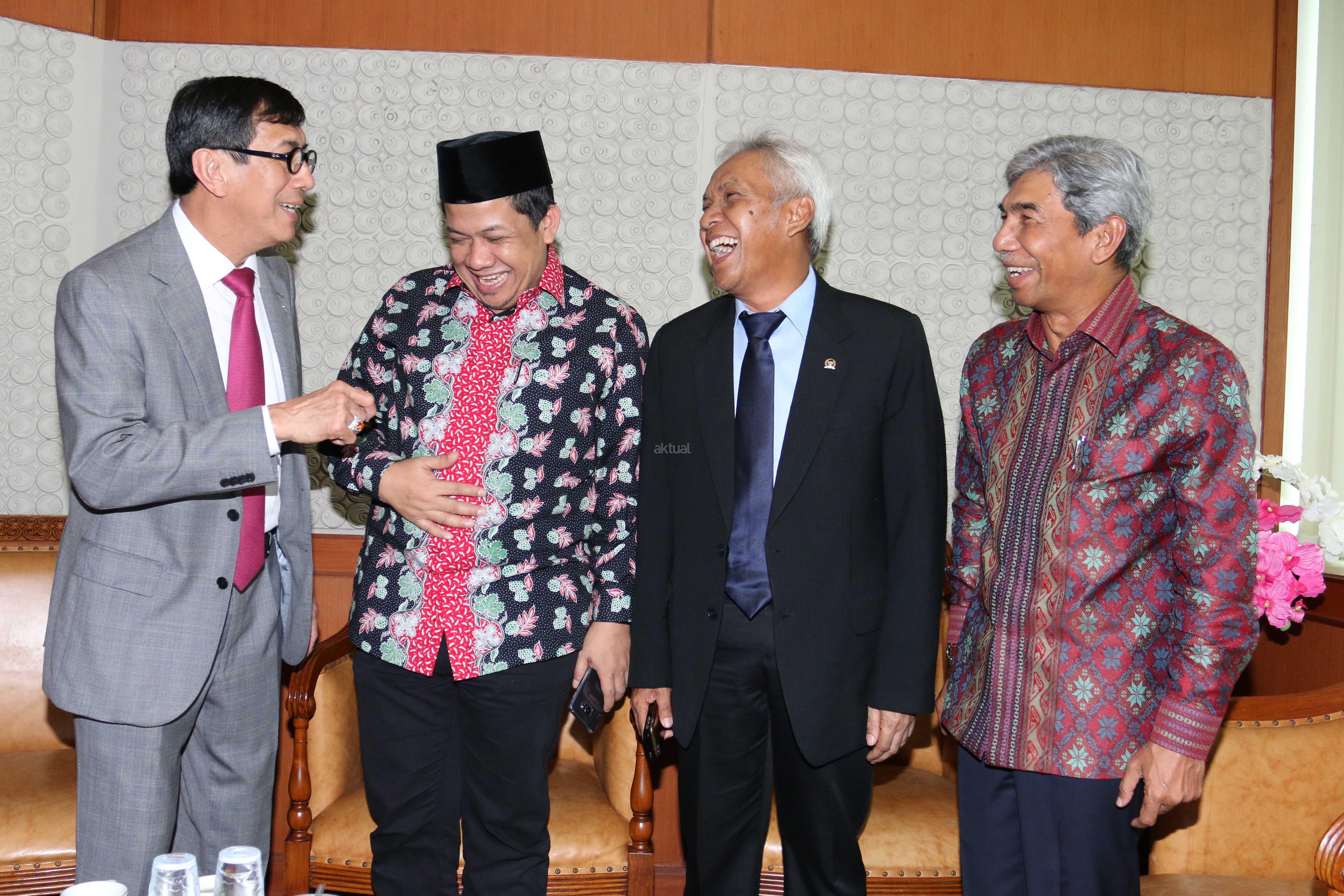 Menkumham Yasonna Laoly (kiri) berbincang dengan Wakil Menlu A.M Fachir (kanan), Wakil Ketua DPR Agus Hermanto (kedua kanan) dan Wakil Ketua DPR Fahri Hamzah (kedua kiri) sebelum Rapat Paripurna DPR di Kompleks Parlemen Senayan, Jakarta, Senin (20/10). DPR mengesahkan RUU tentang pengesahan perjanjian bantuan timbal balik dalam masalah pidana antara Republik Indonesia dan Republik Sosialis Vietnam menjadi Undang-Undang.