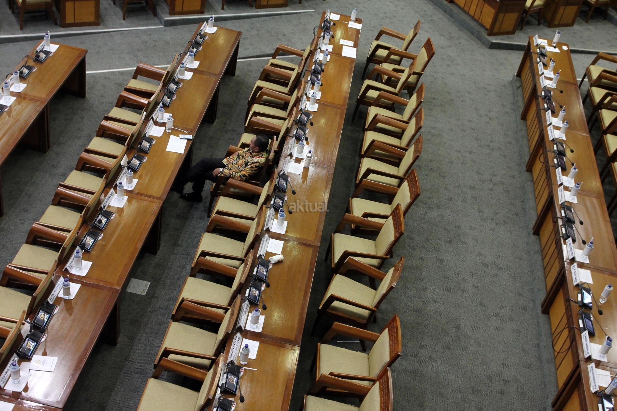 Anggota DPR duduk diantara bangku kosong saat mengikuti Rapat Paripurna, di Gedung Nusantara II, Kompleks Parlemen, Jakarta, Rabu (14/2). Rapat Paripurna ynag diantaranya mendengarkan Laporan Panitia Angket DPR RI Tentang Pelakasanaan Tugas dan Wewenang KPK dan Pidato penutupan sidang tersebut, diikuti kurang dari setengah anggota yang hadir dalam ruangan.AKTUAL/Tino Oktaviano
