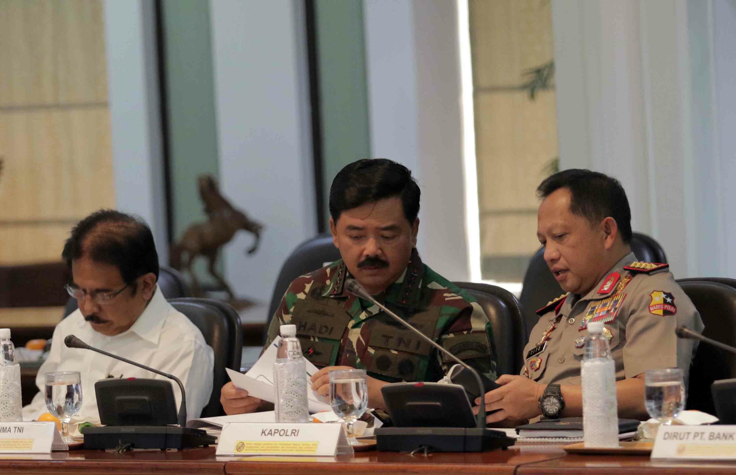 Panglima TNI Marsekal Hadi Tjahjanto berbincang dengan Kapolri Jend Pol Tito Karnavian saa rapat terbatas membahas percepatan pengadaan rumah tinggal bagi aparatur sipil negara (ASN/PNS), TNI dan Polri di Istana, Senin (16/4). Sebanyak 945 ribu ASN, 275 ribu prajurit TNI dan 360 ribu anggota Polri yang belum memiliki rumah bersifat permanen. Hadir dalam acara Ketua Dewan Komisioner OJK dan sejumlah Dirut Bank BUMN, Dirut Bank bjb Ahmad Irfan, Dirut Bank DKI Kresno Sediarsi. AKTUAL/Istimewa