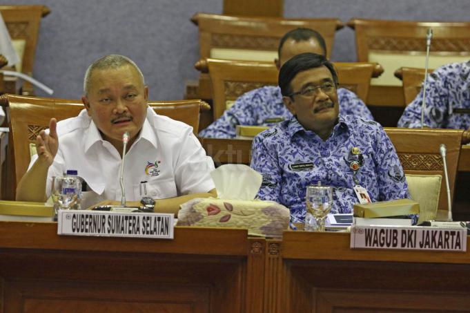 Gubernur Sumatera Selatan Alex Noerdin (kiri) bersama Wakil Gubernur DKI Jakarta Djarot Syaiful Hidayat (kanan) mengikuti Rapat Dengar Pendapat (RDP) dengan Komisi X DPR di Kompleks Parlemen Senayan, Jakarta, Senin (25/4). Rapat tersebut membahas Kesiapan Pemda DKI Jakarta dan Pemda Sumatera Barat sebagai tuan rumah penyelenggaran Asian Games XVIII tahun 2018. Dan penjelasan sumber anggaran Asian Games XVIII dari APBD dan APBN. FOTO: AKTUAL/JUNAIDI MAHBUB