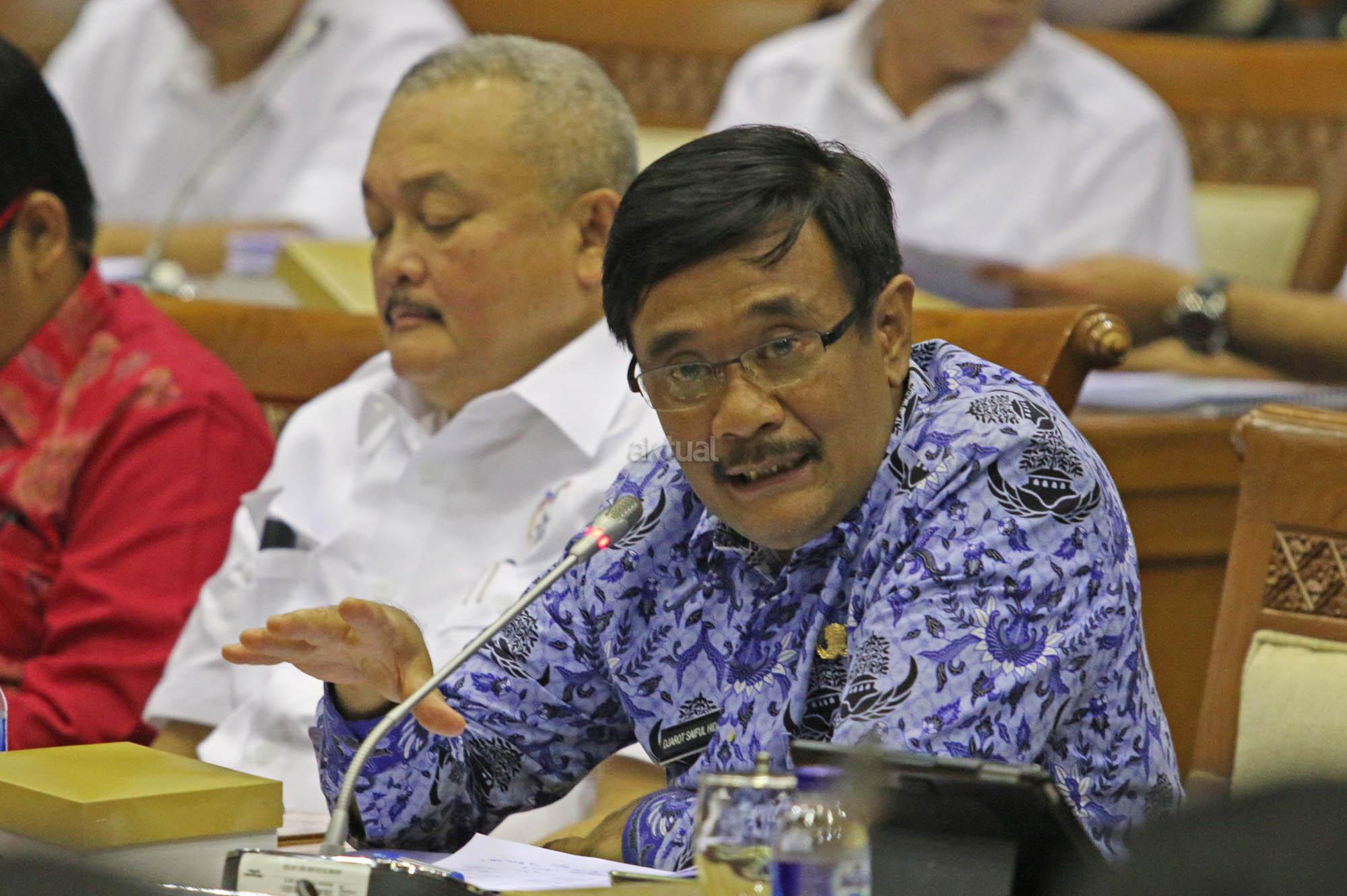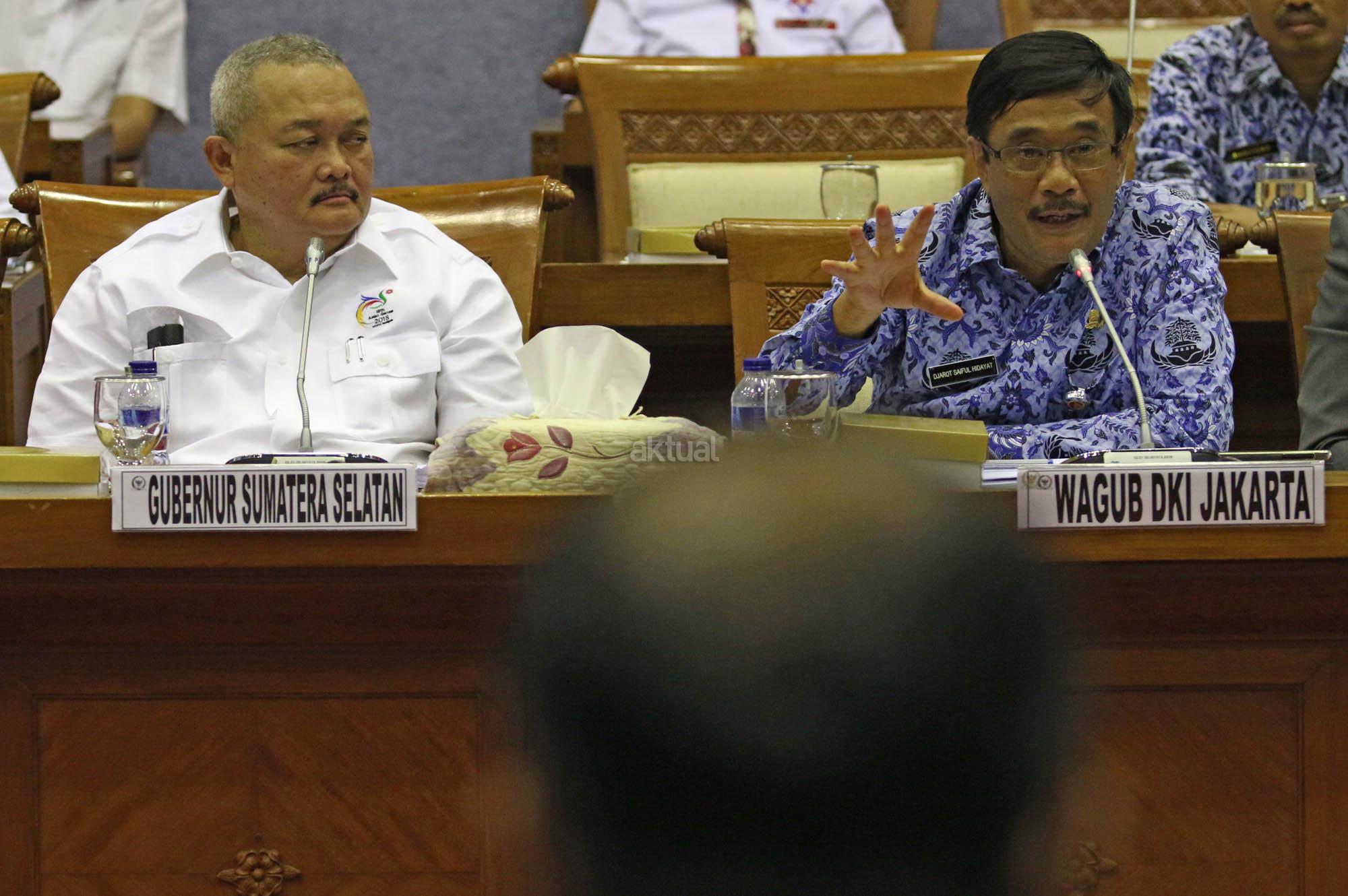 Wakil Gubernur DKI Jakarta Djarot Syaiful Hidayat (kanan) bersama Gubernur Sumatera Selatan Alex Noerdin mengikuti Rapat Dengar Pendapat (RDP) dengan Komisi X DPR di Kompleks Parlemen Senayan, Jakarta, Senin (25/4). Rapat tersebut membahas Kesiapan Pemda DKI Jakarta dan Pemda Sumatera Barat sebagai tuan rumah penyelenggaran Asian Games XVIII tahun 2018. Dan penjelasan sumber anggaran Asian Games XVIII dari APBD dan APBN. FOTO: AKTUAL/JUNAIDI MAHBUB