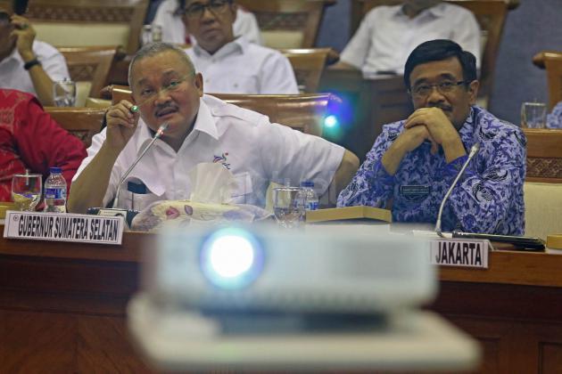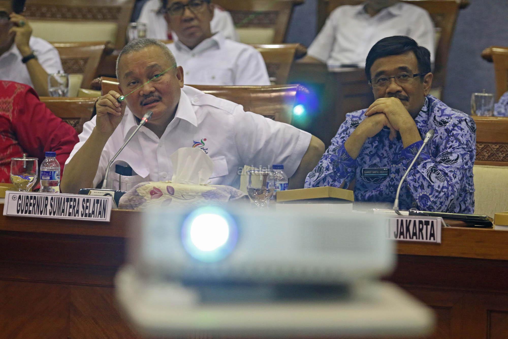 Gubernur Sumatera Selatan Alex Noerdin (kiri) bersama Wakil Gubernur DKI Jakarta Djarot Syaiful Hidayat (kedua kiri) mengikuti Rapat Dengar Pendapat (RDP) dengan Komisi X DPR di Kompleks Parlemen Senayan, Jakarta, Senin (25/4). Rapat tersebut membahas Kesiapan Pemda DKI Jakarta dan Pemda Sumatera Barat sebagai tuan rumah penyelenggaran Asian Games XVIII tahun 2018. Dan penjelasan sumber anggaran Asian Games XVIII dari APBD dan APBN. FOTO: AKTUAL/JUNAIDI MAHBUB