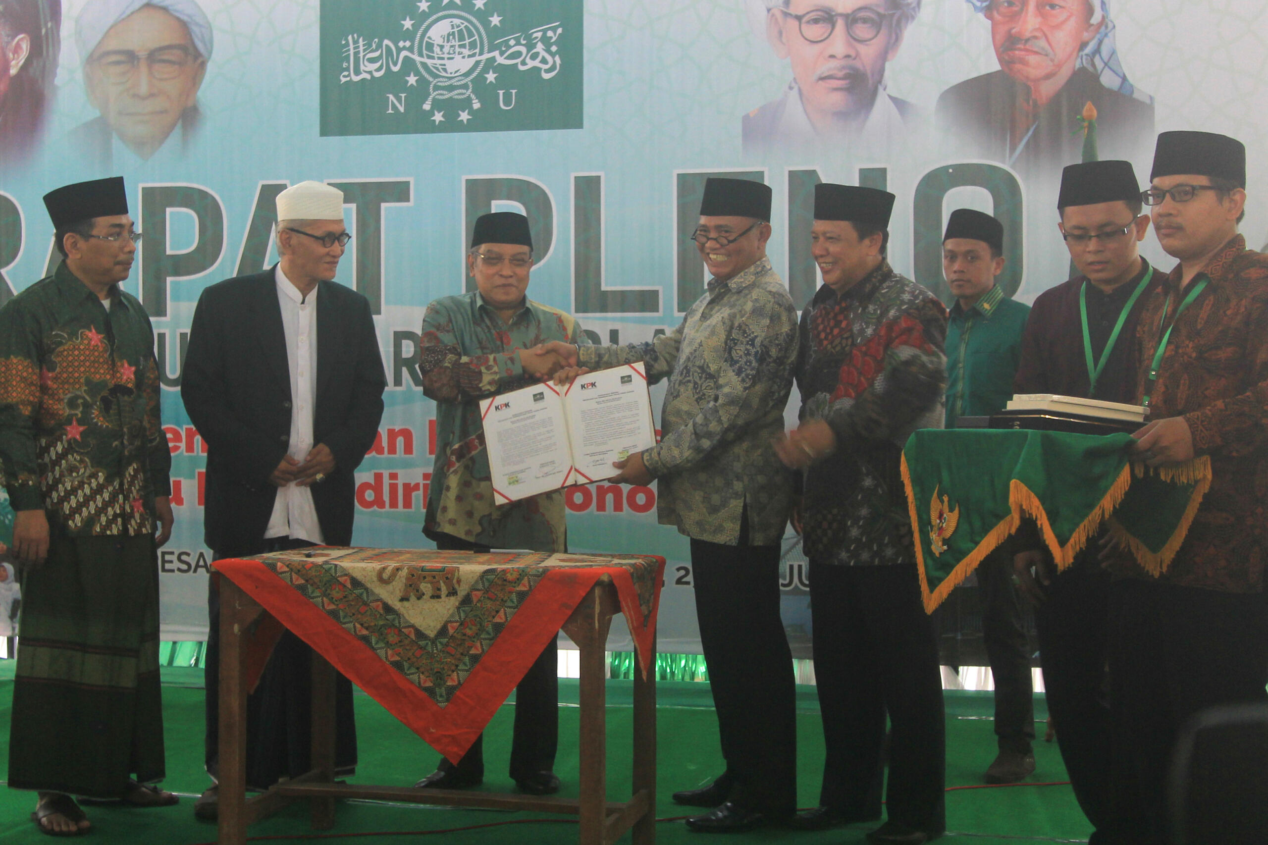 Ketua Umum PBNU KH Said Aqil Siradj (ketiga kiri) bersalaman dengan Ketua KPK Agus Agus Rahardjo (keempat kiri) seusai penandatanganan MoU saat pembukaan Rapat Pleno PBNU di Pondok Pesantren Kempek, Cirebon, Jawa Barat, Minggu (24/7). Rapat Pleno bertema Menguatkan Islam Nusantara Menuju Kemandirian Ekonomi Warga tersebut berlangsung hingga 25 Juli 2016. ANTARA FOTO/Dedhez Anggara/kye/16.