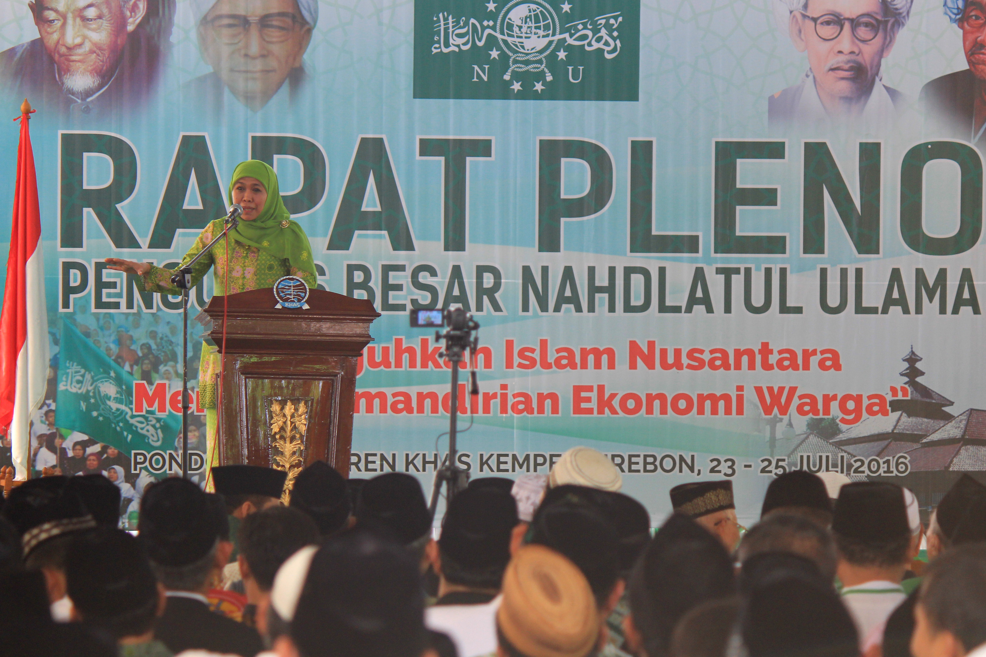 Menteri Sosial Khofifah Indar Parawansa menyampaikan paparan saat menghadiri Rapat Pleno PBNU di Ponpes Kempek, Cirebon, Jawa Barat, Minggu (24/7). Dalam Kunjungannya Mensos meminta PBNU untuk mendukung program E-Warung yang diharapkan mampu meningkatkan perekonomian masyarakat. ANTARA FOTO/Dedhez Anggara/kye/16.
