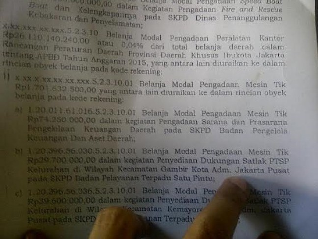f) 1.02.053.09.001.5.2.3.10.01 Belanja modal pengadaan mesin tik Rp 39.600.000,00 dalam kegiatan pemeliharaan sarana dan prasarana, kantor dan pengadaan barang jasa pada SKPD BLUD Puskesmas KecM Makasar-Jaktim,” begitu bunyi poin-poin anggaran mesin tik yang tercantum dalam draft RAPBD 2015 versi Ahok.