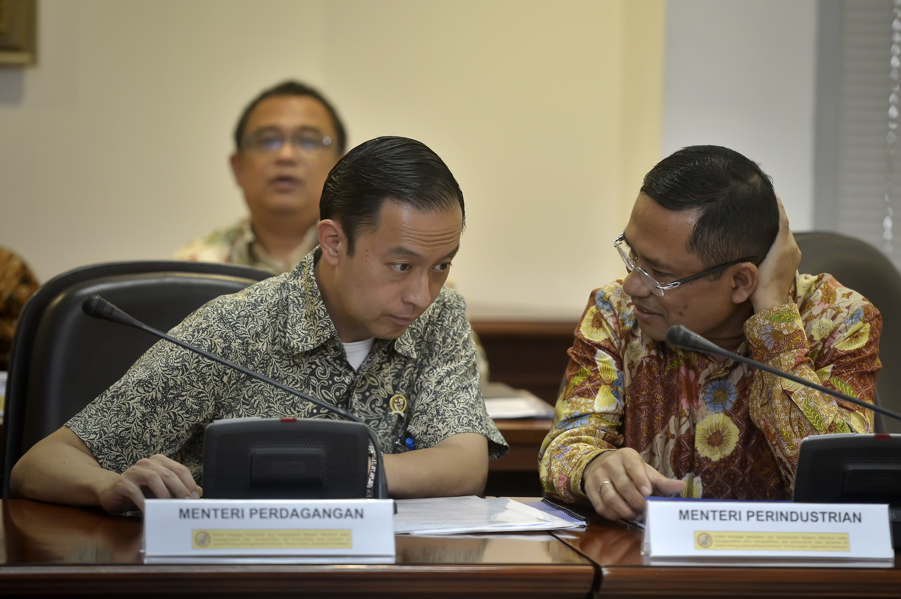 Mendag Thomas Lembong (kiri) berdiskusi dengan Menperin Saleh Husin (kanan) saat mengikuti Rapat Terbatas Kabinet yang dipimpin Presiden Joko Widodo membahas kerangka kerja konvensi tentang pengendalian tembakau, Jakarta, Selasa (14/6). Presiden menegaskan, pengendalian komoditas tembakau harus mengutamakan kepentingan nasional, yaitu kesehatan masyarakat terutama anak-anak, industri tembakau, serta dampak bagi petani tembakau. ANTARA FOTO/Yudhi Mahatma/foc/16.