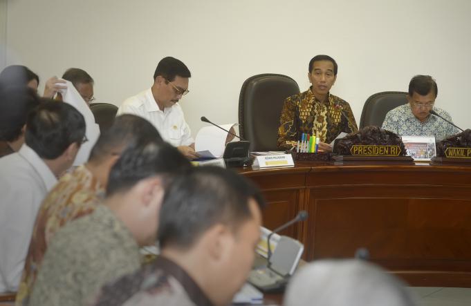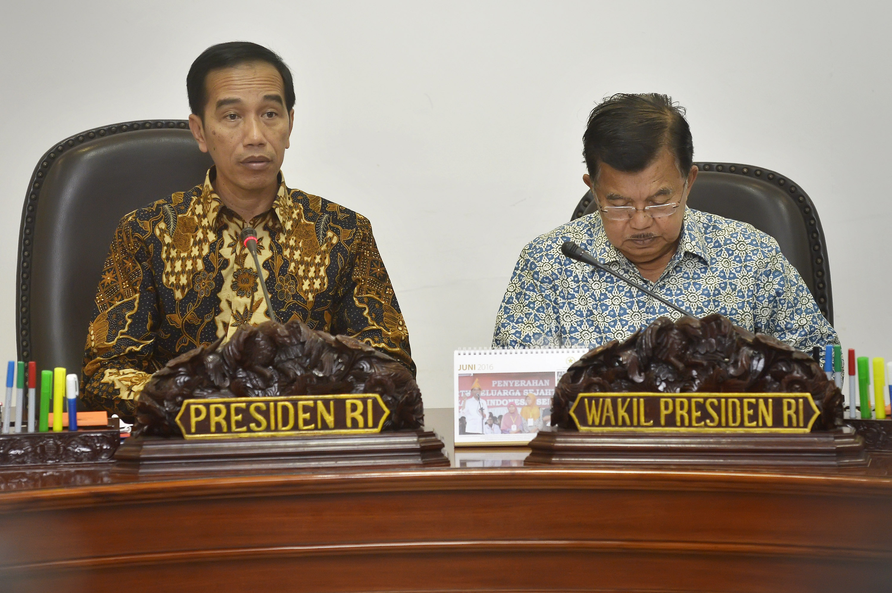 Presiden Joko Widodo (kiri) didampingi Wapres Jusuf Kalla (kanan) memimpin Rapat Terbatas Kabinet membahas kerangka kerja konvensi tentang pengendalian tembakau, Jakarta, Selasa (14/6). Presiden menegaskan, pengendalian komoditas tembakau harus mengutamakan kepentingan nasional, yaitu kesehatan masyarakat terutama anak-anak, industri tembakau, serta dampak bagi petani tembakau. ANTARA FOTO/Yudhi Mahatma/foc/16.