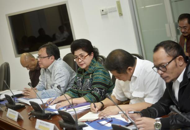 Menkes Nila F Moeloek (tengah, bersama Menakertrans Hanif Dakiri (kanan), Menkominfo Rudiantara (kedua kanan) mengikuti Rapat Terbatas Kabinet yang dipimpin Presiden Joko Widodo membahas kerangka kerja konvensi tentang pengendalian tembakau, Jakarta, Selasa (14/6). Presiden menegaskan, pengendalian komoditas tembakau harus mengutamakan kepentingan nasional, yaitu kesehatan masyarakat terutama anak-anak, industri tembakau, serta dampak bagi petani tembakau. ANTARA FOTO/Yudhi Mahatma/foc/16.