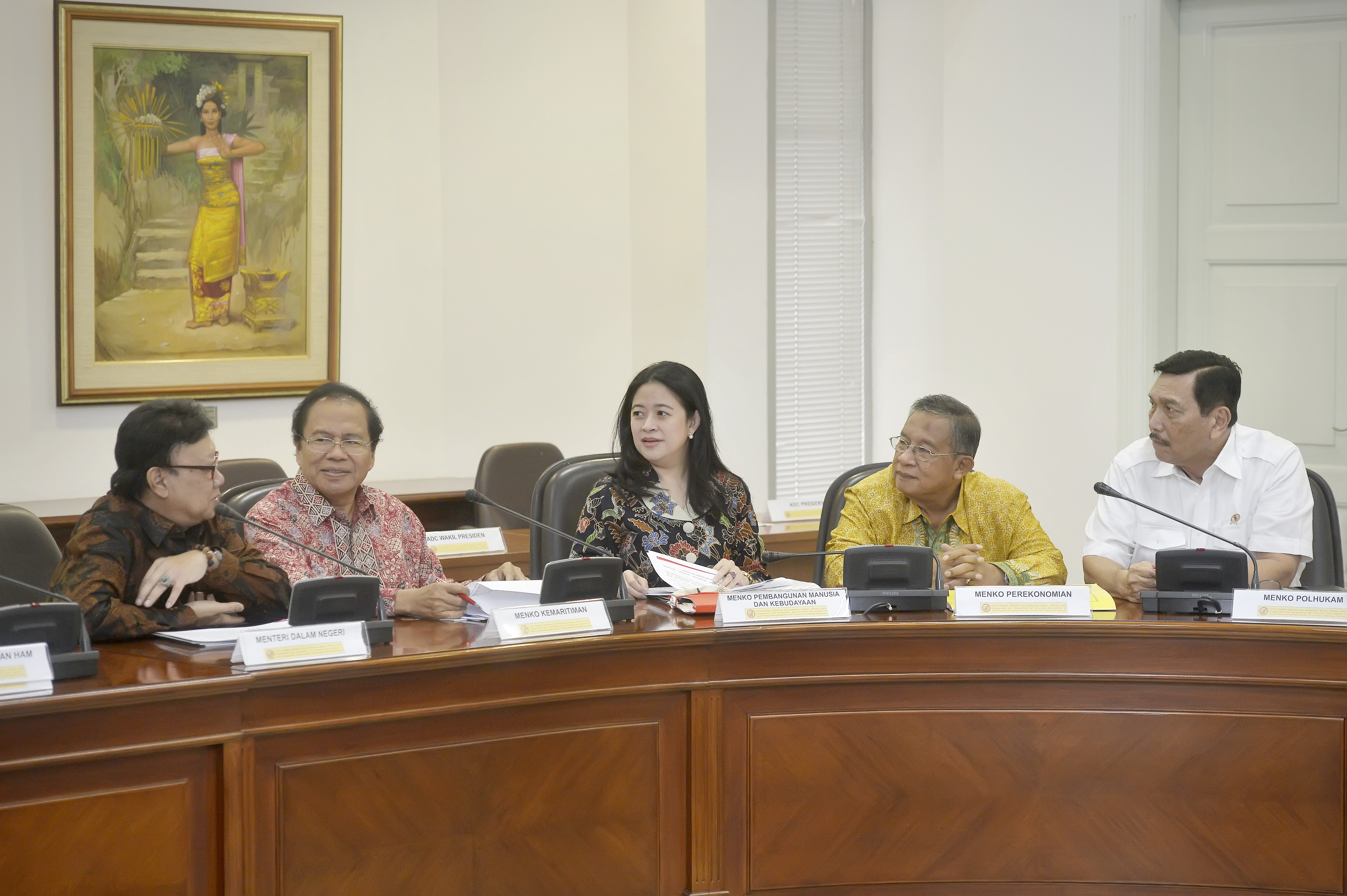 Menko Polhukam Luhut Binsar Pandjaitan (kanan) berdiskusi dengan Menko Perekonomian Darmin Nasution (kedua kanan), Menko PMK Puan Maharani (tengah), Menko Maritim dan Sumber Daya Rizal Ramli (kedua kiri) serta Mendagri Tjahjo Kumolo (kiri) saat mengikuti Rapat Terbatas Kabinet yang dipimpin Presiden Joko Widodo membahas kerangka kerja konvensi tentang pengendalian tembakau, Jakarta, Selasa (14/6). Presiden menegaskan, pengendalian komoditas tembakau harus mengutamakan kepentingan nasional, yaitu kesehatan masyarakat terutama anak-anak, industri tembakau, serta dampak bagi petani tembakau. ANTARA FOTO/Yudhi Mahatma/foc/16.