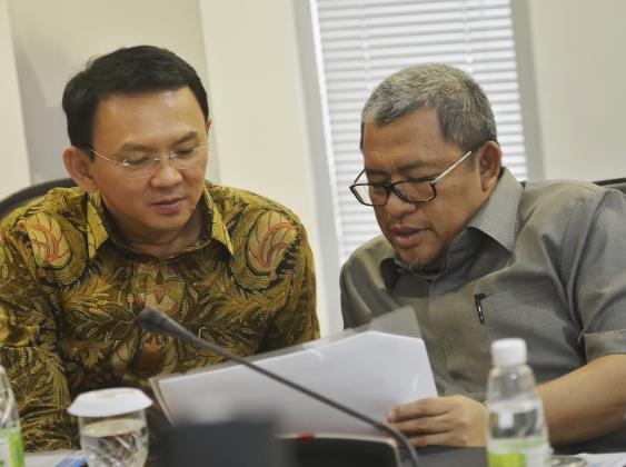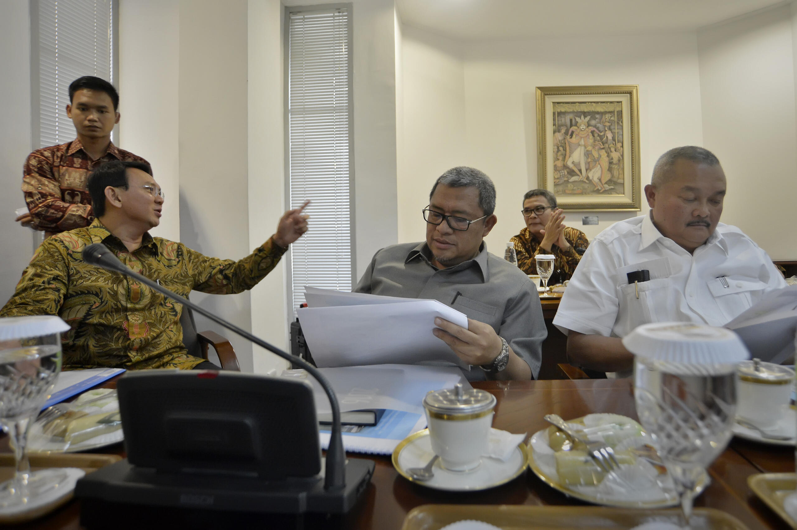 Gubernur DKI Basuki Tjahaja Purnama (kiri) berdiskusi dengan Gubernur Jabar Ahmad Heryawan (kanan) saat mengikuti Rapat Terbatas membahas Percepatan Proyek Light Rail Transit (LRT) di Kantor Presiden, Jakarta, Selasa (29/3). Presiden menargetkan LRT yang dibangun di Jakarta, Palembang, dan Bandung Raya itu selesai secepatnya dengan menginstruksikan para kepala daerah mendorong percepatan itu, secara khusus Presiden menyoroti pembangunan LRT jalur ke Bandara Internasional Soekarno-Hatta dari Jakarta yang belum dimulai. ANTARA FOTO/Yudhi Mahatma/pd/16
