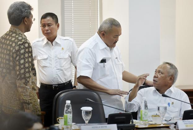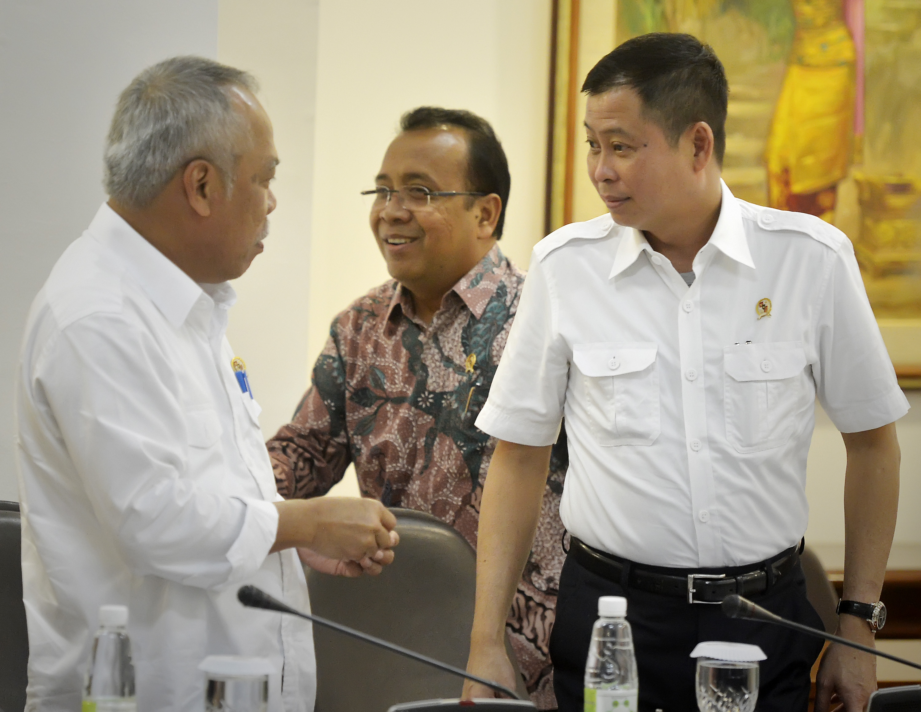Menteri PU dan Perumahan Rakyat Basuki Hadimuljono (kiri) berdiskusi dengan Menhub Ignasius Jonan (kanan) serta Mensesneg Pratikno (tengah) saat mengikuti Rapat Terbatas membahas Percepatan Proyek Light Rail Transit (LRT) di Kantor Presiden, Jakarta, Selasa (29/3). Presiden menargetkan LRT yang dibangun di Jakarta, Palembang, dan Bandung Raya itu selesai secepatnya dengan menginstruksikan para kepala daerah mendorong percepatan itu, secara khusus Presiden menyoroti pembangunan LRT jalur ke Bandara Internasional Soekarno-Hatta dari Jakarta yang belum dimulai. ANTARA FOTO/Yudhi Mahatma/pd/16