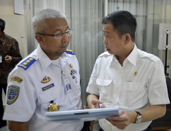 Menhub Ignasius Jonan (kanan) berdiskusi dengan Direktur Prasarana Perkeretaapian Kemenhub Prasetyo Boeditjahjono (kiri) saat mengikuti Rapat Terbatas membahas Percepatan Proyek Light Rail Transit (LRT) di Kantor Presiden, Jakarta, Selasa (29/3). Presiden menargetkan LRT yang dibangun di Jakarta, Palembang, dan Bandung Raya itu selesai secepatnya dengan menginstruksikan para kepala daerah mendorong percepatan itu, secara khusus Presiden menyoroti pembangunan LRT jalur ke Bandara Internasional Soekarno-Hatta dari Jakarta yang belum dimulai. ANTARA FOTO/Yudhi Mahatma/pd/16