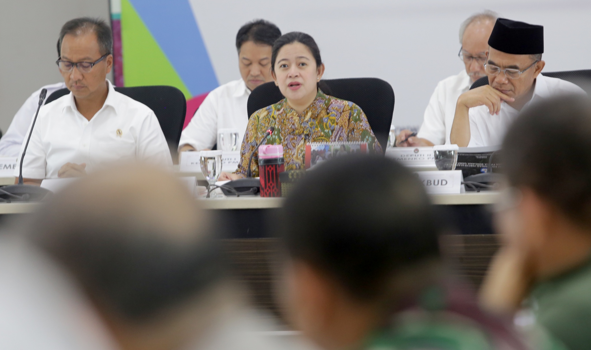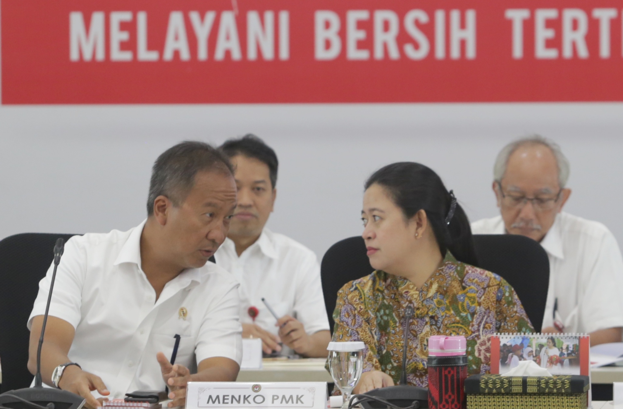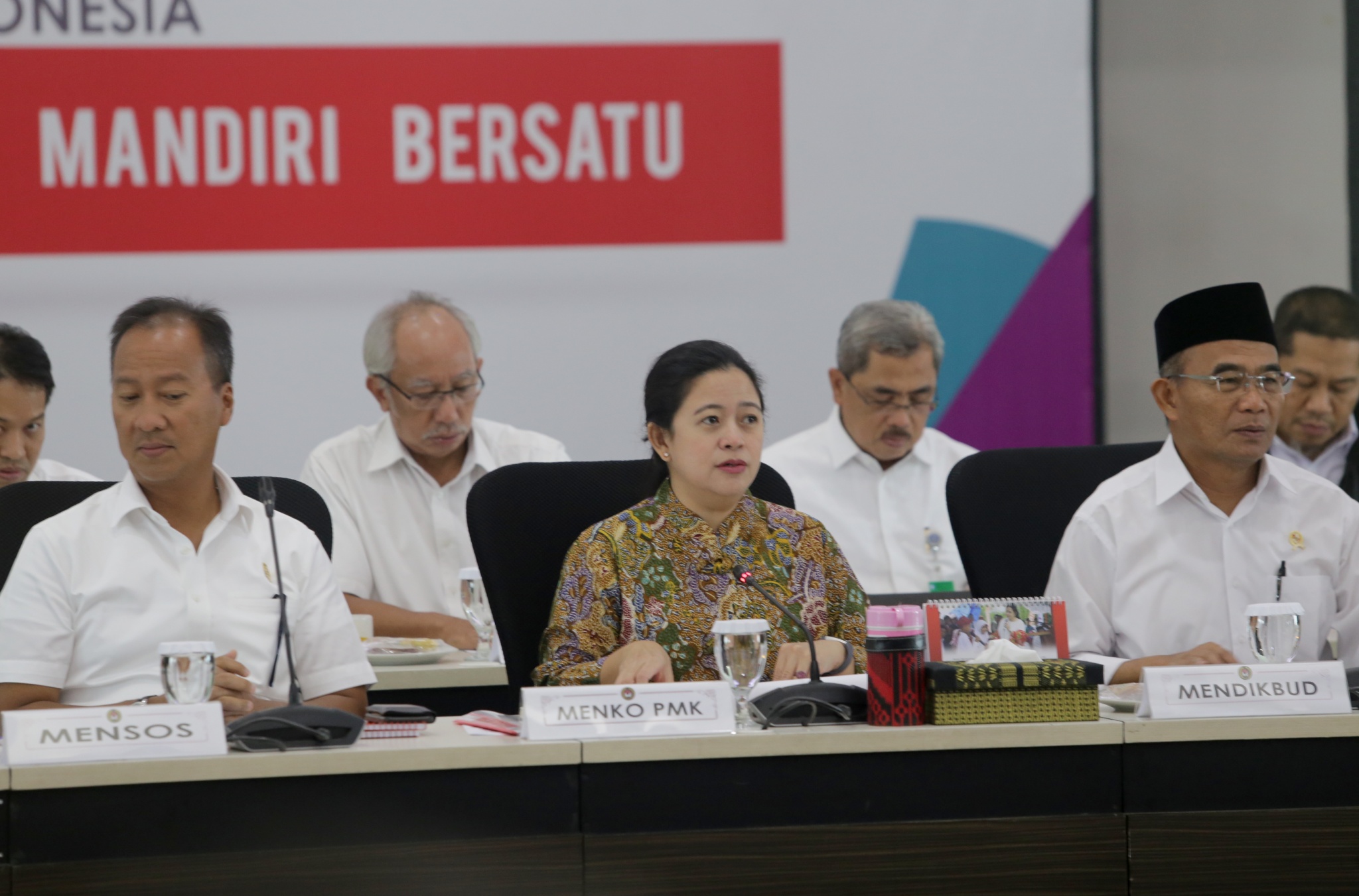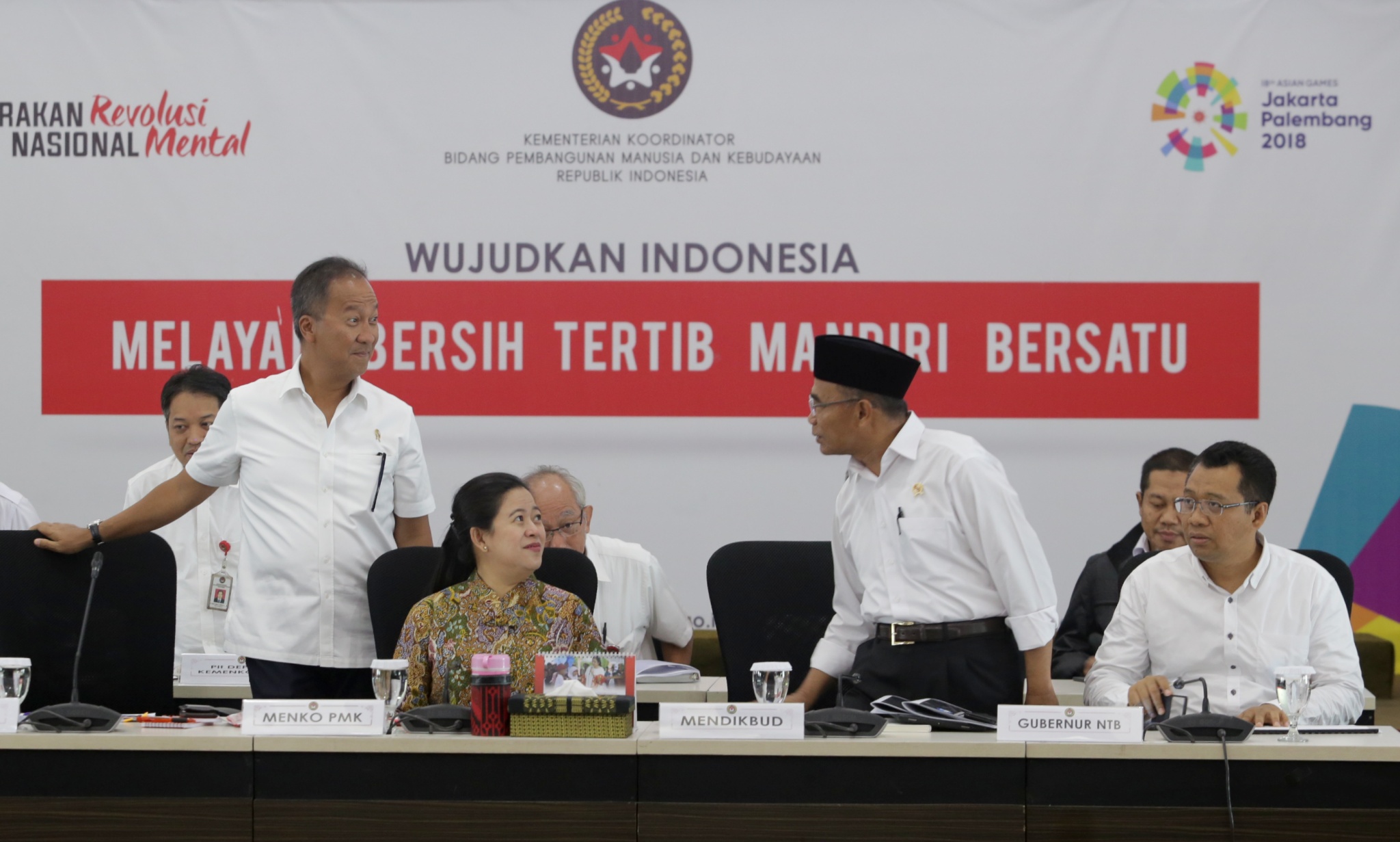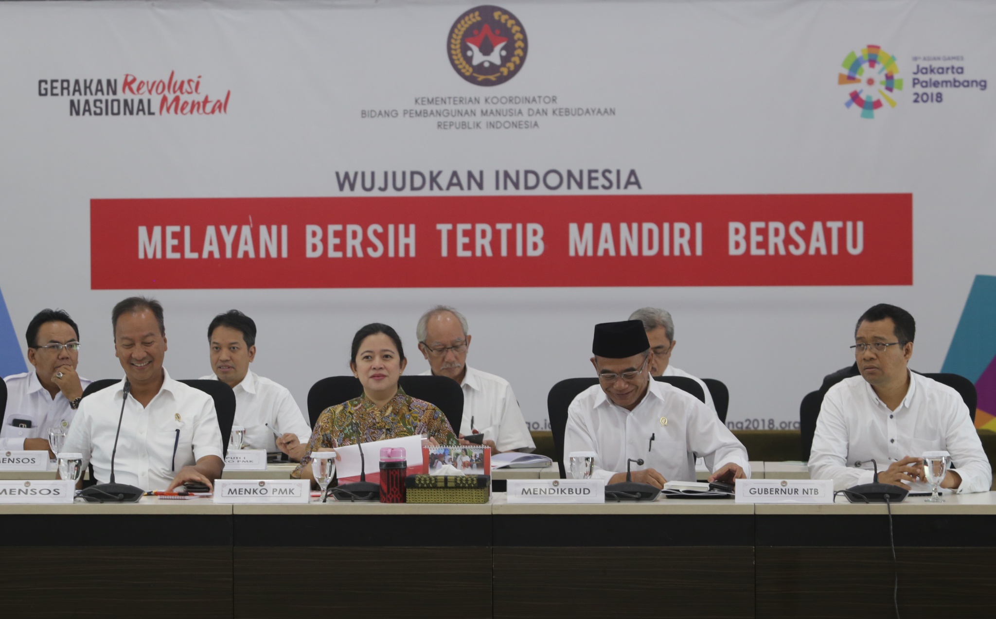 Menko PMK Puan Maharani didampingi Mensos Agus Gumiwang, Mendikbud Muhadjir Effendy dan Gubernur NTB Zulkieflimansyah saat rapat tingkat menteri di kantor Kemenko PMK, Jakarta, Senin (12/11/2018). Rapat tersebut membahas soal Percepatan Pemulihan Pasca Bencana Gempa Bumi Prov. NTB serta Evaluasi Sosialisasi Penyaluran Bantuan dan Jaminan Sosial (KIP,KIS, PKH dan Bansos Pangan). AKTUAL/Tino Oktaviano