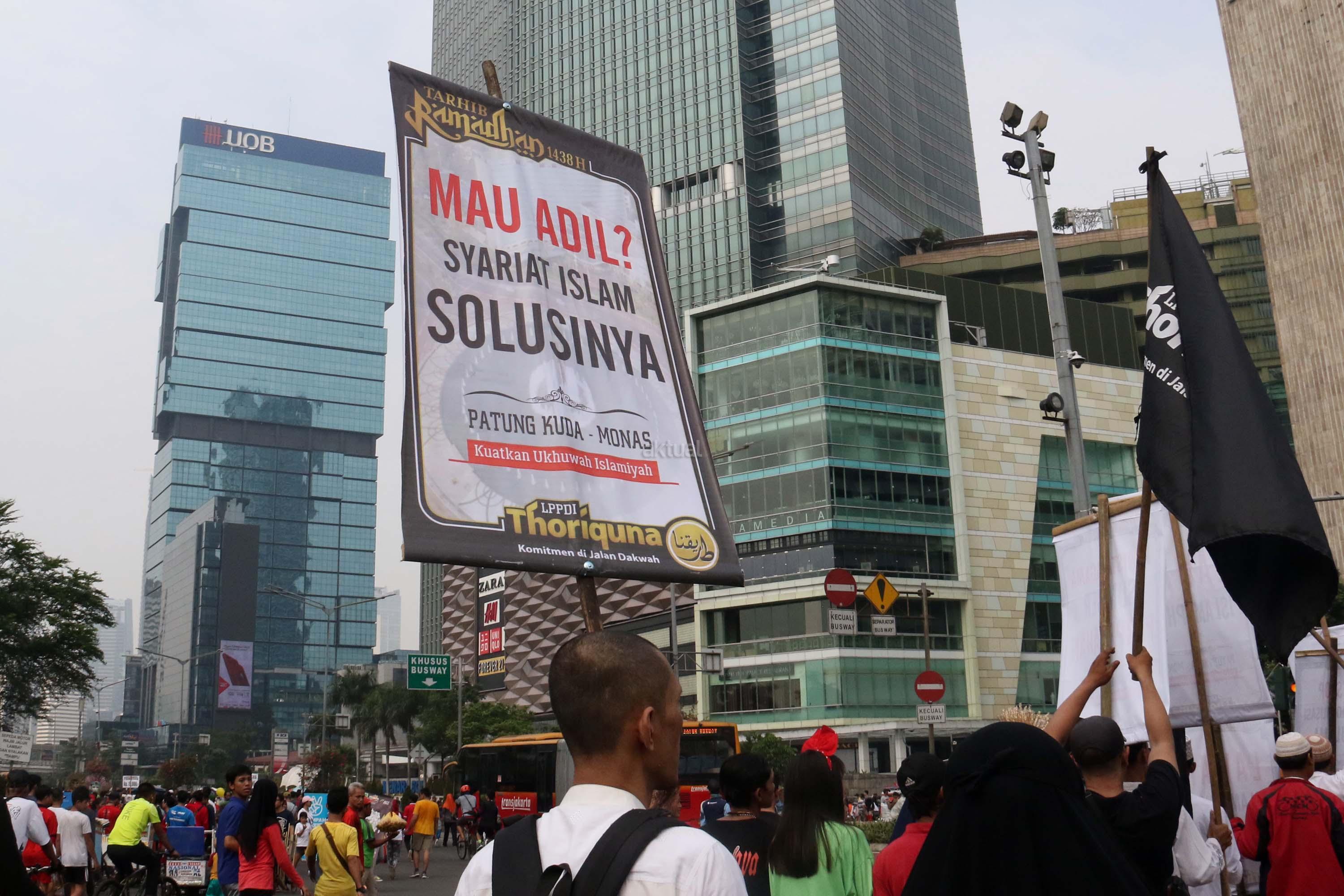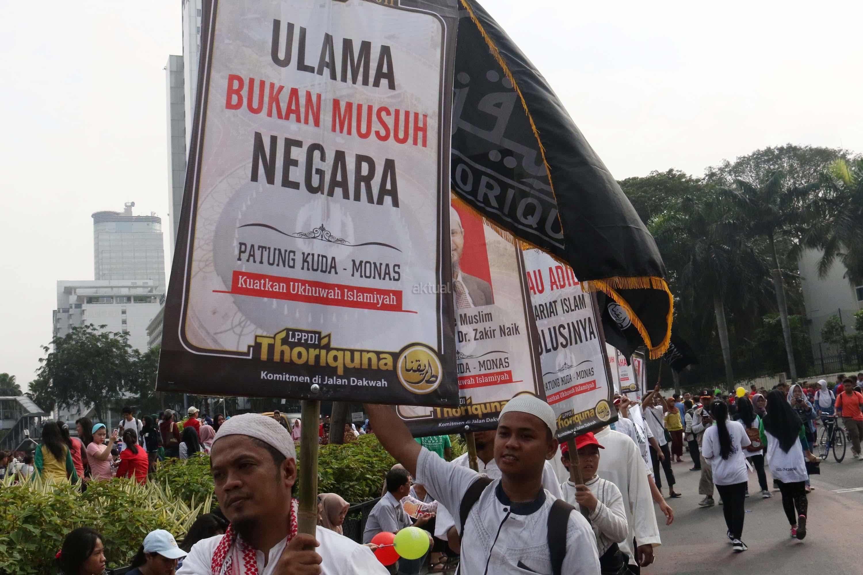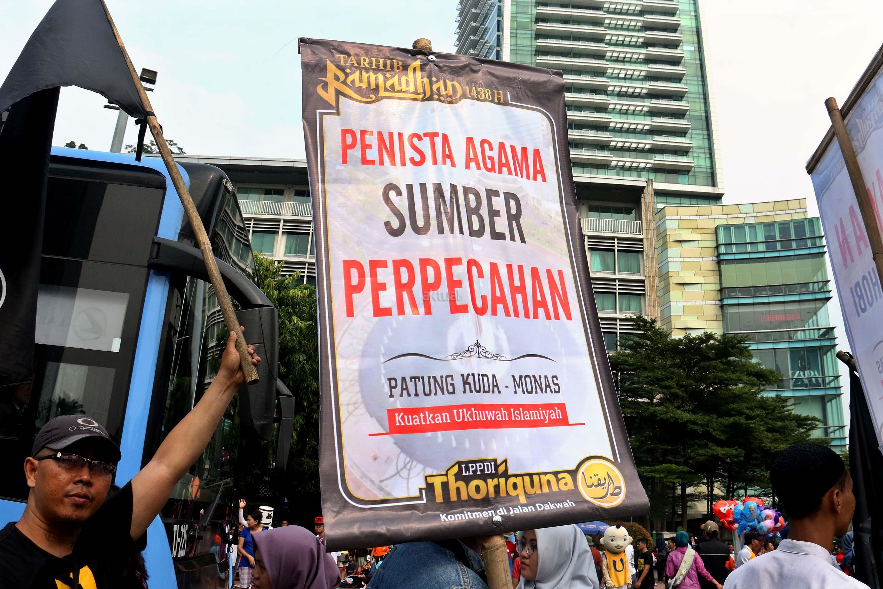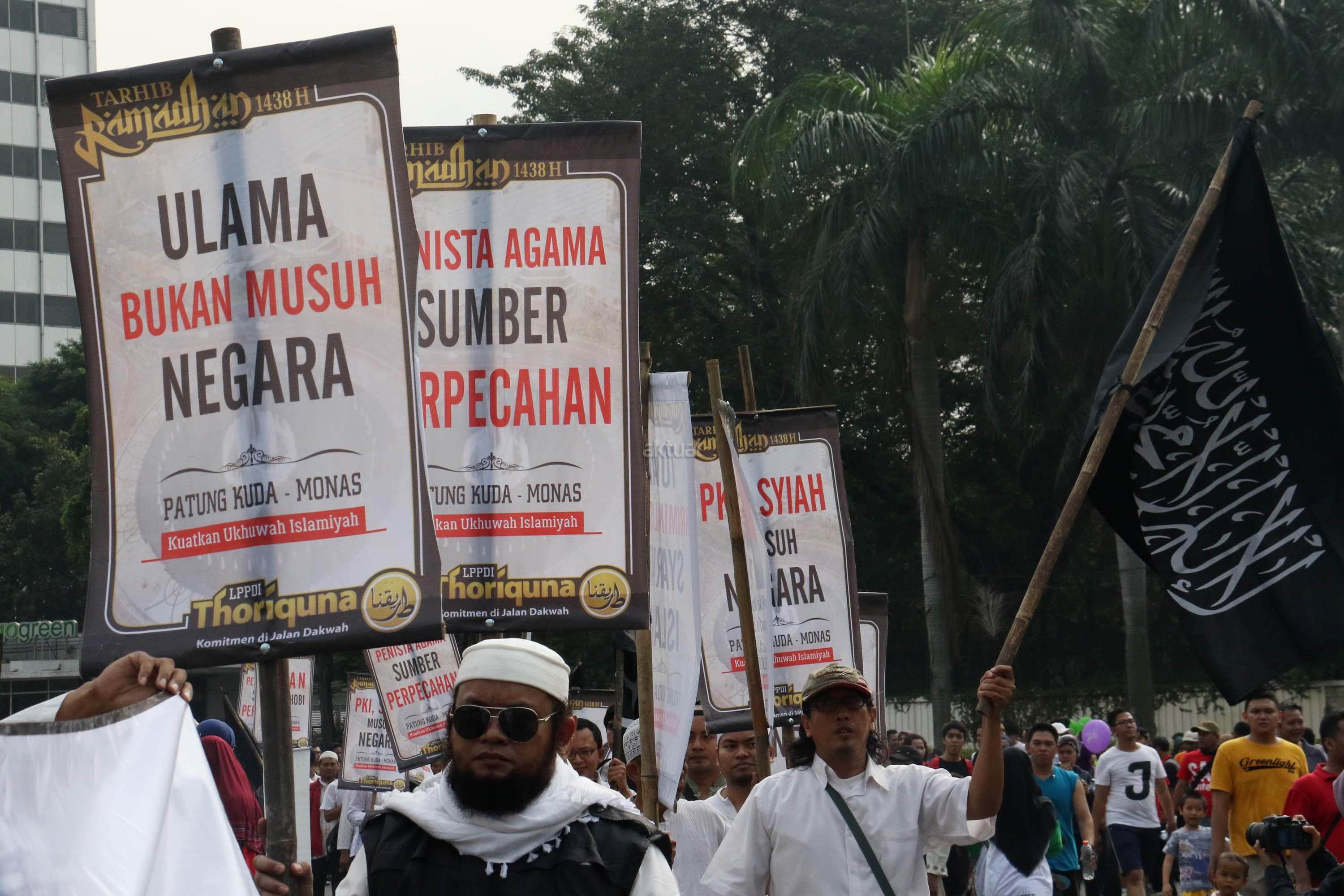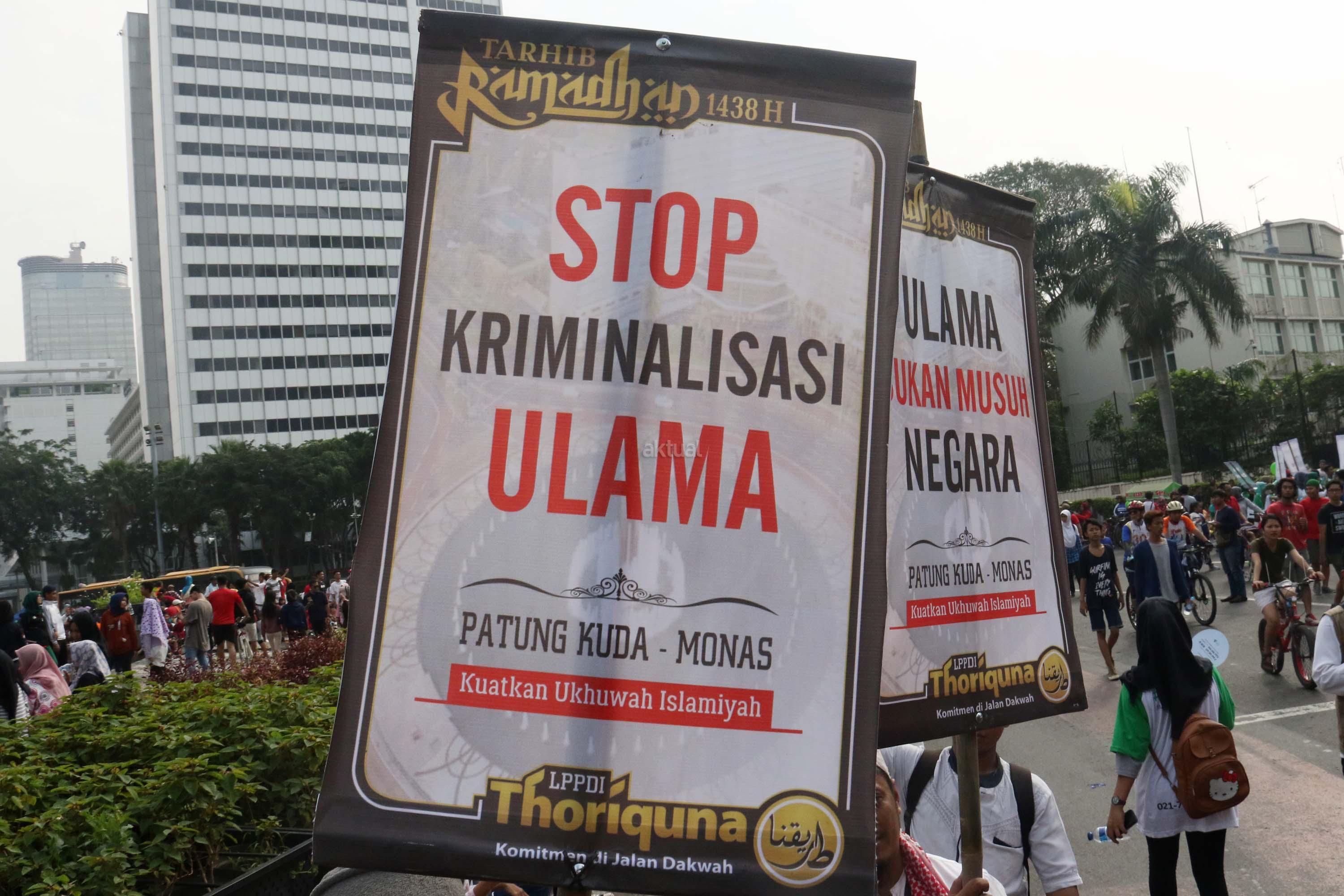 Ratusan masa yang tergabung dalam LPPDI Thoriquna menggelar Tarhib Ramadhan di area Car Free Day, Jakarta, Minggu (21/6/2017). Dalam aksi Tarhib Ramadhan LPPDI Thoriquna meminta kepada pemerintah menjauhi sikap Islamophobia, jangan menganggap Islam itu buruk, terutama juga kepada Ulama dan Stop Demoralisasi Ulama. AKTUAL/Munzir