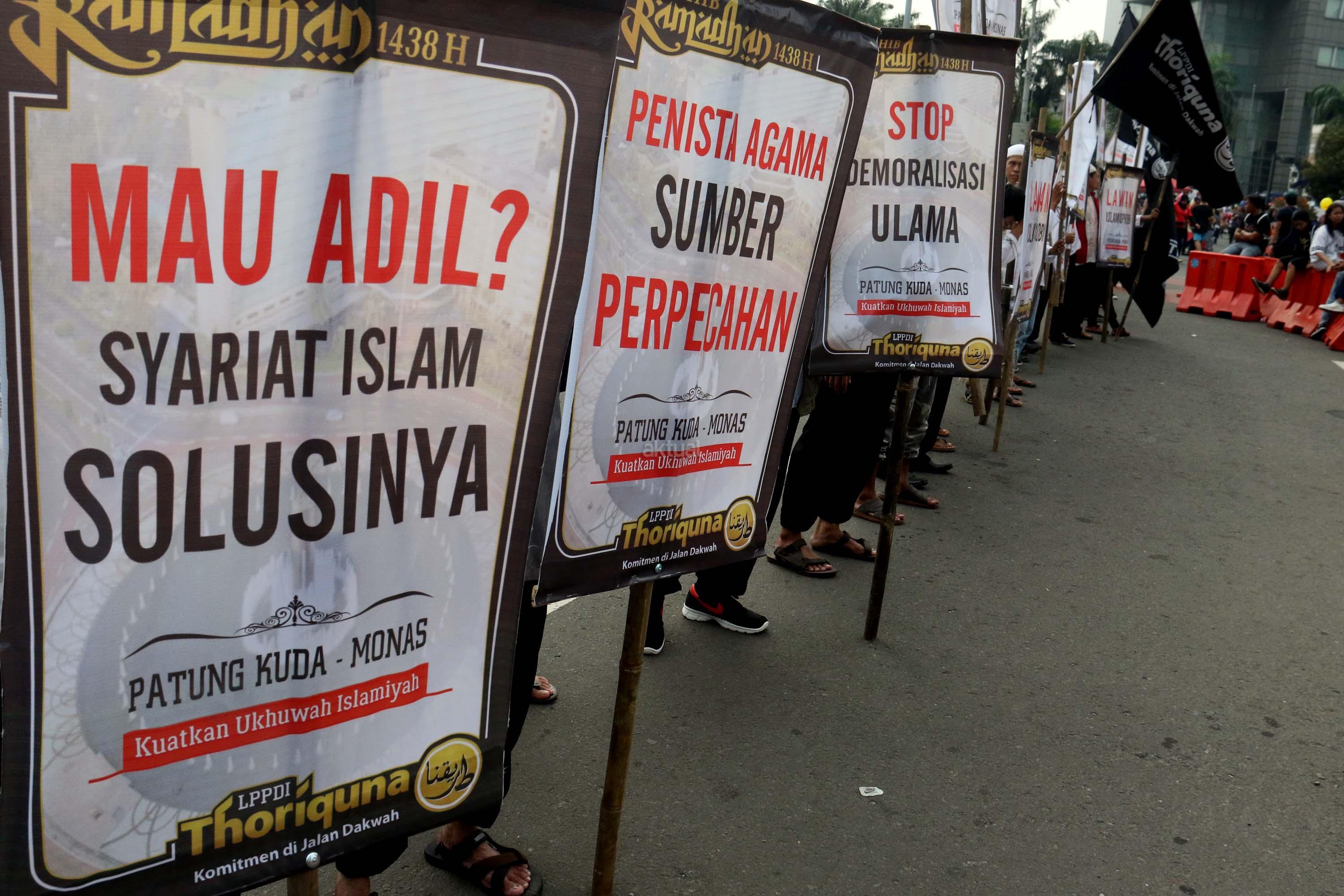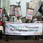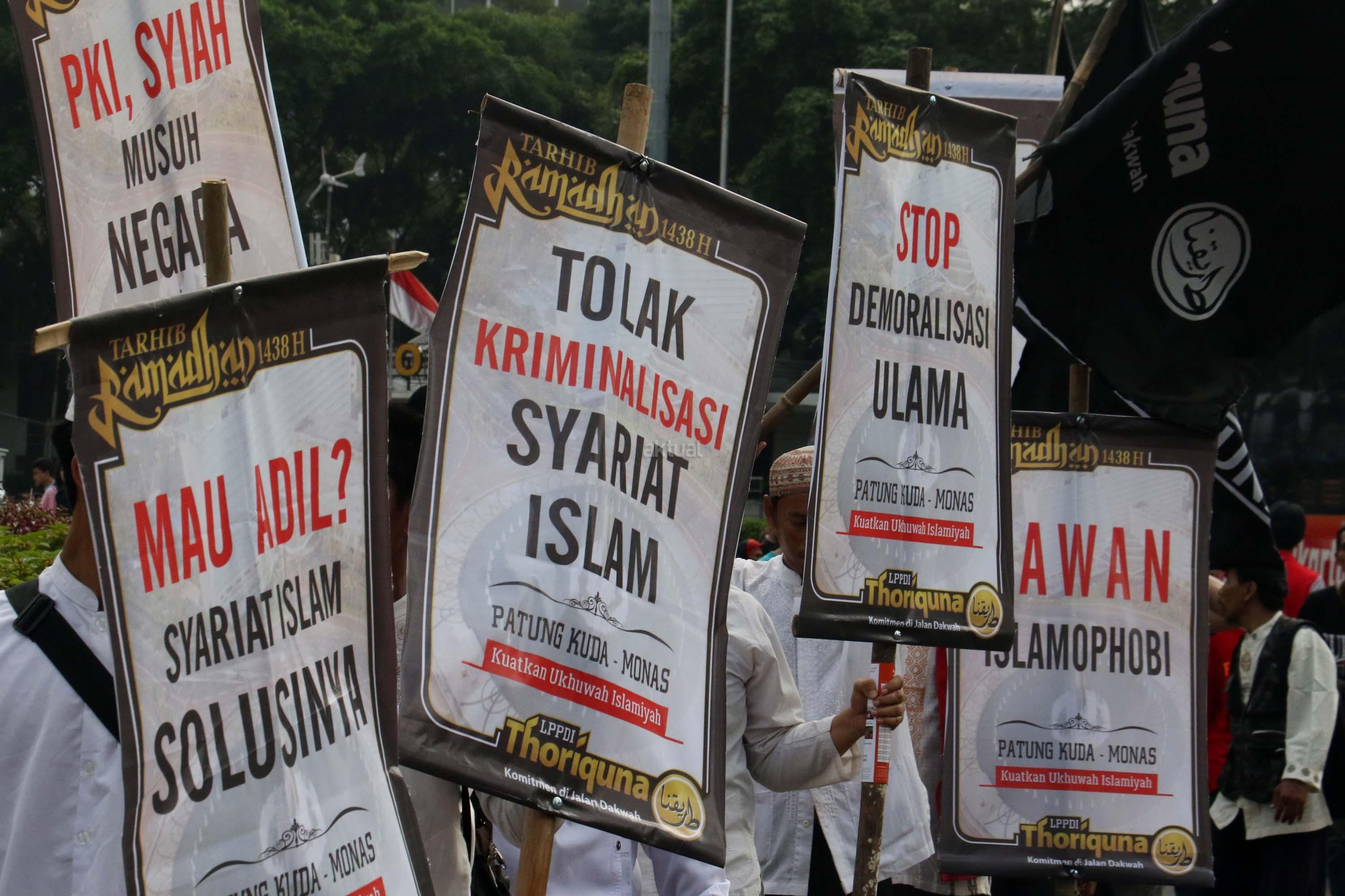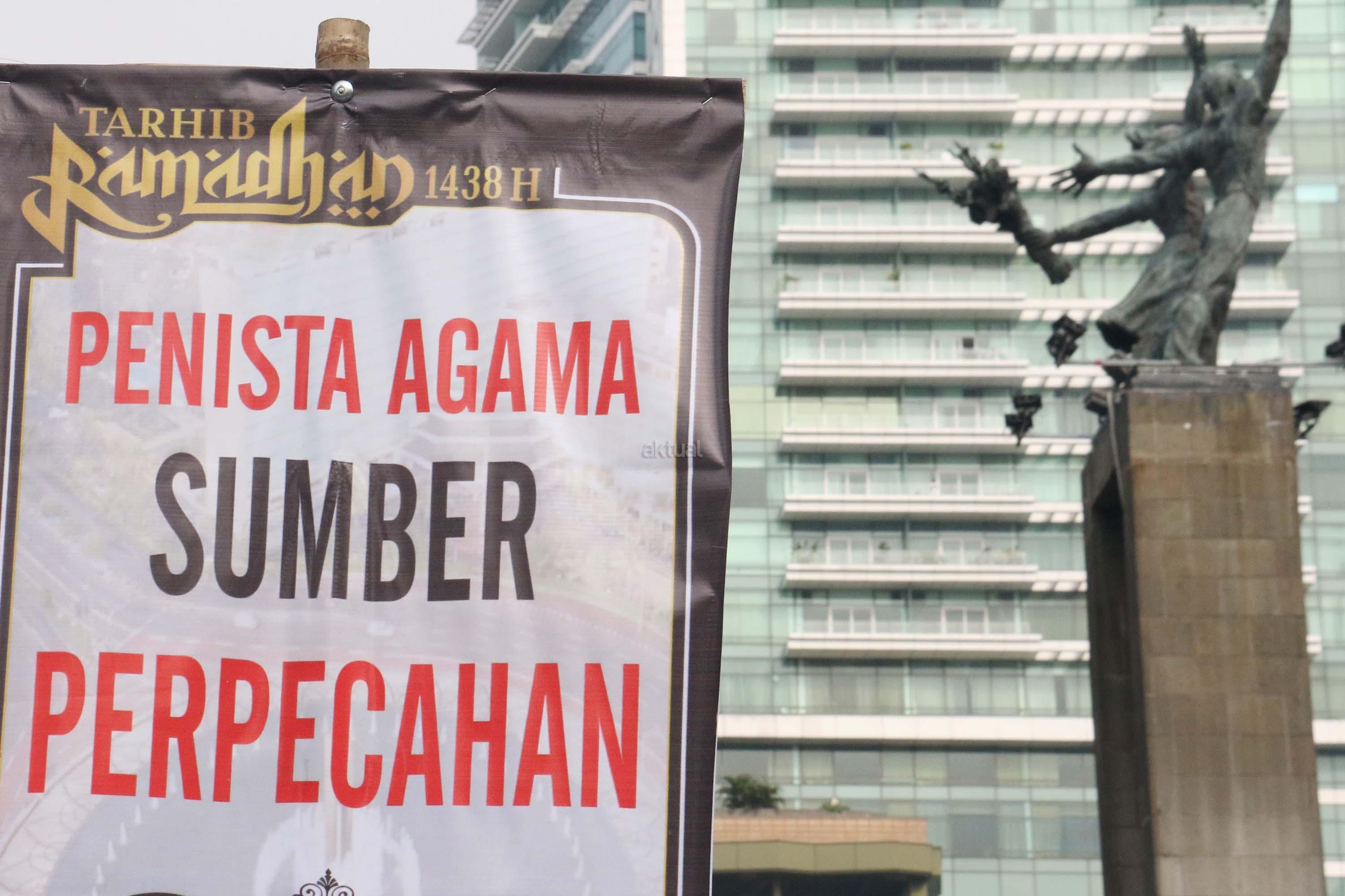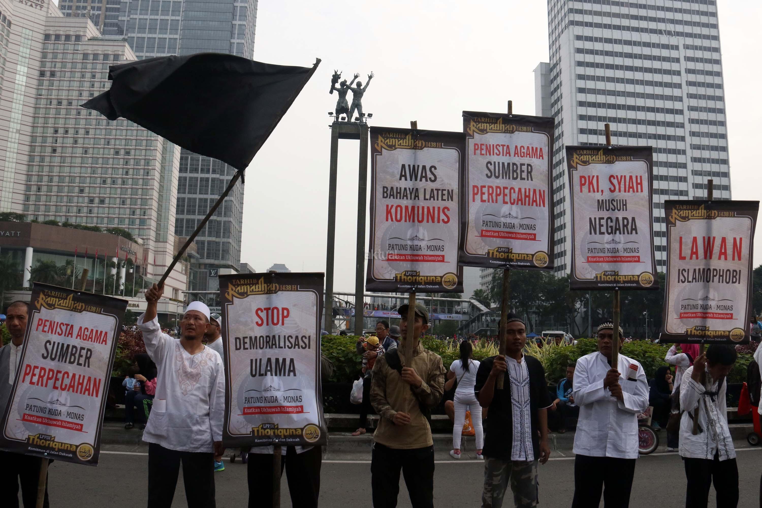 Ratusan masa yang tergabung dalam LPPDI Thoriquna menggelar Tarhib Ramadhan di area Car Free Day, Jakarta, Minggu (21/6/2017). Dalam aksi Tarhib Ramadhan LPPDI Thoriquna meminta kepada pemerintah menjauhi sikap Islamophobia, jangan menganggap Islam itu buruk, terutama juga kepada Ulama dan Stop Demoralisasi Ulama. AKTUAL/Munzir