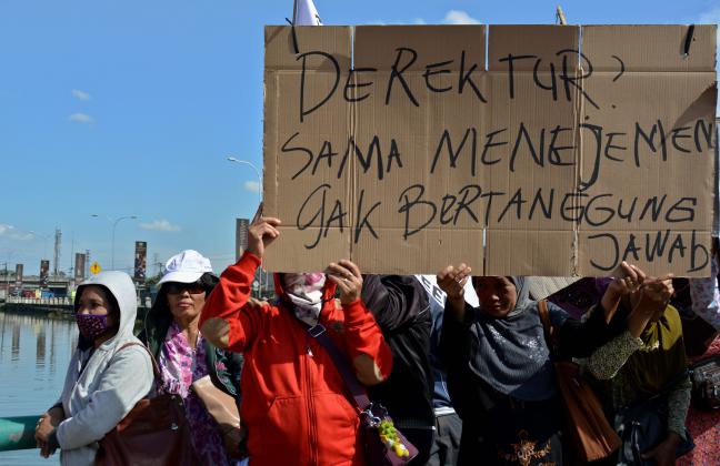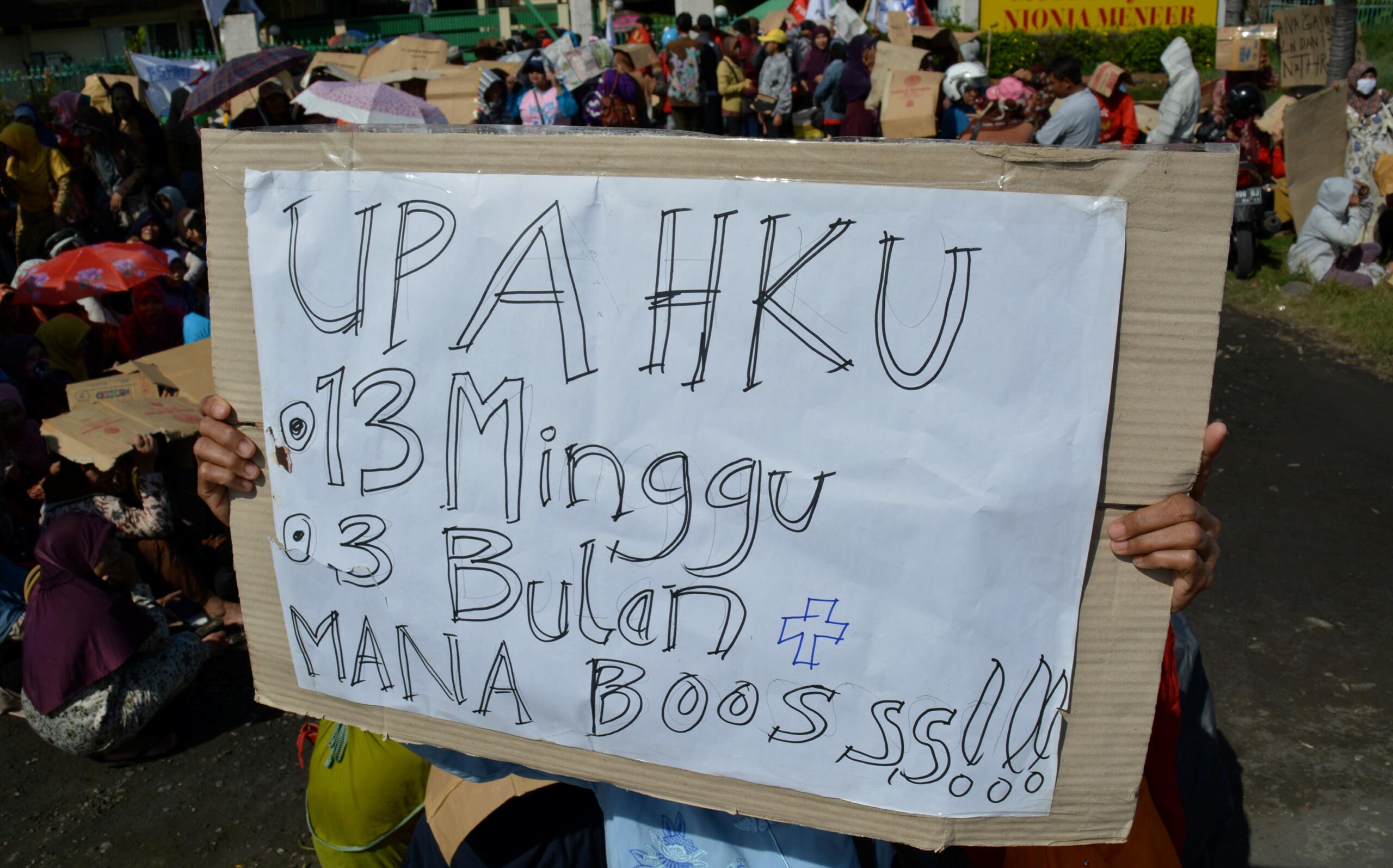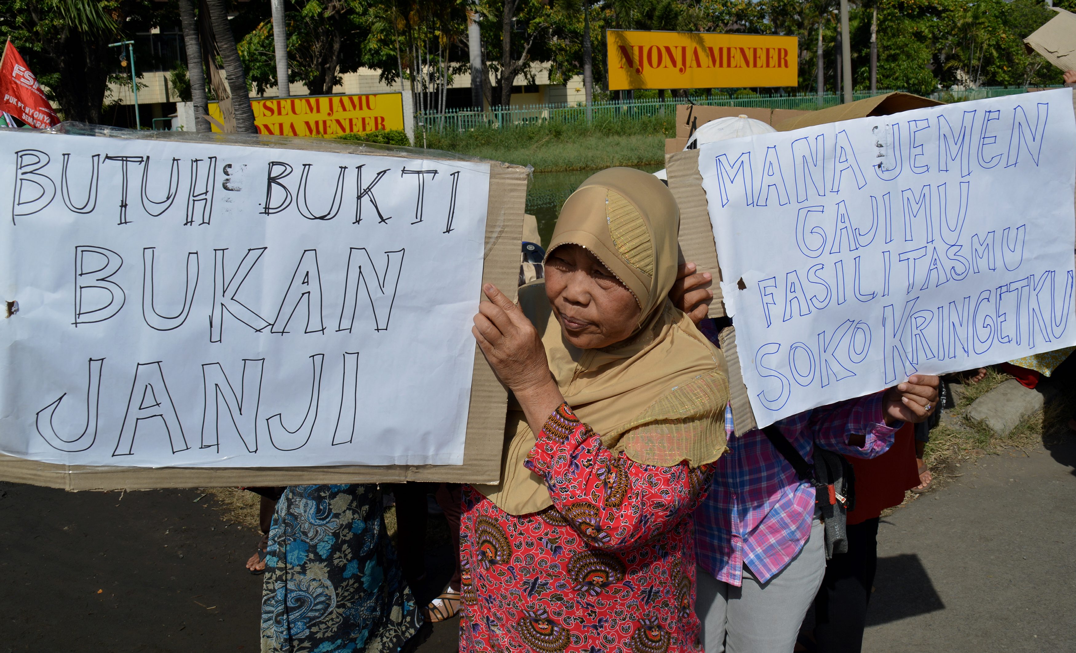 Buruh perusahaan jamu PT Njonja Meneer membawa poster saat berunjuk rasa di depan pabriknya di Semarang, Jateng, Rabu (15/6). Mereka menuntut perusahaan agar segera memberikan upah kepada ratusan karyawannya yang selama tiga bulan lebih belum dibayarkan. ANTARA FOTO/R. Rekotomo/pd/16.